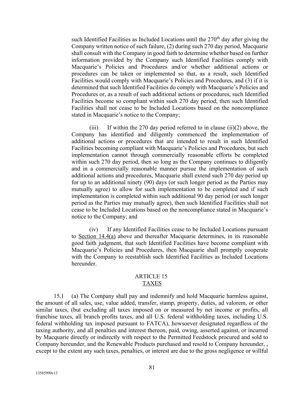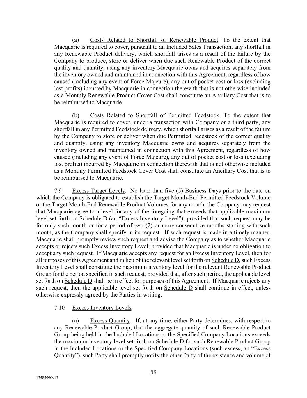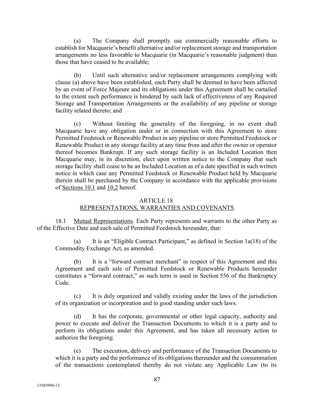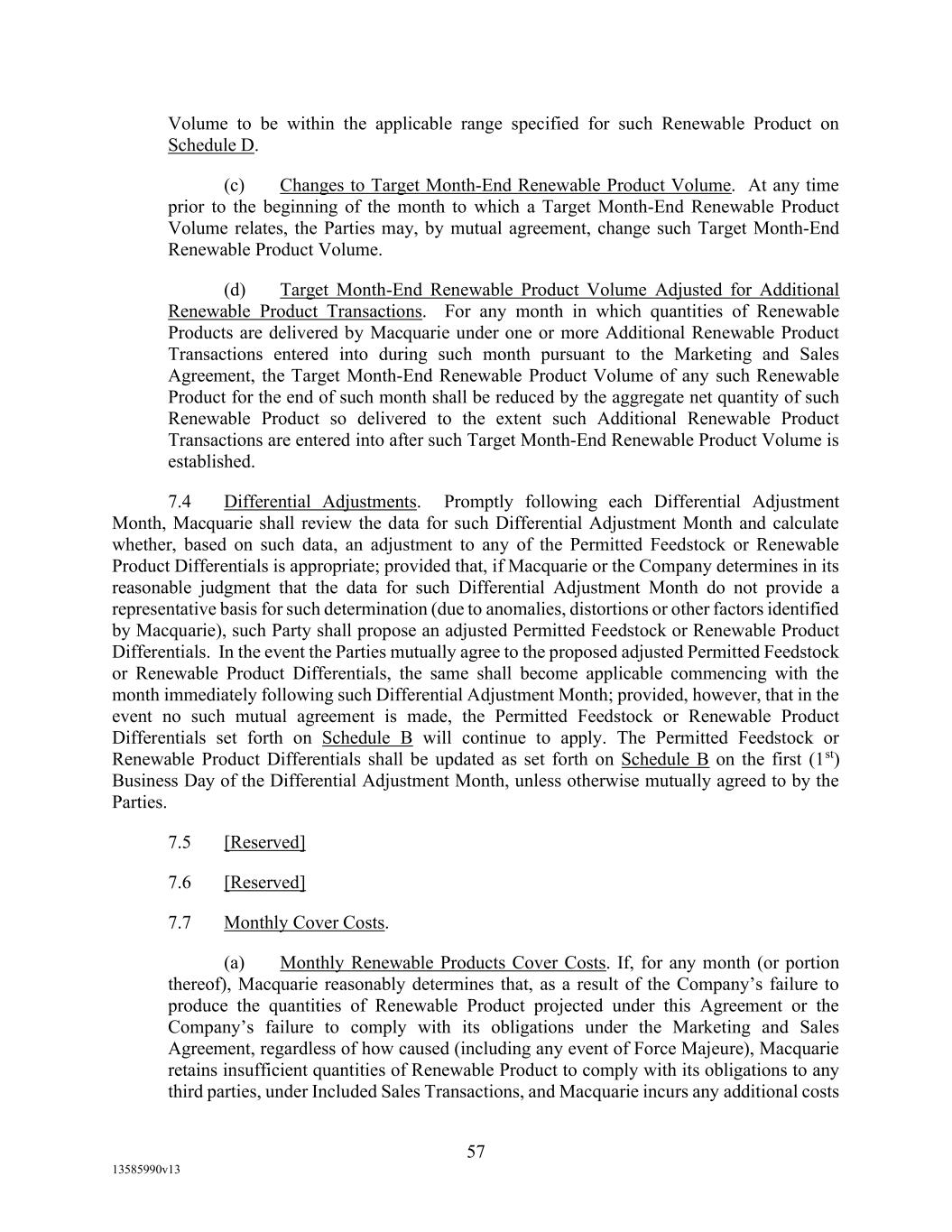 TABLE OF CONTENTS (continued) Page -iii- 4.29 Hedge Agreements ..................................................................................................... 89 5. AFFIRMATIVE COVENANTS. ................................................................................... 89 5.1 Financial Statements, Reports, Certificates ................................................................ 89 5.2 Reporting .................................................................................................................... 90 5.3 Existence .................................................................................................................... 90 5.4 Maintenance of Properties .......................................................................................... 90 5.5 Taxes .......................................................................................................................... 90 5.6 Insurance. ................................................................................................................... 90 5.7 Inspection. .................................................................................................................. 91 5.8 Compliance with Laws ............................................................................................... 92 5.9 Environmental ............................................................................................................ 92 5.10 Disclosure Updates ..................................................................................................... 92 5.11 Formation of Subsidiaries .......................................................................................... 92 5.12 Further Assurances ..................................................................................................... 93 5.13 [Reserved] .................................................................................................................. 93 5.14 Chief Executive Office ............................................................................................... 93 5.15 OFAC; Sanctions; Anti-Corruption Laws; Anti-Money Laundering Laws ............... 93 5.16 Blenders Tax Credits. ................................................................................................. 94 6. NEGATIVE COVENANTS. .......................................................................................... 94 6.1 Indebtedness ............................................................................................................... 94 6.2 Liens ........................................................................................................................... 94 6.3 Restrictions on Fundamental Changes ....................................................................... 94 6.4 Disposal of Assets ...................................................................................................... 95 6.5 Nature of Business...................................................................................................... 95 6.6 Prepayments and Amendments .................................................................................. 95 6.7 Restricted Payments ................................................................................................... 96 6.8 Accounting Methods .................................................................................................. 96 6.9 Investments ................................................................................................................. 96 6.10 Transactions with Affiliates ....................................................................................... 97 6.11 Use of Proceeds .......................................................................................................... 97