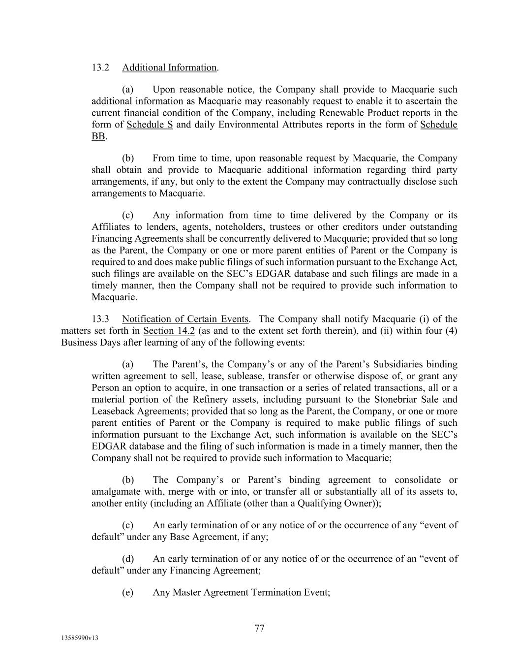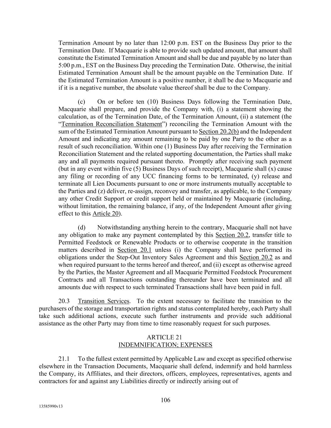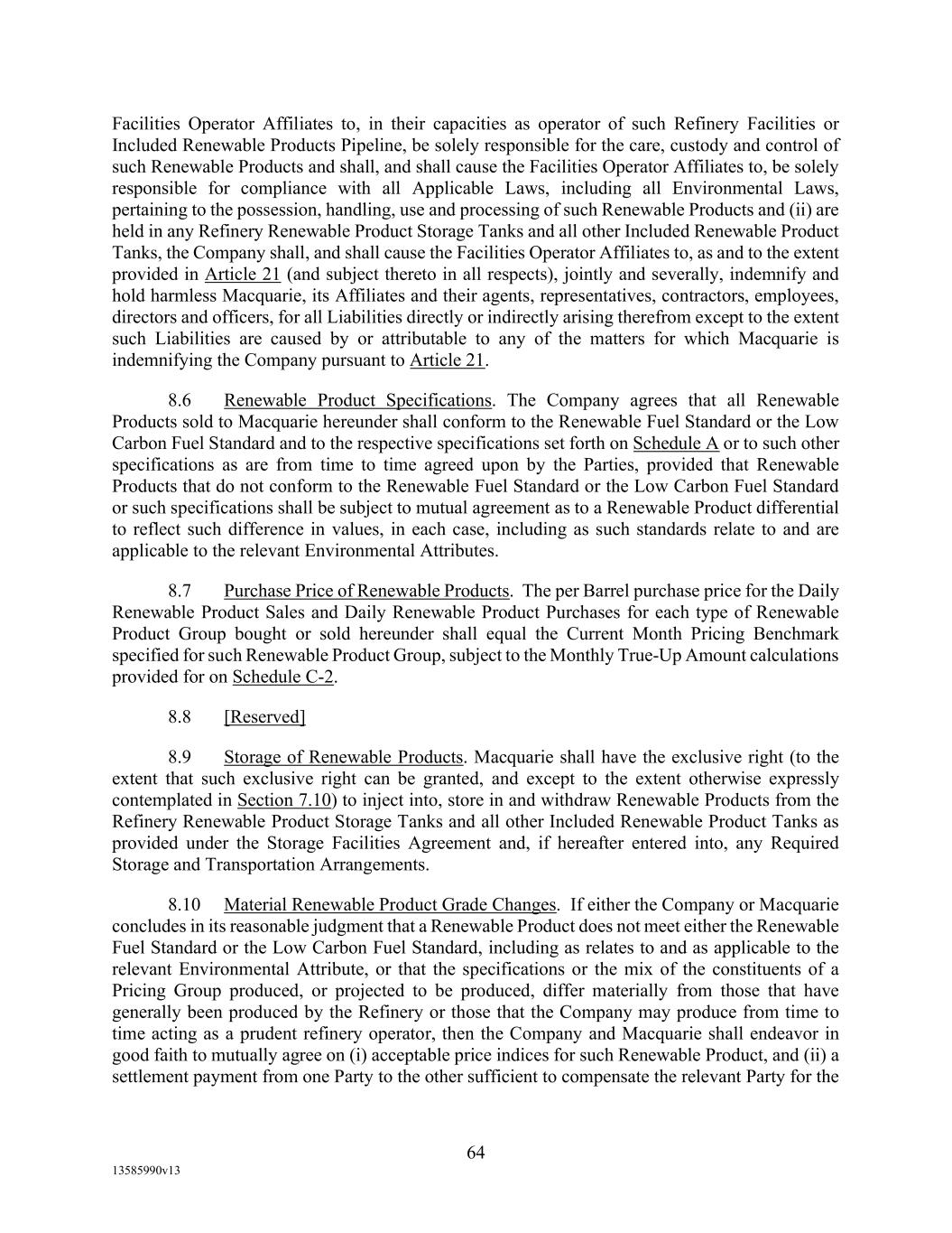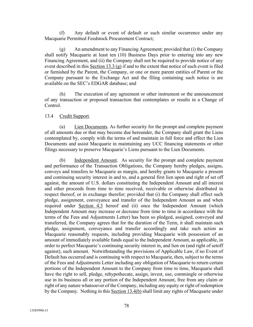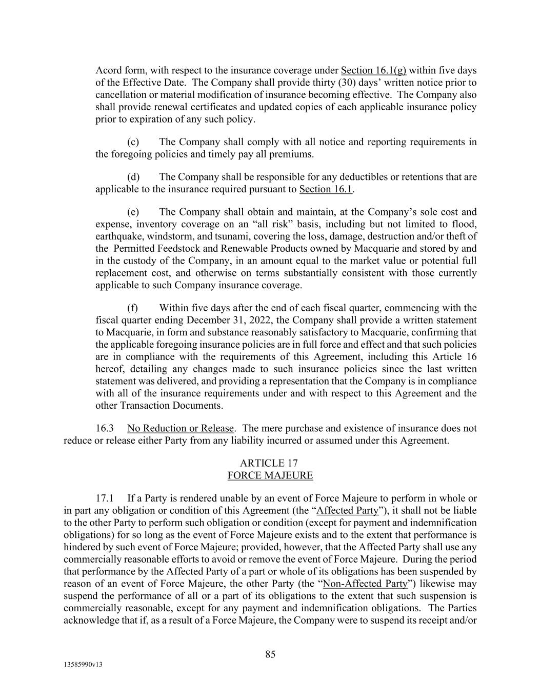TABLE OF CONTENTS (continued) Page -iii- 4.29 Hedge Agreements ..................................................................................................... 89 5. AFFIRMATIVE COVENANTS. ................................................................................... 89 5.1 Financial Statements, Reports, Certificates ................................................................ 89 5.2 Reporting .................................................................................................................... 90 5.3 Existence .................................................................................................................... 90 5.4 Maintenance of Properties .......................................................................................... 90 5.5 Taxes .......................................................................................................................... 90 5.6 Insurance. ................................................................................................................... 90 5.7 Inspection. .................................................................................................................. 91 5.8 Compliance with Laws ............................................................................................... 92 5.9 Environmental ............................................................................................................ 92 5.10 Disclosure Updates ..................................................................................................... 92 5.11 Formation of Subsidiaries .......................................................................................... 92 5.12 Further Assurances ..................................................................................................... 93 5.13 [Reserved] .................................................................................................................. 93 5.14 Chief Executive Office ............................................................................................... 93 5.15 OFAC; Sanctions; Anti-Corruption Laws; Anti-Money Laundering Laws ............... 93 5.16 Blenders Tax Credits. ................................................................................................. 94 6. NEGATIVE COVENANTS. .......................................................................................... 94 6.1 Indebtedness ............................................................................................................... 94 6.2 Liens ........................................................................................................................... 94 6.3 Restrictions on Fundamental Changes ....................................................................... 94 6.4 Disposal of Assets ...................................................................................................... 95 6.5 Nature of Business...................................................................................................... 95 6.6 Prepayments and Amendments .................................................................................. 95 6.7 Restricted Payments ................................................................................................... 96 6.8 Accounting Methods .................................................................................................. 96 6.9 Investments ................................................................................................................. 96 6.10 Transactions with Affiliates ....................................................................................... 97 6.11 Use of Proceeds .......................................................................................................... 97