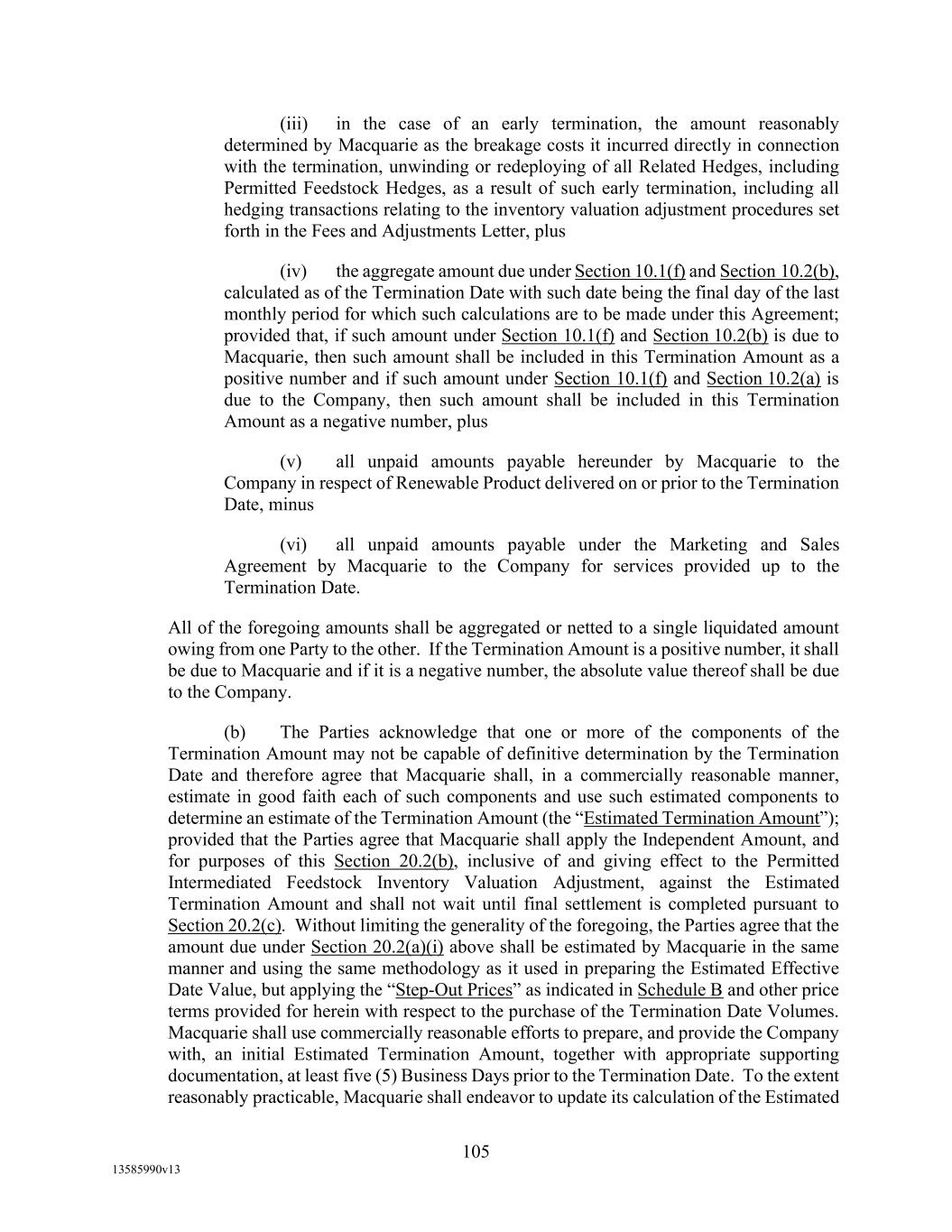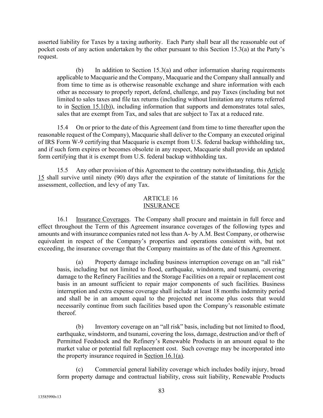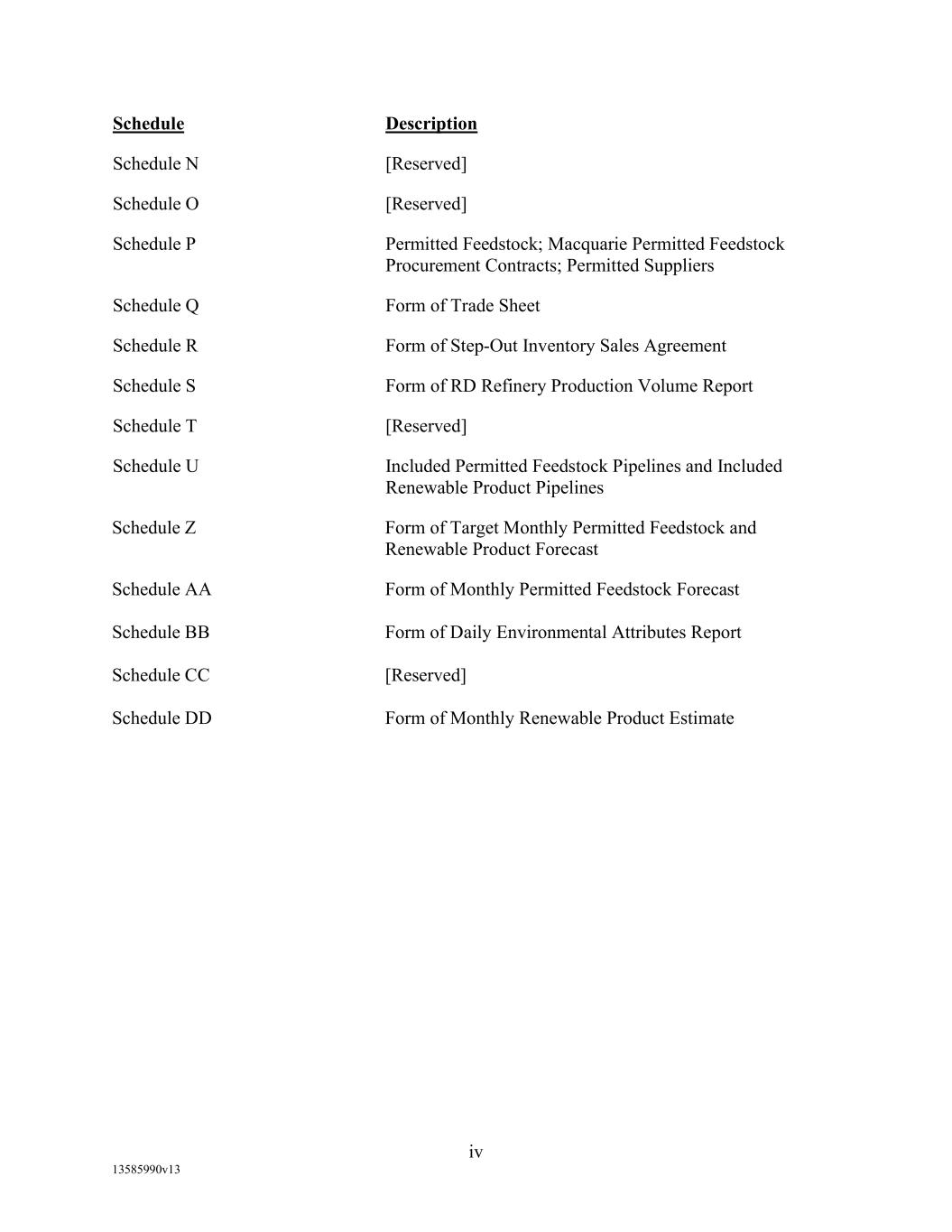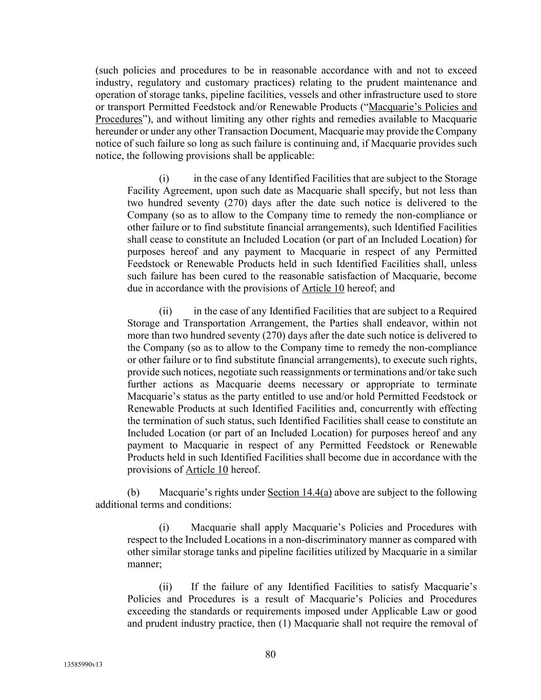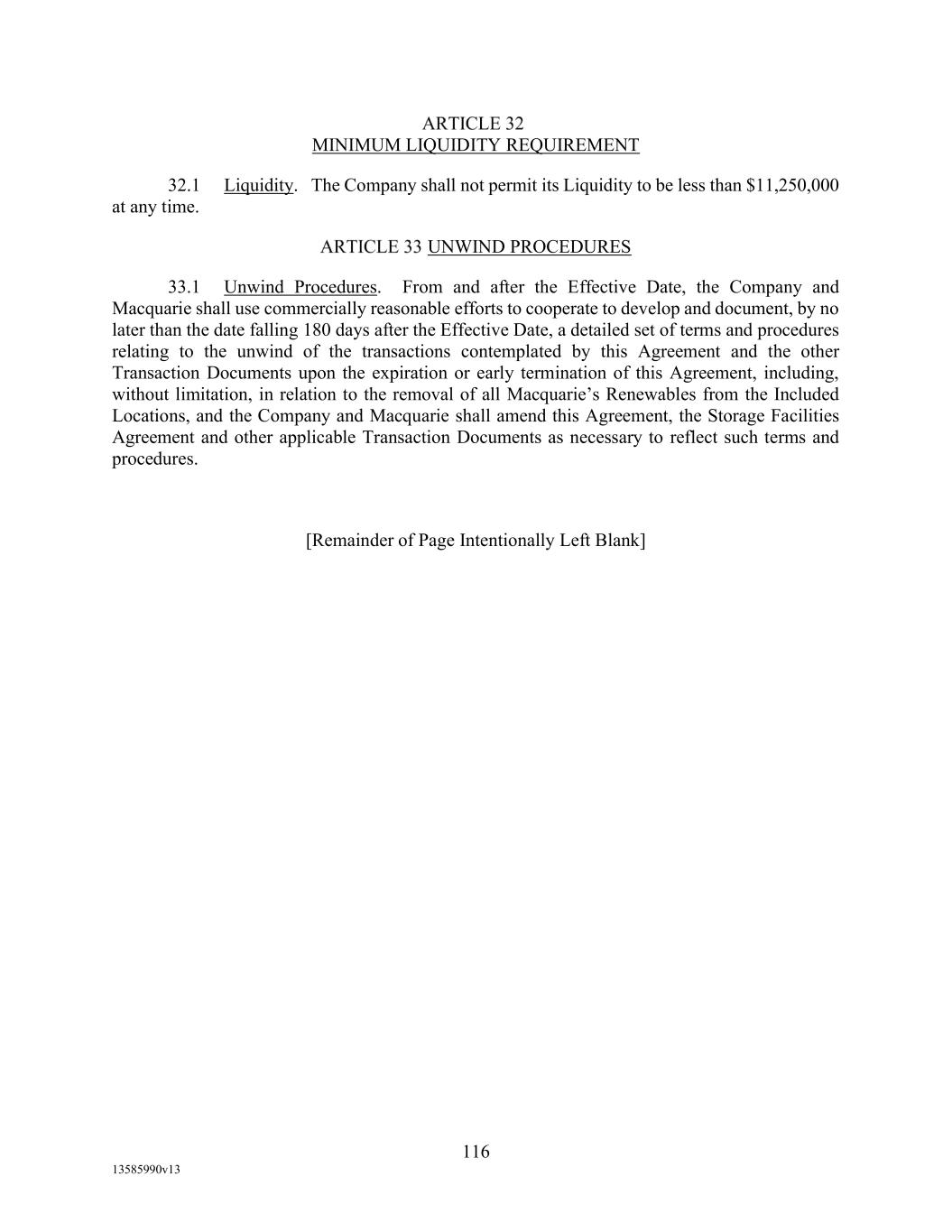 TABLE OF CONTENTS (continued) Page -iii- 4.29 Hedge Agreements ..................................................................................................... 89 5. AFFIRMATIVE COVENANTS. ................................................................................... 89 5.1 Financial Statements, Reports, Certificates ................................................................ 89 5.2 Reporting .................................................................................................................... 90 5.3 Existence .................................................................................................................... 90 5.4 Maintenance of Properties .......................................................................................... 90 5.5 Taxes .......................................................................................................................... 90 5.6 Insurance. ................................................................................................................... 90 5.7 Inspection. .................................................................................................................. 91 5.8 Compliance with Laws ............................................................................................... 92 5.9 Environmental ............................................................................................................ 92 5.10 Disclosure Updates ..................................................................................................... 92 5.11 Formation of Subsidiaries .......................................................................................... 92 5.12 Further Assurances ..................................................................................................... 93 5.13 [Reserved] .................................................................................................................. 93 5.14 Chief Executive Office ............................................................................................... 93 5.15 OFAC; Sanctions; Anti-Corruption Laws; Anti-Money Laundering Laws ............... 93 5.16 Blenders Tax Credits. ................................................................................................. 94 6. NEGATIVE COVENANTS. .......................................................................................... 94 6.1 Indebtedness ............................................................................................................... 94 6.2 Liens ........................................................................................................................... 94 6.3 Restrictions on Fundamental Changes ....................................................................... 94 6.4 Disposal of Assets ...................................................................................................... 95 6.5 Nature of Business...................................................................................................... 95 6.6 Prepayments and Amendments .................................................................................. 95 6.7 Restricted Payments ................................................................................................... 96 6.8 Accounting Methods .................................................................................................. 96 6.9 Investments ................................................................................................................. 96 6.10 Transactions with Affiliates ....................................................................................... 97 6.11 Use of Proceeds .......................................................................................................... 97