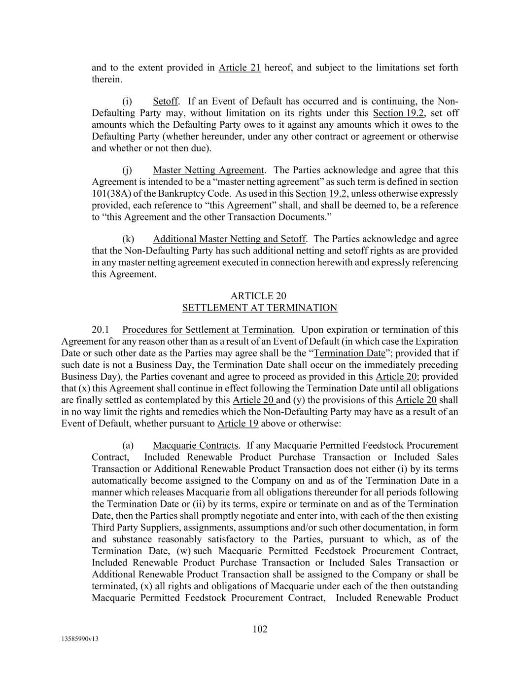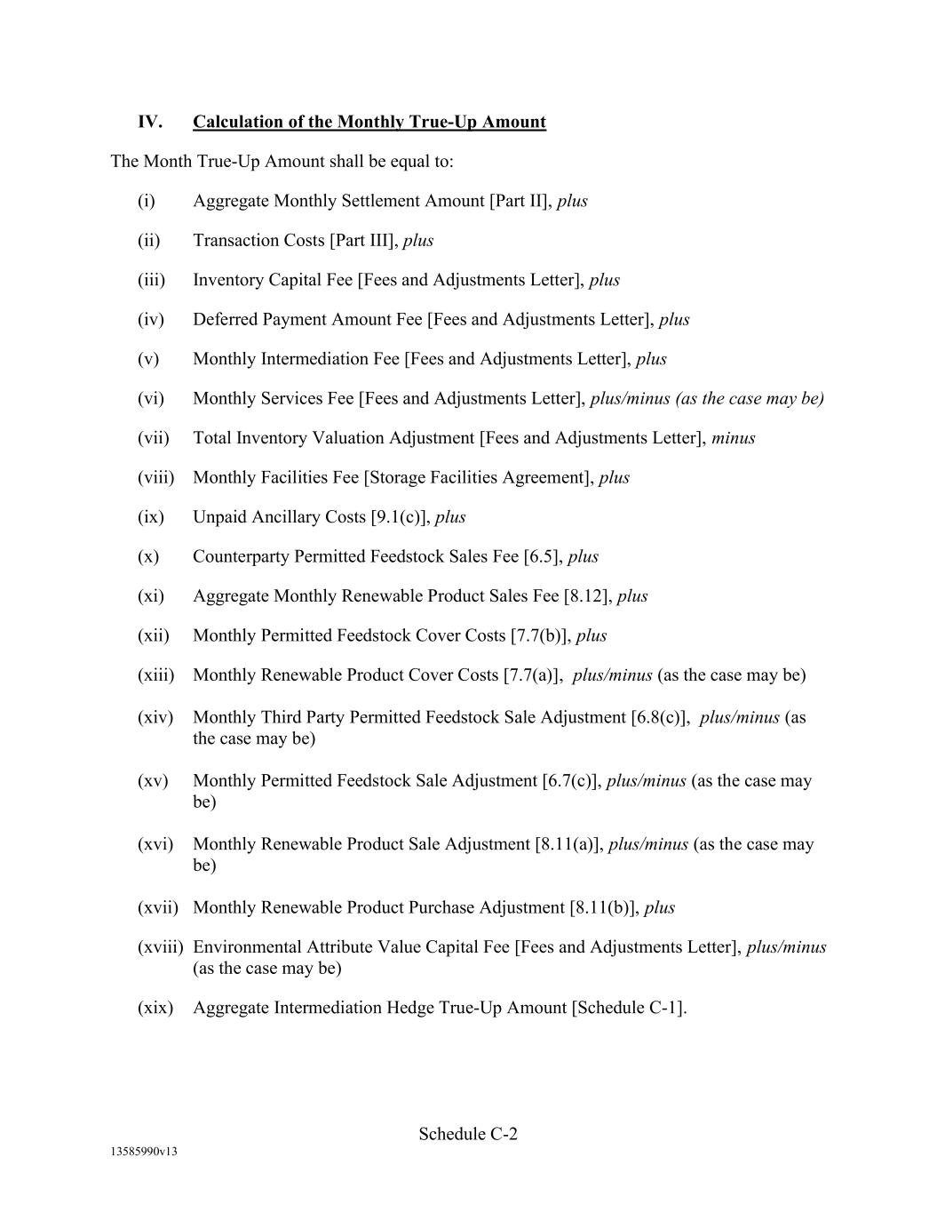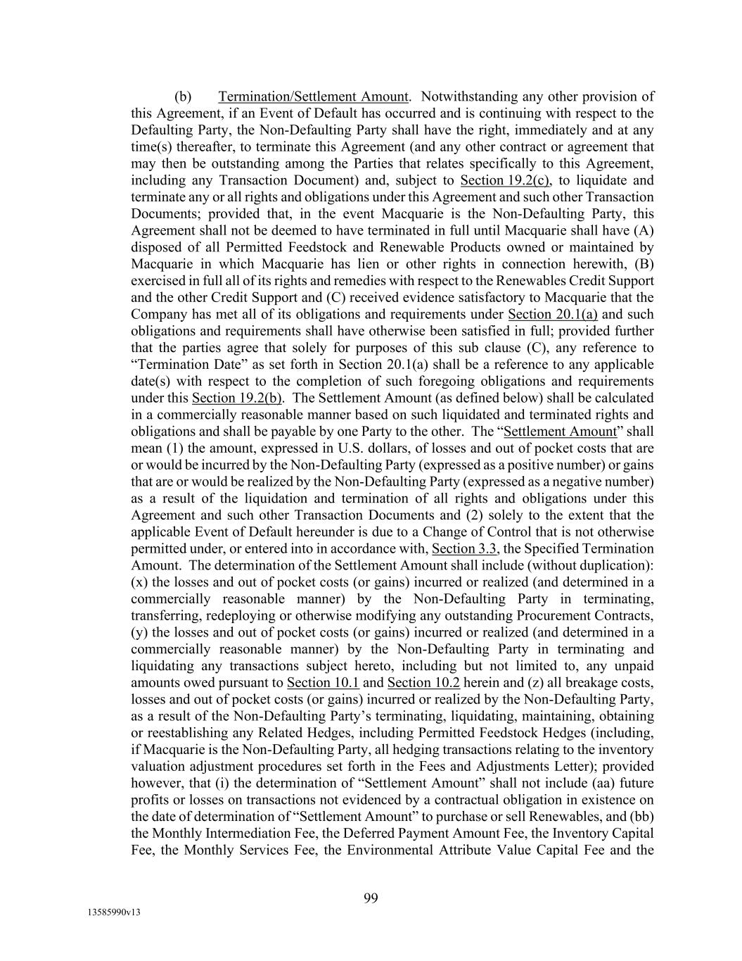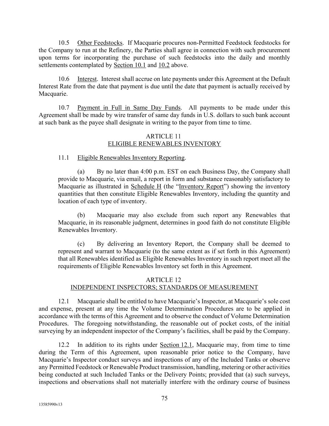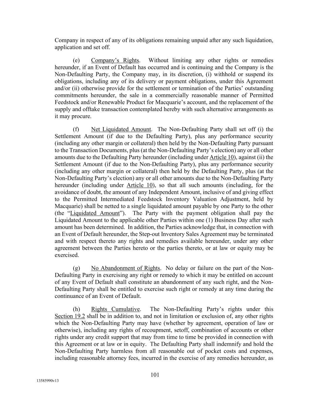 TABLE OF CONTENTS (continued) Page -iii- 4.29 Hedge Agreements ..................................................................................................... 89 5. AFFIRMATIVE COVENANTS. ................................................................................... 89 5.1 Financial Statements, Reports, Certificates ................................................................ 89 5.2 Reporting .................................................................................................................... 90 5.3 Existence .................................................................................................................... 90 5.4 Maintenance of Properties .......................................................................................... 90 5.5 Taxes .......................................................................................................................... 90 5.6 Insurance. ................................................................................................................... 90 5.7 Inspection. .................................................................................................................. 91 5.8 Compliance with Laws ............................................................................................... 92 5.9 Environmental ............................................................................................................ 92 5.10 Disclosure Updates ..................................................................................................... 92 5.11 Formation of Subsidiaries .......................................................................................... 92 5.12 Further Assurances ..................................................................................................... 93 5.13 [Reserved] .................................................................................................................. 93 5.14 Chief Executive Office ............................................................................................... 93 5.15 OFAC; Sanctions; Anti-Corruption Laws; Anti-Money Laundering Laws ............... 93 5.16 Blenders Tax Credits. ................................................................................................. 94 6. NEGATIVE COVENANTS. .......................................................................................... 94 6.1 Indebtedness ............................................................................................................... 94 6.2 Liens ........................................................................................................................... 94 6.3 Restrictions on Fundamental Changes ....................................................................... 94 6.4 Disposal of Assets ...................................................................................................... 95 6.5 Nature of Business...................................................................................................... 95 6.6 Prepayments and Amendments .................................................................................. 95 6.7 Restricted Payments ................................................................................................... 96 6.8 Accounting Methods .................................................................................................. 96 6.9 Investments ................................................................................................................. 96 6.10 Transactions with Affiliates ....................................................................................... 97 6.11 Use of Proceeds .......................................................................................................... 97