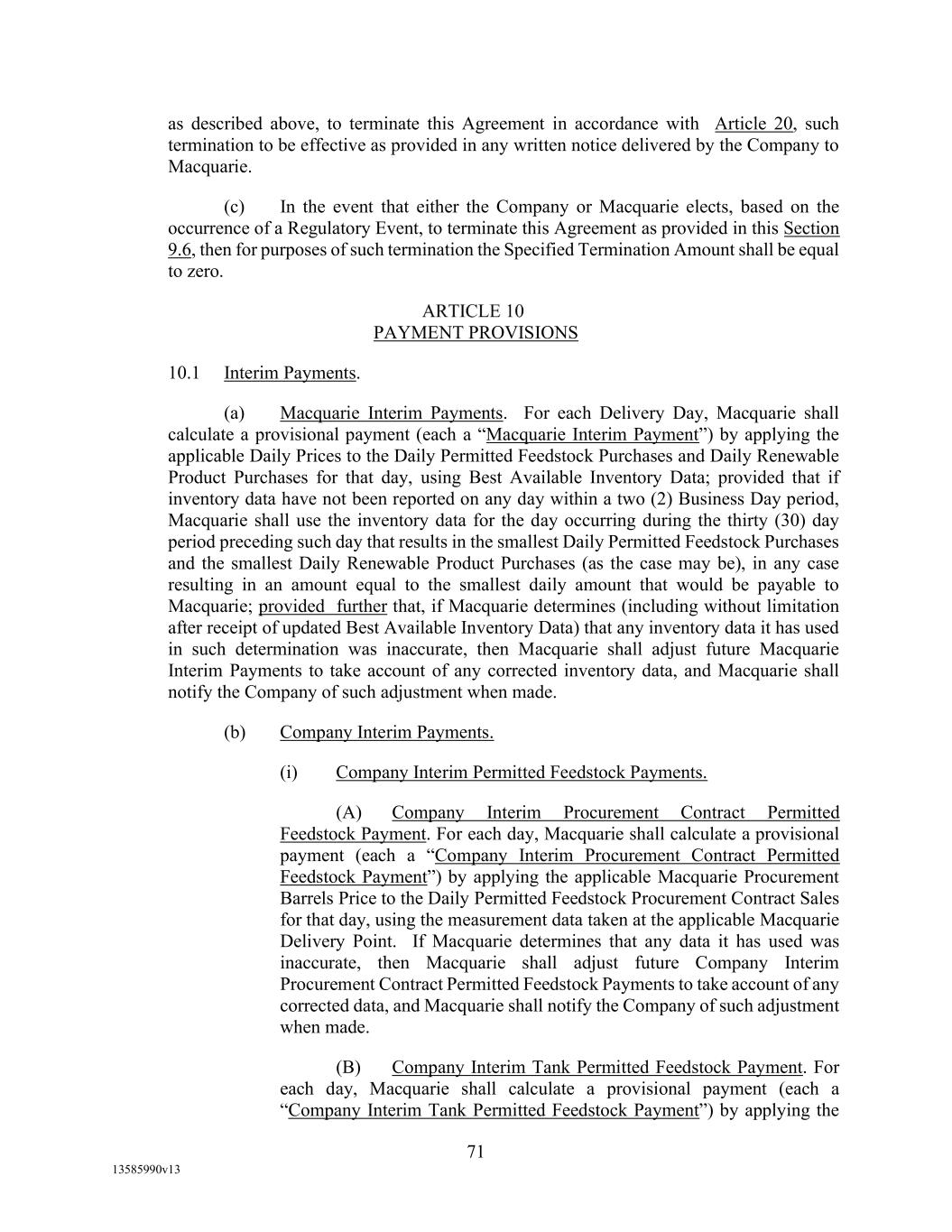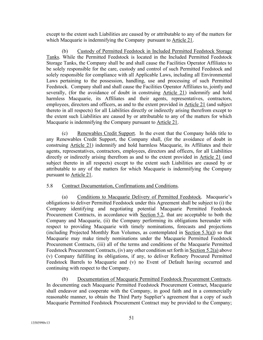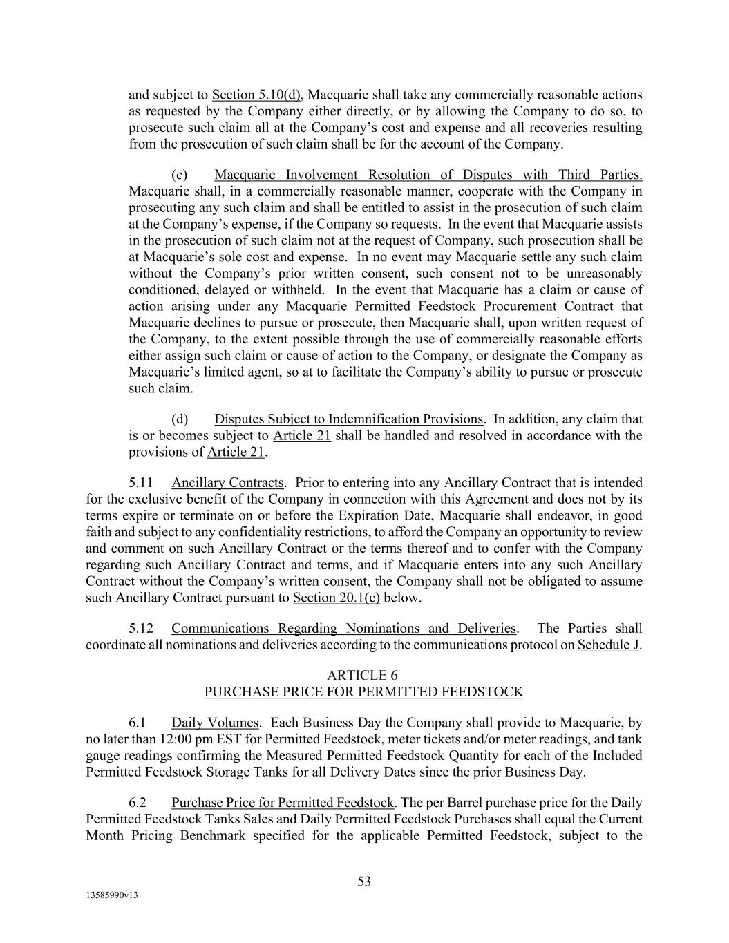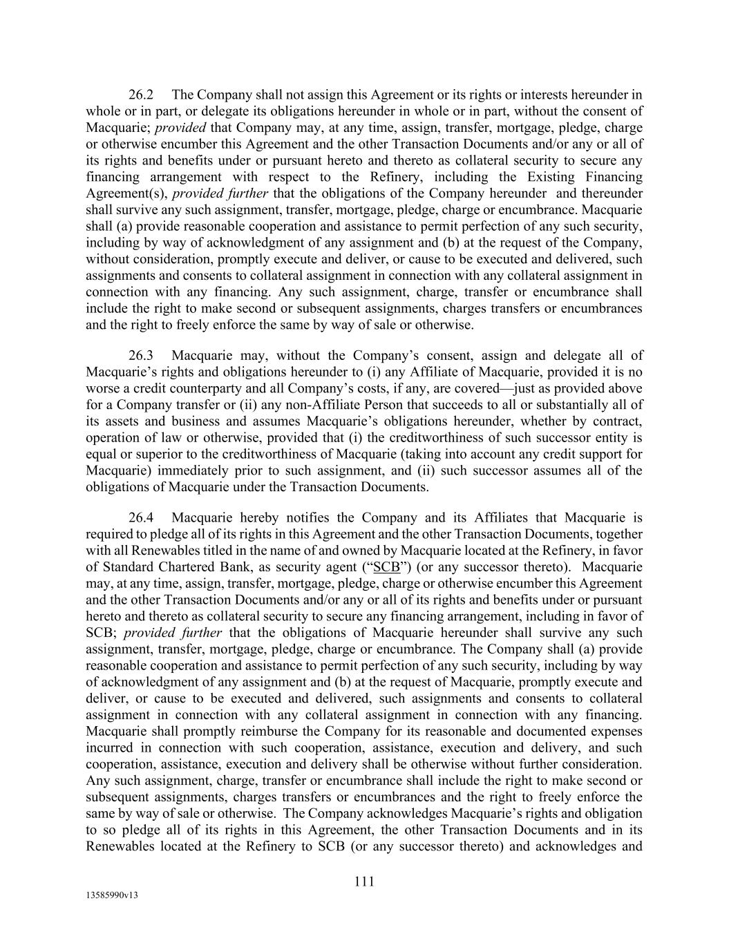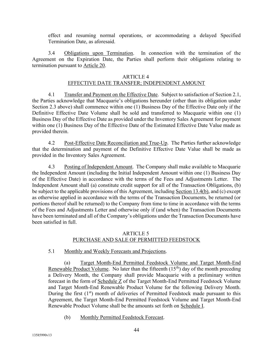 TABLE OF CONTENTS (continued) Page -iii- 4.29 Hedge Agreements ..................................................................................................... 89 5. AFFIRMATIVE COVENANTS. ................................................................................... 89 5.1 Financial Statements, Reports, Certificates ................................................................ 89 5.2 Reporting .................................................................................................................... 90 5.3 Existence .................................................................................................................... 90 5.4 Maintenance of Properties .......................................................................................... 90 5.5 Taxes .......................................................................................................................... 90 5.6 Insurance. ................................................................................................................... 90 5.7 Inspection. .................................................................................................................. 91 5.8 Compliance with Laws ............................................................................................... 92 5.9 Environmental ............................................................................................................ 92 5.10 Disclosure Updates ..................................................................................................... 92 5.11 Formation of Subsidiaries .......................................................................................... 92 5.12 Further Assurances ..................................................................................................... 93 5.13 [Reserved] .................................................................................................................. 93 5.14 Chief Executive Office ............................................................................................... 93 5.15 OFAC; Sanctions; Anti-Corruption Laws; Anti-Money Laundering Laws ............... 93 5.16 Blenders Tax Credits. ................................................................................................. 94 6. NEGATIVE COVENANTS. .......................................................................................... 94 6.1 Indebtedness ............................................................................................................... 94 6.2 Liens ........................................................................................................................... 94 6.3 Restrictions on Fundamental Changes ....................................................................... 94 6.4 Disposal of Assets ...................................................................................................... 95 6.5 Nature of Business...................................................................................................... 95 6.6 Prepayments and Amendments .................................................................................. 95 6.7 Restricted Payments ................................................................................................... 96 6.8 Accounting Methods .................................................................................................. 96 6.9 Investments ................................................................................................................. 96 6.10 Transactions with Affiliates ....................................................................................... 97 6.11 Use of Proceeds .......................................................................................................... 97
