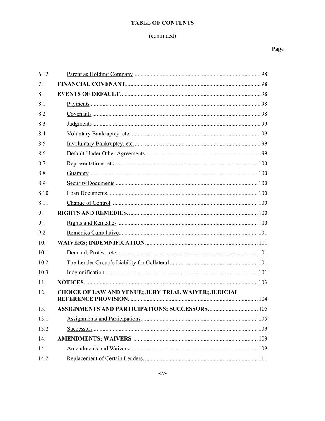 TABLE OF CONTENTS (continued) Page -iv- 6.12 Parent as Holding Company ....................................................................................... 98 7. FINANCIAL COVENANT. ........................................................................................... 98 8. EVENTS OF DEFAULT. ............................................................................................... 98 8.1 Payments .................................................................................................................... 98 8.2 Covenants ................................................................................................................... 98 8.3 Judgments ................................................................................................................... 99 8.4 Voluntary Bankruptcy, etc. ........................................................................................ 99 8.5 Involuntary Bankruptcy, etc. ...................................................................................... 99 8.6 Default Under Other Agreements ............................................................................... 99 8.7 Representations, etc. ................................................................................................. 100 8.8 Guaranty ................................................................................................................... 100 8.9 Security Documents ................................................................................................. 100 8.10 Loan Documents....................................................................................................... 100 8.11 Change of Control .................................................................................................... 100 9. RIGHTS AND REMEDIES. ........................................................................................ 100 9.1 Rights and Remedies ................................................................................................ 100 9.2 Remedies Cumulative ............................................................................................... 101 10. WAIVERS; INDEMNIFICATION. ............................................................................ 101 10.1 Demand; Protest; etc. ............................................................................................... 101 10.2 The Lender Group’s Liability for Collateral ............................................................ 101 10.3 Indemnification ........................................................................................................ 101 11. NOTICES. ..................................................................................................................... 103 12. CHOICE OF LAW AND VENUE; JURY TRIAL WAIVER; JUDICIAL REFERENCE PROVISION. ....................................................................................... 104 13. ASSIGNMENTS AND PARTICIPATIONS; SUCCESSORS. ................................. 105 13.1 Assignments and Participations. ............................................................................... 105 13.2 Successors ................................................................................................................ 109 14. AMENDMENTS; WAIVERS. ..................................................................................... 109 14.1 Amendments and Waivers. ....................................................................................... 109 14.2 Replacement of Certain Lenders. ............................................................................. 111