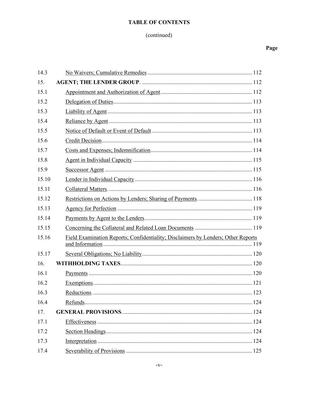 TABLE OF CONTENTS (continued) Page -v- 14.3 No Waivers; Cumulative Remedies ......................................................................... 112 15. AGENT; THE LENDER GROUP. ............................................................................. 112 15.1 Appointment and Authorization of Agent ................................................................ 112 15.2 Delegation of Duties ................................................................................................. 113 15.3 Liability of Agent ..................................................................................................... 113 15.4 Reliance by Agent .................................................................................................... 113 15.5 Notice of Default or Event of Default ...................................................................... 113 15.6 Credit Decision ......................................................................................................... 114 15.7 Costs and Expenses; Indemnification ....................................................................... 114 15.8 Agent in Individual Capacity ................................................................................... 115 15.9 Successor Agent ....................................................................................................... 115 15.10 Lender in Individual Capacity .................................................................................. 116 15.11 Collateral Matters. .................................................................................................... 116 15.12 Restrictions on Actions by Lenders; Sharing of Payments. ..................................... 118 15.13 Agency for Perfection .............................................................................................. 119 15.14 Payments by Agent to the Lenders ........................................................................... 119 15.15 Concerning the Collateral and Related Loan Documents ........................................ 119 15.16 Field Examination Reports; Confidentiality; Disclaimers by Lenders; Other Reports and Information ........................................................................................................ 119 15.17 Several Obligations; No Liability ............................................................................. 120 16. WITHHOLDING TAXES............................................................................................ 120 16.1 Payments .................................................................................................................. 120 16.2 Exemptions. .............................................................................................................. 121 16.3 Reductions. ............................................................................................................... 123 16.4 Refunds ..................................................................................................................... 124 17. GENERAL PROVISIONS. .......................................................................................... 124 17.1 Effectiveness ............................................................................................................ 124 17.2 Section Headings ...................................................................................................... 124 17.3 Interpretation ............................................................................................................ 124 17.4 Severability of Provisions ........................................................................................ 125