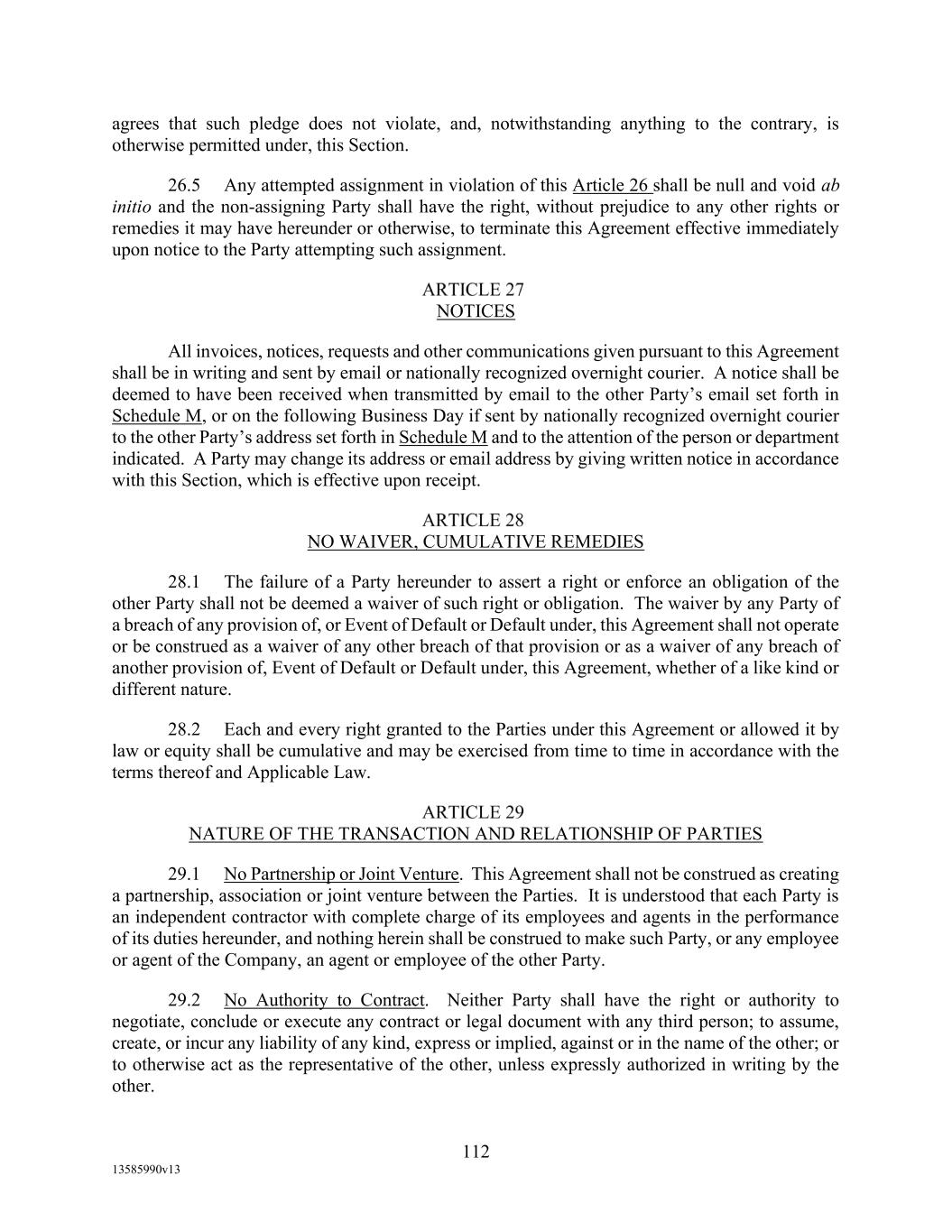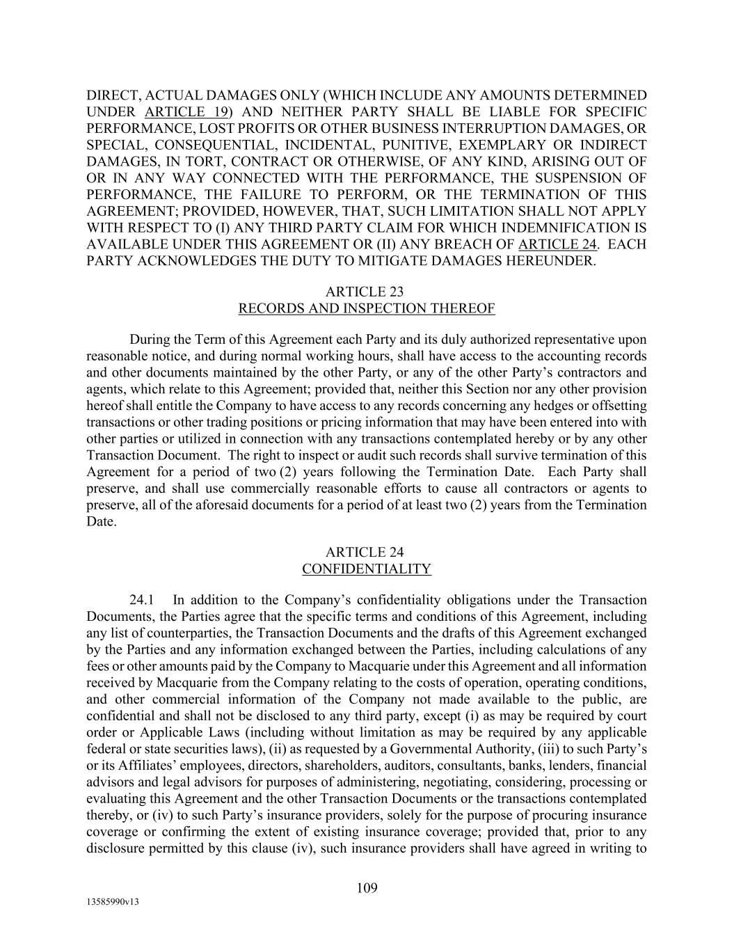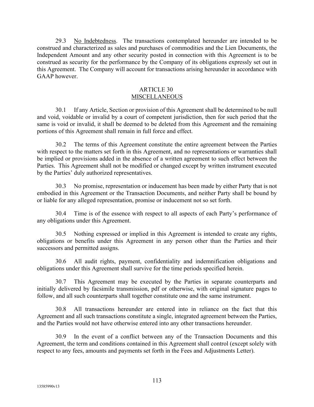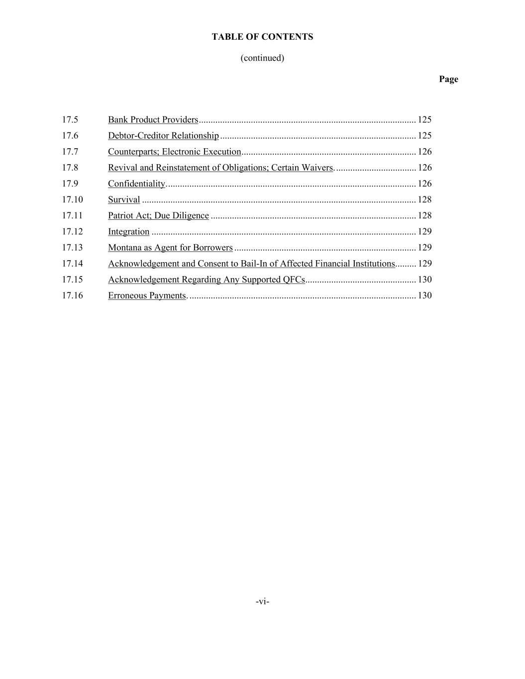 TABLE OF CONTENTS (continued) Page -vi- 17.5 Bank Product Providers ............................................................................................ 125 17.6 Debtor-Creditor Relationship ................................................................................... 125 17.7 Counterparts; Electronic Execution .......................................................................... 126 17.8 Revival and Reinstatement of Obligations; Certain Waivers. .................................. 126 17.9 Confidentiality. ......................................................................................................... 126 17.10 Survival .................................................................................................................... 128 17.11 Patriot Act; Due Diligence ....................................................................................... 128 17.12 Integration ................................................................................................................ 129 17.13 Montana as Agent for Borrowers ............................................................................. 129 17.14 Acknowledgement and Consent to Bail-In of Affected Financial Institutions ......... 129 17.15 Acknowledgement Regarding Any Supported QFCs ............................................... 130 17.16 Erroneous Payments. ................................................................................................ 130