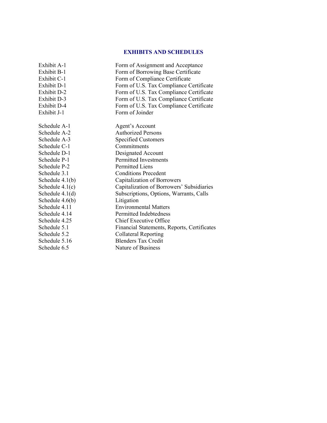 EXHIBITS AND SCHEDULES Exhibit A-1 Form of Assignment and Acceptance Exhibit B-1 Form of Borrowing Base Certificate Exhibit C-1 Form of Compliance Certificate Exhibit D-1 Form of U.S. Tax Compliance Certificate Exhibit D-2 Form of U.S. Tax Compliance Certificate Exhibit D-3 Form of U.S. Tax Compliance Certificate Exhibit D-4 Form of U.S. Tax Compliance Certificate Exhibit J-1 Form of Joinder Schedule A-1 Agent’s Account Schedule A-2 Authorized Persons Schedule A-3 Specified Customers Schedule C-1 Commitments Schedule D-1 Designated Account Schedule P-1 Permitted Investments Schedule P-2 Permitted Liens Schedule 3.1 Conditions Precedent Schedule 4.1(b) Capitalization of Borrowers Schedule 4.1(c) Capitalization of Borrowers’ Subsidiaries Schedule 4.1(d) Subscriptions, Options, Warrants, Calls Schedule 4.6(b) Litigation Schedule 4.11 Environmental Matters Schedule 4.14 Permitted Indebtedness Schedule 4.25 Chief Executive Office Schedule 5.1 Financial Statements, Reports, Certificates Schedule 5.2 Collateral Reporting Schedule 5.16 Blenders Tax Credit Schedule 6.5 Nature of Business
