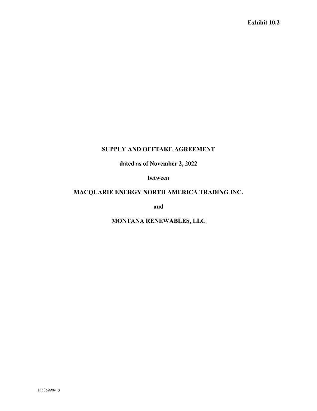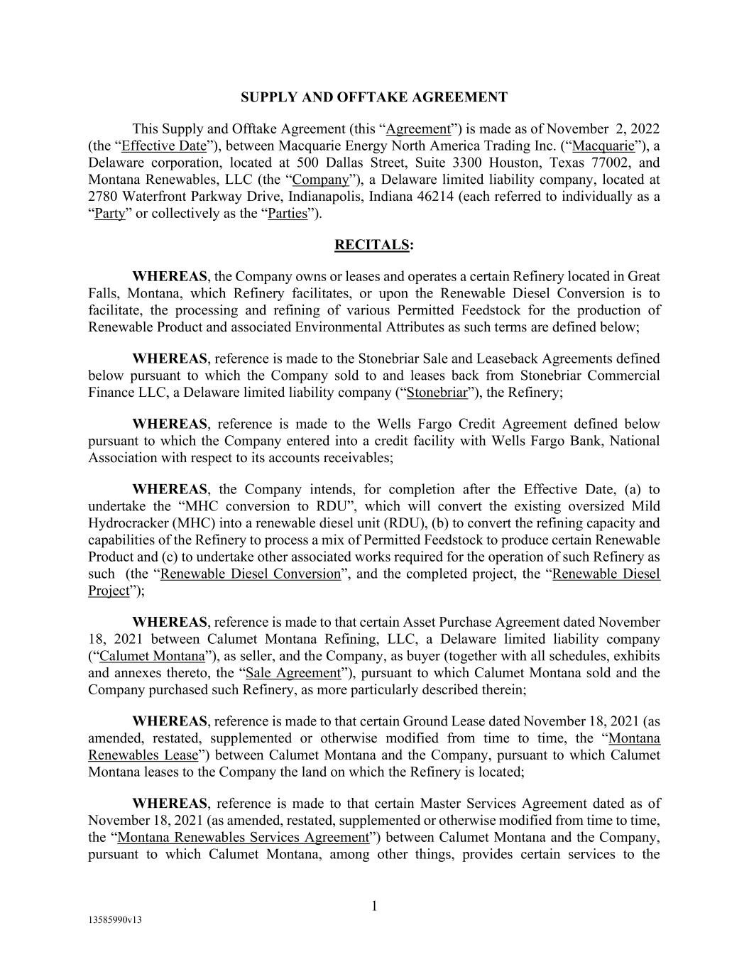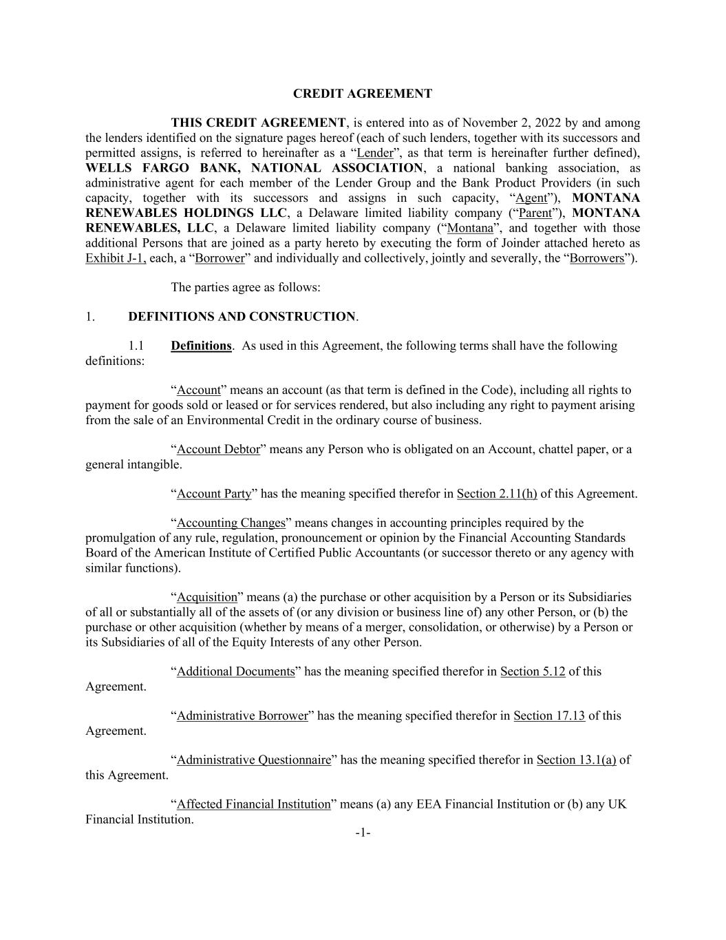 -1- CREDIT AGREEMENT THIS CREDIT AGREEMENT, is entered into as of November 2, 2022 by and among the lenders identified on the signature pages hereof (each of such lenders, together with its successors and permitted assigns, is referred to hereinafter as a “Lender”, as that term is hereinafter further defined), WELLS FARGO BANK, NATIONAL ASSOCIATION, a national banking association, as administrative agent for each member of the Lender Group and the Bank Product Providers (in such capacity, together with its successors and assigns in such capacity, “Agent”), MONTANA RENEWABLES HOLDINGS LLC, a Delaware limited liability company (“Parent”), MONTANA RENEWABLES, LLC, a Delaware limited liability company (“Montana”, and together with those additional Persons that are joined as a party hereto by executing the form of Joinder attached hereto as Exhibit J-1, each, a “Borrower” and individually and collectively, jointly and severally, the “Borrowers”). The parties agree as follows: 1. DEFINITIONS AND CONSTRUCTION. 1.1 Definitions. As used in this Agreement, the following terms shall have the following definitions: “Account” means an account (as that term is defined in the Code), including all rights to payment for goods sold or leased or for services rendered, but also including any right to payment arising from the sale of an Environmental Credit in the ordinary course of business. “Account Debtor” means any Person who is obligated on an Account, chattel paper, or a general intangible. “Account Party” has the meaning specified therefor in Section 2.11(h) of this Agreement. “Accounting Changes” means changes in accounting principles required by the promulgation of any rule, regulation, pronouncement or opinion by the Financial Accounting Standards Board of the American Institute of Certified Public Accountants (or successor thereto or any agency with similar functions). “Acquisition” means (a) the purchase or other acquisition by a Person or its Subsidiaries of all or substantially all of the assets of (or any division or business line of) any other Person, or (b) the purchase or other acquisition (whether by means of a merger, consolidation, or otherwise) by a Person or its Subsidiaries of all of the Equity Interests of any other Person. “Additional Documents” has the meaning specified therefor in Section 5.12 of this Agreement. “Administrative Borrower” has the meaning specified therefor in Section 17.13 of this Agreement. “Administrative Questionnaire” has the meaning specified therefor in Section 13.1(a) of this Agreement. “Affected Financial Institution” means (a) any EEA Financial Institution or (b) any UK Financial Institution.