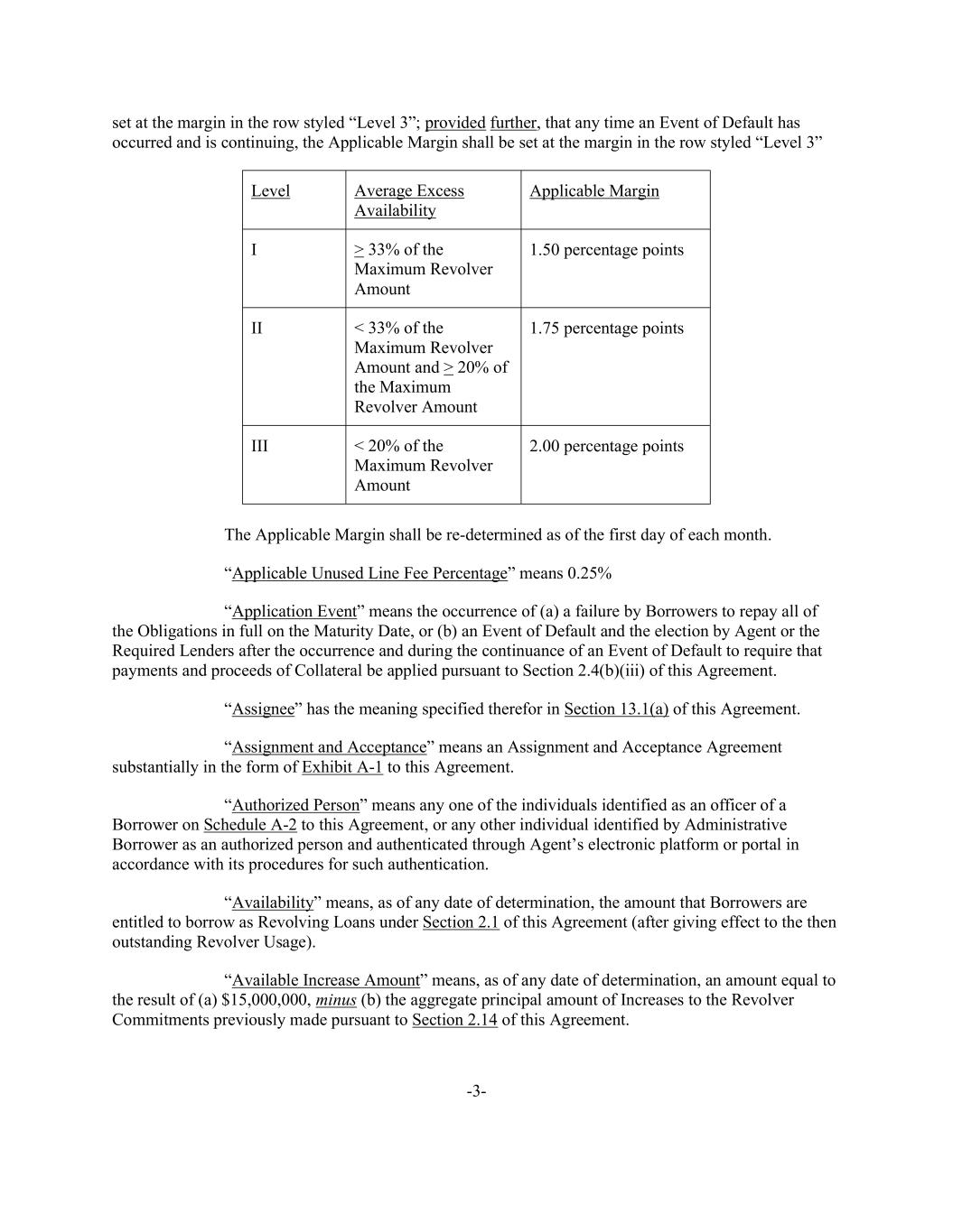 -3- set at the margin in the row styled “Level 3”; provided further, that any time an Event of Default has occurred and is continuing, the Applicable Margin shall be set at the margin in the row styled “Level 3” Level Average Excess Availability Applicable Margin I > 33% of the Maximum Revolver Amount 1.50 percentage points II < 33% of the Maximum Revolver Amount and > 20% of the Maximum Revolver Amount 1.75 percentage points III < 20% of the Maximum Revolver Amount 2.00 percentage points The Applicable Margin shall be re-determined as of the first day of each month. “Applicable Unused Line Fee Percentage” means 0.25% “Application Event” means the occurrence of (a) a failure by Borrowers to repay all of the Obligations in full on the Maturity Date, or (b) an Event of Default and the election by Agent or the Required Lenders after the occurrence and during the continuance of an Event of Default to require that payments and proceeds of Collateral be applied pursuant to Section 2.4(b)(iii) of this Agreement. “Assignee” has the meaning specified therefor in Section 13.1(a) of this Agreement. “Assignment and Acceptance” means an Assignment and Acceptance Agreement substantially in the form of Exhibit A-1 to this Agreement. “Authorized Person” means any one of the individuals identified as an officer of a Borrower on Schedule A-2 to this Agreement, or any other individual identified by Administrative Borrower as an authorized person and authenticated through Agent’s electronic platform or portal in accordance with its procedures for such authentication. “Availability” means, as of any date of determination, the amount that Borrowers are entitled to borrow as Revolving Loans under Section 2.1 of this Agreement (after giving effect to the then outstanding Revolver Usage). “Available Increase Amount” means, as of any date of determination, an amount equal to the result of (a) $15,000,000, minus (b) the aggregate principal amount of Increases to the Revolver Commitments previously made pursuant to Section 2.14 of this Agreement.