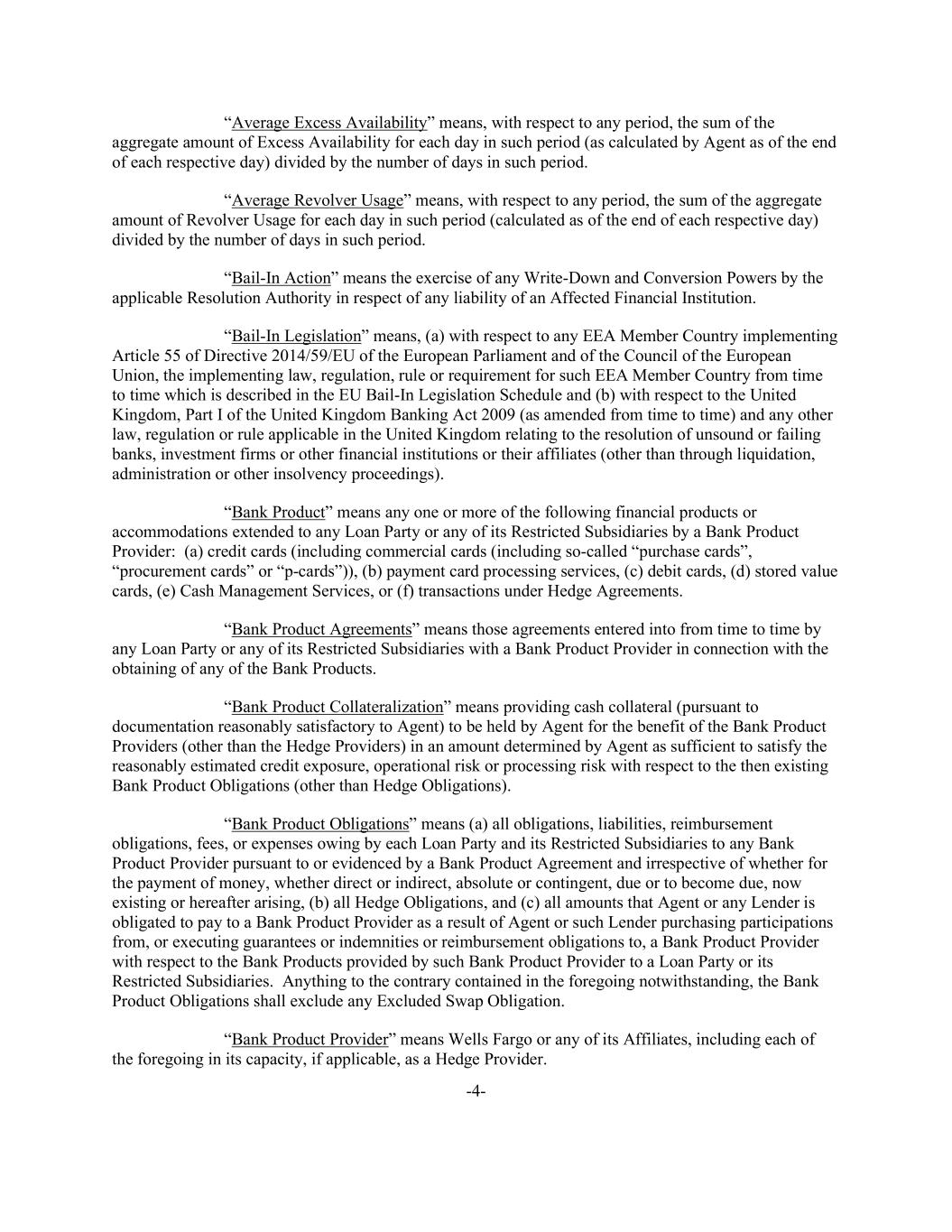 -4- “Average Excess Availability” means, with respect to any period, the sum of the aggregate amount of Excess Availability for each day in such period (as calculated by Agent as of the end of each respective day) divided by the number of days in such period. “Average Revolver Usage” means, with respect to any period, the sum of the aggregate amount of Revolver Usage for each day in such period (calculated as of the end of each respective day) divided by the number of days in such period. “Bail-In Action” means the exercise of any Write-Down and Conversion Powers by the applicable Resolution Authority in respect of any liability of an Affected Financial Institution. “Bail-In Legislation” means, (a) with respect to any EEA Member Country implementing Article 55 of Directive 2014/59/EU of the European Parliament and of the Council of the European Union, the implementing law, regulation, rule or requirement for such EEA Member Country from time to time which is described in the EU Bail-In Legislation Schedule and (b) with respect to the United Kingdom, Part I of the United Kingdom Banking Act 2009 (as amended from time to time) and any other law, regulation or rule applicable in the United Kingdom relating to the resolution of unsound or failing banks, investment firms or other financial institutions or their affiliates (other than through liquidation, administration or other insolvency proceedings). “Bank Product” means any one or more of the following financial products or accommodations extended to any Loan Party or any of its Restricted Subsidiaries by a Bank Product Provider: (a) credit cards (including commercial cards (including so-called “purchase cards”, “procurement cards” or “p-cards”)), (b) payment card processing services, (c) debit cards, (d) stored value cards, (e) Cash Management Services, or (f) transactions under Hedge Agreements. “Bank Product Agreements” means those agreements entered into from time to time by any Loan Party or any of its Restricted Subsidiaries with a Bank Product Provider in connection with the obtaining of any of the Bank Products. “Bank Product Collateralization” means providing cash collateral (pursuant to documentation reasonably satisfactory to Agent) to be held by Agent for the benefit of the Bank Product Providers (other than the Hedge Providers) in an amount determined by Agent as sufficient to satisfy the reasonably estimated credit exposure, operational risk or processing risk with respect to the then existing Bank Product Obligations (other than Hedge Obligations). “Bank Product Obligations” means (a) all obligations, liabilities, reimbursement obligations, fees, or expenses owing by each Loan Party and its Restricted Subsidiaries to any Bank Product Provider pursuant to or evidenced by a Bank Product Agreement and irrespective of whether for the payment of money, whether direct or indirect, absolute or contingent, due or to become due, now existing or hereafter arising, (b) all Hedge Obligations, and (c) all amounts that Agent or any Lender is obligated to pay to a Bank Product Provider as a result of Agent or such Lender purchasing participations from, or executing guarantees or indemnities or reimbursement obligations to, a Bank Product Provider with respect to the Bank Products provided by such Bank Product Provider to a Loan Party or its Restricted Subsidiaries. Anything to the contrary contained in the foregoing notwithstanding, the Bank Product Obligations shall exclude any Excluded Swap Obligation. “Bank Product Provider” means Wells Fargo or any of its Affiliates, including each of the foregoing in its capacity, if applicable, as a Hedge Provider.