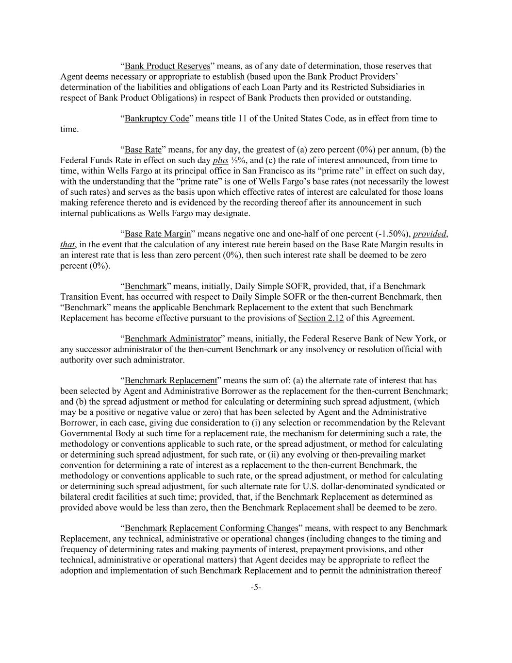 -5- “Bank Product Reserves” means, as of any date of determination, those reserves that Agent deems necessary or appropriate to establish (based upon the Bank Product Providers’ determination of the liabilities and obligations of each Loan Party and its Restricted Subsidiaries in respect of Bank Product Obligations) in respect of Bank Products then provided or outstanding. “Bankruptcy Code” means title 11 of the United States Code, as in effect from time to time. “Base Rate” means, for any day, the greatest of (a) zero percent (0%) per annum, (b) the Federal Funds Rate in effect on such day plus ½%, and (c) the rate of interest announced, from time to time, within Wells Fargo at its principal office in San Francisco as its “prime rate” in effect on such day, with the understanding that the “prime rate” is one of Wells Fargo’s base rates (not necessarily the lowest of such rates) and serves as the basis upon which effective rates of interest are calculated for those loans making reference thereto and is evidenced by the recording thereof after its announcement in such internal publications as Wells Fargo may designate. “Base Rate Margin” means negative one and one-half of one percent (-1.50%), provided, that, in the event that the calculation of any interest rate herein based on the Base Rate Margin results in an interest rate that is less than zero percent (0%), then such interest rate shall be deemed to be zero percent (0%). “Benchmark” means, initially, Daily Simple SOFR, provided, that, if a Benchmark Transition Event, has occurred with respect to Daily Simple SOFR or the then-current Benchmark, then “Benchmark” means the applicable Benchmark Replacement to the extent that such Benchmark Replacement has become effective pursuant to the provisions of Section 2.12 of this Agreement. “Benchmark Administrator” means, initially, the Federal Reserve Bank of New York, or any successor administrator of the then-current Benchmark or any insolvency or resolution official with authority over such administrator. “Benchmark Replacement” means the sum of: (a) the alternate rate of interest that has been selected by Agent and Administrative Borrower as the replacement for the then-current Benchmark; and (b) the spread adjustment or method for calculating or determining such spread adjustment, (which may be a positive or negative value or zero) that has been selected by Agent and the Administrative Borrower, in each case, giving due consideration to (i) any selection or recommendation by the Relevant Governmental Body at such time for a replacement rate, the mechanism for determining such a rate, the methodology or conventions applicable to such rate, or the spread adjustment, or method for calculating or determining such spread adjustment, for such rate, or (ii) any evolving or then-prevailing market convention for determining a rate of interest as a replacement to the then-current Benchmark, the methodology or conventions applicable to such rate, or the spread adjustment, or method for calculating or determining such spread adjustment, for such alternate rate for U.S. dollar-denominated syndicated or bilateral credit facilities at such time; provided, that, if the Benchmark Replacement as determined as provided above would be less than zero, then the Benchmark Replacement shall be deemed to be zero. “Benchmark Replacement Conforming Changes” means, with respect to any Benchmark Replacement, any technical, administrative or operational changes (including changes to the timing and frequency of determining rates and making payments of interest, prepayment provisions, and other technical, administrative or operational matters) that Agent decides may be appropriate to reflect the adoption and implementation of such Benchmark Replacement and to permit the administration thereof