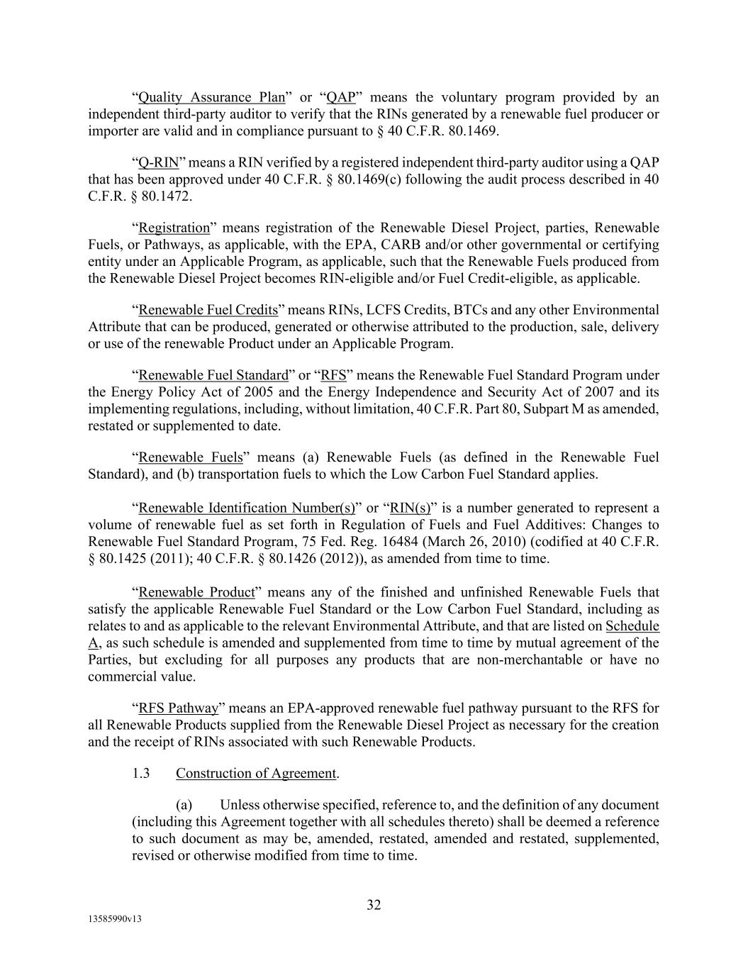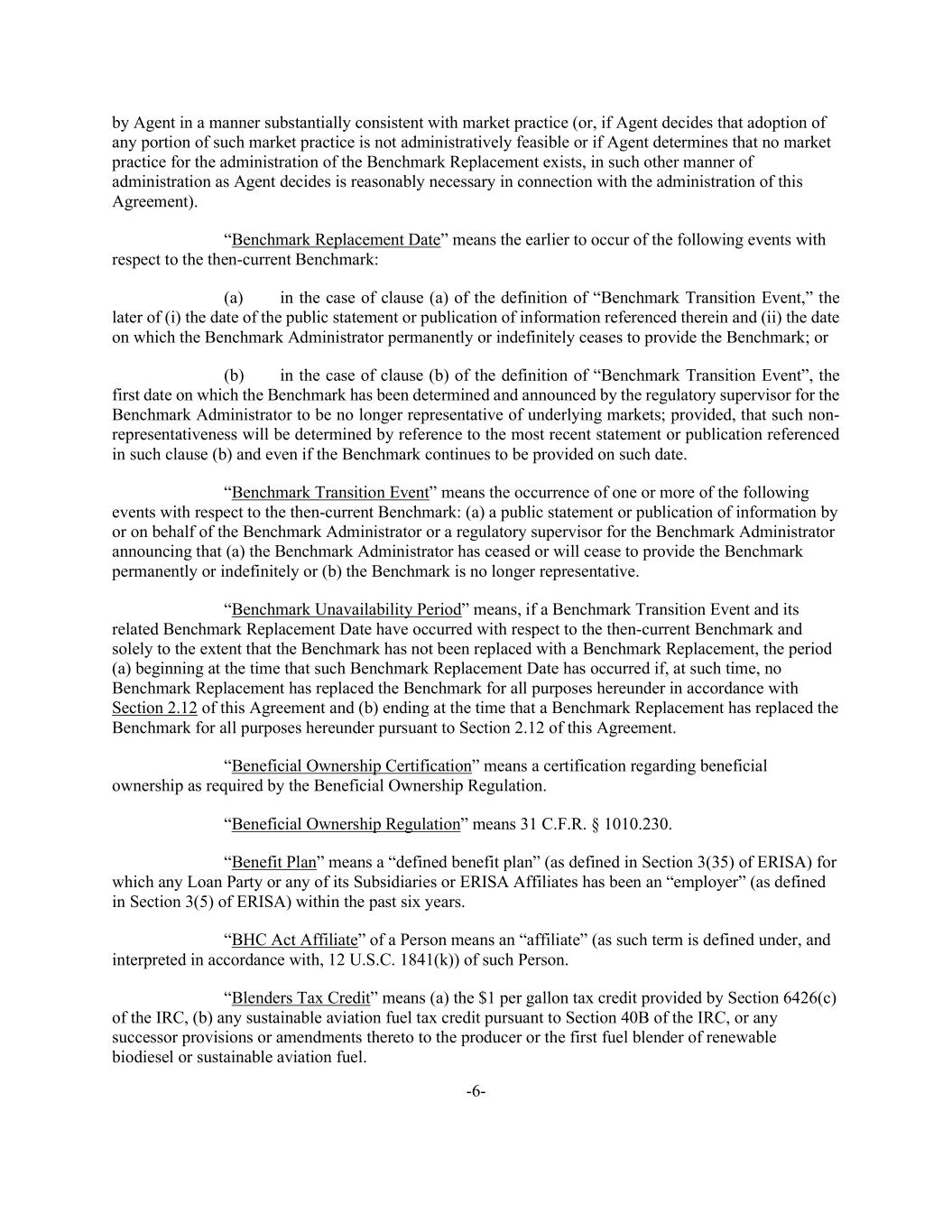 -6- by Agent in a manner substantially consistent with market practice (or, if Agent decides that adoption of any portion of such market practice is not administratively feasible or if Agent determines that no market practice for the administration of the Benchmark Replacement exists, in such other manner of administration as Agent decides is reasonably necessary in connection with the administration of this Agreement). “Benchmark Replacement Date” means the earlier to occur of the following events with respect to the then-current Benchmark: (a) in the case of clause (a) of the definition of “Benchmark Transition Event,” the later of (i) the date of the public statement or publication of information referenced therein and (ii) the date on which the Benchmark Administrator permanently or indefinitely ceases to provide the Benchmark; or (b) in the case of clause (b) of the definition of “Benchmark Transition Event”, the first date on which the Benchmark has been determined and announced by the regulatory supervisor for the Benchmark Administrator to be no longer representative of underlying markets; provided, that such non- representativeness will be determined by reference to the most recent statement or publication referenced in such clause (b) and even if the Benchmark continues to be provided on such date. “Benchmark Transition Event” means the occurrence of one or more of the following events with respect to the then-current Benchmark: (a) a public statement or publication of information by or on behalf of the Benchmark Administrator or a regulatory supervisor for the Benchmark Administrator announcing that (a) the Benchmark Administrator has ceased or will cease to provide the Benchmark permanently or indefinitely or (b) the Benchmark is no longer representative. “Benchmark Unavailability Period” means, if a Benchmark Transition Event and its related Benchmark Replacement Date have occurred with respect to the then-current Benchmark and solely to the extent that the Benchmark has not been replaced with a Benchmark Replacement, the period (a) beginning at the time that such Benchmark Replacement Date has occurred if, at such time, no Benchmark Replacement has replaced the Benchmark for all purposes hereunder in accordance with Section 2.12 of this Agreement and (b) ending at the time that a Benchmark Replacement has replaced the Benchmark for all purposes hereunder pursuant to Section 2.12 of this Agreement. “Beneficial Ownership Certification” means a certification regarding beneficial ownership as required by the Beneficial Ownership Regulation. “Beneficial Ownership Regulation” means 31 C.F.R. § 1010.230. “Benefit Plan” means a “defined benefit plan” (as defined in Section 3(35) of ERISA) for which any Loan Party or any of its Subsidiaries or ERISA Affiliates has been an “employer” (as defined in Section 3(5) of ERISA) within the past six years. “BHC Act Affiliate” of a Person means an “affiliate” (as such term is defined under, and interpreted in accordance with, 12 U.S.C. 1841(k)) of such Person. “Blenders Tax Credit” means (a) the $1 per gallon tax credit provided by Section 6426(c) of the IRC, (b) any sustainable aviation fuel tax credit pursuant to Section 40B of the IRC, or any successor provisions or amendments thereto to the producer or the first fuel blender of renewable biodiesel or sustainable aviation fuel.