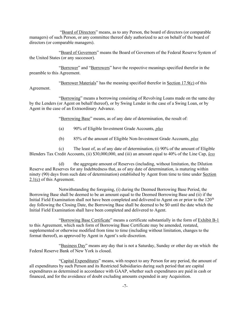 -7- “Board of Directors” means, as to any Person, the board of directors (or comparable managers) of such Person, or any committee thereof duly authorized to act on behalf of the board of directors (or comparable managers). “Board of Governors” means the Board of Governors of the Federal Reserve System of the United States (or any successor). “Borrower” and “Borrowers” have the respective meanings specified therefor in the preamble to this Agreement. “Borrower Materials” has the meaning specified therefor in Section 17.9(c) of this Agreement. “Borrowing” means a borrowing consisting of Revolving Loans made on the same day by the Lenders (or Agent on behalf thereof), or by Swing Lender in the case of a Swing Loan, or by Agent in the case of an Extraordinary Advance. “Borrowing Base” means, as of any date of determination, the result of: (a) 90% of Eligible Investment Grade Accounts, plus (b) 85% of the amount of Eligible Non-Investment Grade Accounts, plus (c) The least of, as of any date of determination, (i) 90% of the amount of Eligible Blenders Tax Credit Accounts, (ii) $30,000,000, and (iii) an amount equal to 40% of the Line Cap, less (d) the aggregate amount of Reserves (including, without limitation, the Dilution Reserve and Reserves for any Indebtedness that, as of any date of determination, is maturing within ninety (90) days from such date of determination) established by Agent from time to time under Section 2.1(c) of this Agreement. Notwithstanding the foregoing, (i) during the Deemed Borrowing Base Period, the Borrowing Base shall be deemed to be an amount equal to the Deemed Borrowing Base and (ii) if the Initial Field Examination shall not have been completed and delivered to Agent on or prior to the 120th day following the Closing Date, the Borrowing Base shall be deemed to be $0 until the date which the Initial Field Examination shall have been completed and delivered to Agent. “Borrowing Base Certificate” means a certificate substantially in the form of Exhibit B-1 to this Agreement, which such form of Borrowing Base Certificate may be amended, restated, supplemented or otherwise modified from time to time (including without limitation, changes to the format thereof), as approved by Agent in Agent’s sole discretion. “Business Day” means any day that is not a Saturday, Sunday or other day on which the Federal Reserve Bank of New York is closed. “Capital Expenditures” means, with respect to any Person for any period, the amount of all expenditures by such Person and its Restricted Subsidiaries during such period that are capital expenditures as determined in accordance with GAAP, whether such expenditures are paid in cash or financed, and for the avoidance of doubt excluding amounts expended in any Acquisition.