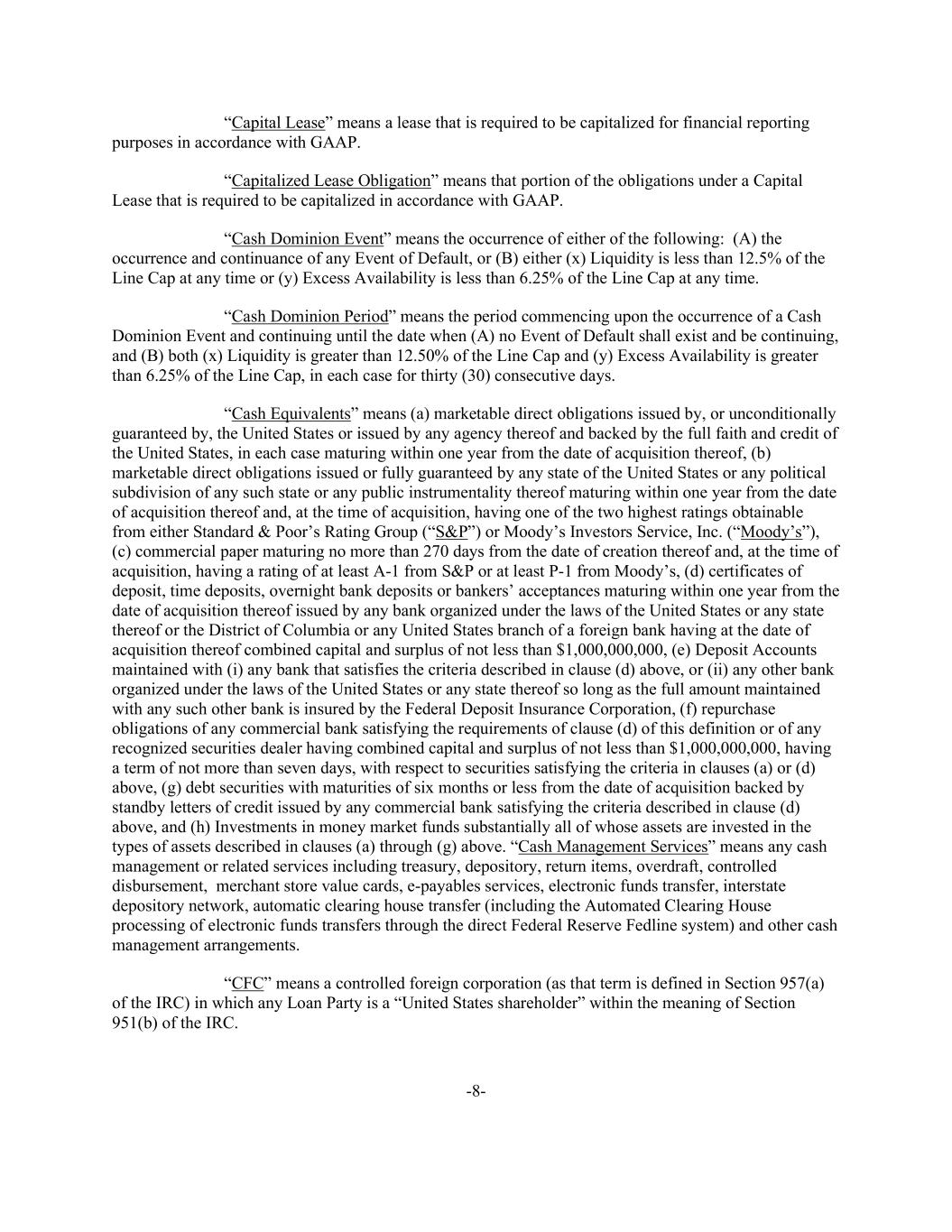 -8- “Capital Lease” means a lease that is required to be capitalized for financial reporting purposes in accordance with GAAP. “Capitalized Lease Obligation” means that portion of the obligations under a Capital Lease that is required to be capitalized in accordance with GAAP. “Cash Dominion Event” means the occurrence of either of the following: (A) the occurrence and continuance of any Event of Default, or (B) either (x) Liquidity is less than 12.5% of the Line Cap at any time or (y) Excess Availability is less than 6.25% of the Line Cap at any time. “Cash Dominion Period” means the period commencing upon the occurrence of a Cash Dominion Event and continuing until the date when (A) no Event of Default shall exist and be continuing, and (B) both (x) Liquidity is greater than 12.50% of the Line Cap and (y) Excess Availability is greater than 6.25% of the Line Cap, in each case for thirty (30) consecutive days. “Cash Equivalents” means (a) marketable direct obligations issued by, or unconditionally guaranteed by, the United States or issued by any agency thereof and backed by the full faith and credit of the United States, in each case maturing within one year from the date of acquisition thereof, (b) marketable direct obligations issued or fully guaranteed by any state of the United States or any political subdivision of any such state or any public instrumentality thereof maturing within one year from the date of acquisition thereof and, at the time of acquisition, having one of the two highest ratings obtainable from either Standard & Poor’s Rating Group (“S&P”) or Moody’s Investors Service, Inc. (“Moody’s”), (c) commercial paper maturing no more than 270 days from the date of creation thereof and, at the time of acquisition, having a rating of at least A-1 from S&P or at least P-1 from Moody’s, (d) certificates of deposit, time deposits, overnight bank deposits or bankers’ acceptances maturing within one year from the date of acquisition thereof issued by any bank organized under the laws of the United States or any state thereof or the District of Columbia or any United States branch of a foreign bank having at the date of acquisition thereof combined capital and surplus of not less than $1,000,000,000, (e) Deposit Accounts maintained with (i) any bank that satisfies the criteria described in clause (d) above, or (ii) any other bank organized under the laws of the United States or any state thereof so long as the full amount maintained with any such other bank is insured by the Federal Deposit Insurance Corporation, (f) repurchase obligations of any commercial bank satisfying the requirements of clause (d) of this definition or of any recognized securities dealer having combined capital and surplus of not less than $1,000,000,000, having a term of not more than seven days, with respect to securities satisfying the criteria in clauses (a) or (d) above, (g) debt securities with maturities of six months or less from the date of acquisition backed by standby letters of credit issued by any commercial bank satisfying the criteria described in clause (d) above, and (h) Investments in money market funds substantially all of whose assets are invested in the types of assets described in clauses (a) through (g) above. “Cash Management Services” means any cash management or related services including treasury, depository, return items, overdraft, controlled disbursement, merchant store value cards, e-payables services, electronic funds transfer, interstate depository network, automatic clearing house transfer (including the Automated Clearing House processing of electronic funds transfers through the direct Federal Reserve Fedline system) and other cash management arrangements. “CFC” means a controlled foreign corporation (as that term is defined in Section 957(a) of the IRC) in which any Loan Party is a “United States shareholder” within the meaning of Section 951(b) of the IRC.