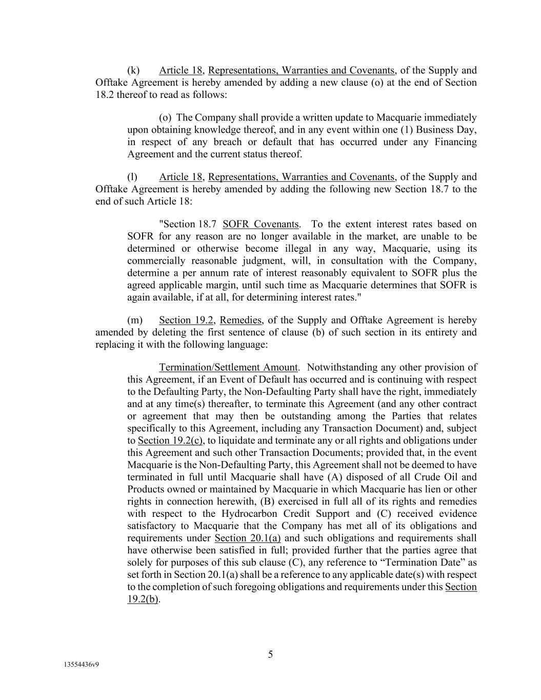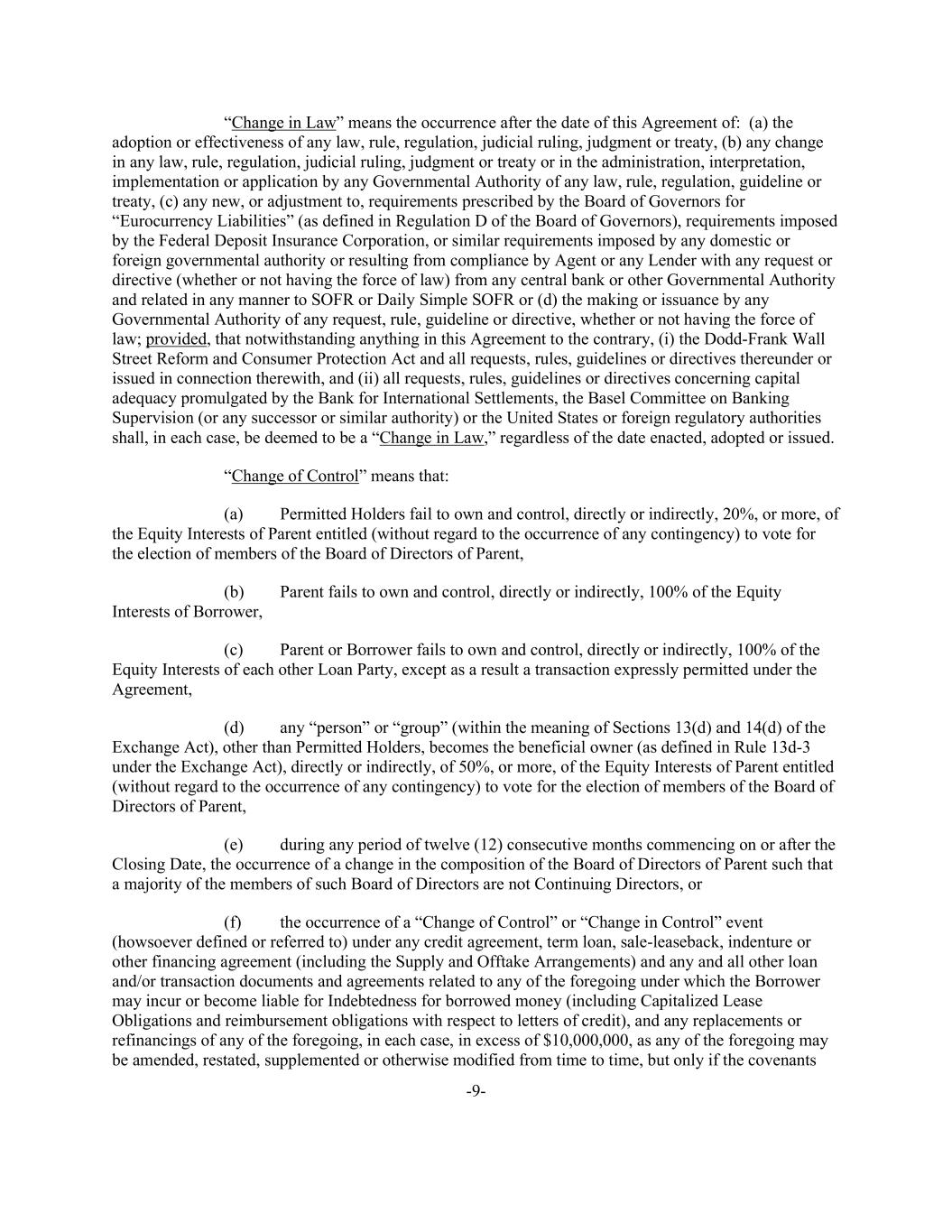 -9- “Change in Law” means the occurrence after the date of this Agreement of: (a) the adoption or effectiveness of any law, rule, regulation, judicial ruling, judgment or treaty, (b) any change in any law, rule, regulation, judicial ruling, judgment or treaty or in the administration, interpretation, implementation or application by any Governmental Authority of any law, rule, regulation, guideline or treaty, (c) any new, or adjustment to, requirements prescribed by the Board of Governors for “Eurocurrency Liabilities” (as defined in Regulation D of the Board of Governors), requirements imposed by the Federal Deposit Insurance Corporation, or similar requirements imposed by any domestic or foreign governmental authority or resulting from compliance by Agent or any Lender with any request or directive (whether or not having the force of law) from any central bank or other Governmental Authority and related in any manner to SOFR or Daily Simple SOFR or (d) the making or issuance by any Governmental Authority of any request, rule, guideline or directive, whether or not having the force of law; provided, that notwithstanding anything in this Agreement to the contrary, (i) the Dodd-Frank Wall Street Reform and Consumer Protection Act and all requests, rules, guidelines or directives thereunder or issued in connection therewith, and (ii) all requests, rules, guidelines or directives concerning capital adequacy promulgated by the Bank for International Settlements, the Basel Committee on Banking Supervision (or any successor or similar authority) or the United States or foreign regulatory authorities shall, in each case, be deemed to be a “Change in Law,” regardless of the date enacted, adopted or issued. “Change of Control” means that: (a) Permitted Holders fail to own and control, directly or indirectly, 20%, or more, of the Equity Interests of Parent entitled (without regard to the occurrence of any contingency) to vote for the election of members of the Board of Directors of Parent, (b) Parent fails to own and control, directly or indirectly, 100% of the Equity Interests of Borrower, (c) Parent or Borrower fails to own and control, directly or indirectly, 100% of the Equity Interests of each other Loan Party, except as a result a transaction expressly permitted under the Agreement, (d) any “person” or “group” (within the meaning of Sections 13(d) and 14(d) of the Exchange Act), other than Permitted Holders, becomes the beneficial owner (as defined in Rule 13d-3 under the Exchange Act), directly or indirectly, of 50%, or more, of the Equity Interests of Parent entitled (without regard to the occurrence of any contingency) to vote for the election of members of the Board of Directors of Parent, (e) during any period of twelve (12) consecutive months commencing on or after the Closing Date, the occurrence of a change in the composition of the Board of Directors of Parent such that a majority of the members of such Board of Directors are not Continuing Directors, or (f) the occurrence of a “Change of Control” or “Change in Control” event (howsoever defined or referred to) under any credit agreement, term loan, sale-leaseback, indenture or other financing agreement (including the Supply and Offtake Arrangements) and any and all other loan and/or transaction documents and agreements related to any of the foregoing under which the Borrower may incur or become liable for Indebtedness for borrowed money (including Capitalized Lease Obligations and reimbursement obligations with respect to letters of credit), and any replacements or refinancings of any of the foregoing, in each case, in excess of $10,000,000, as any of the foregoing may be amended, restated, supplemented or otherwise modified from time to time, but only if the covenants