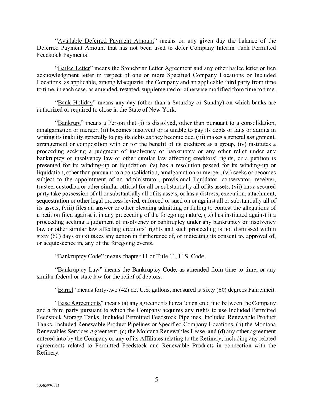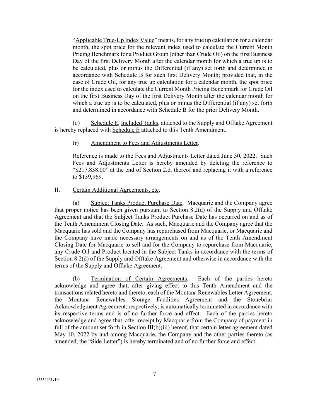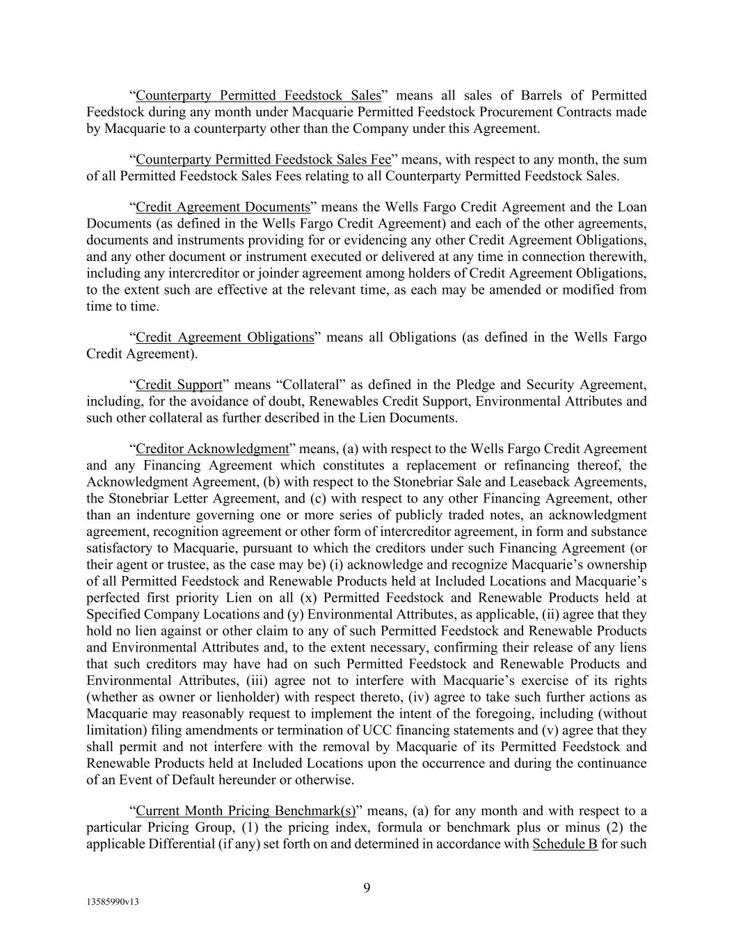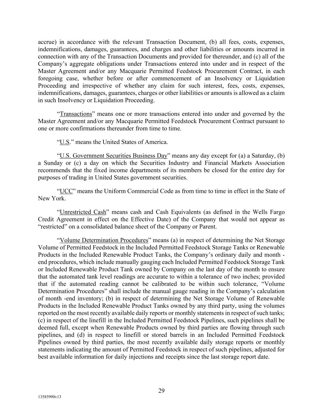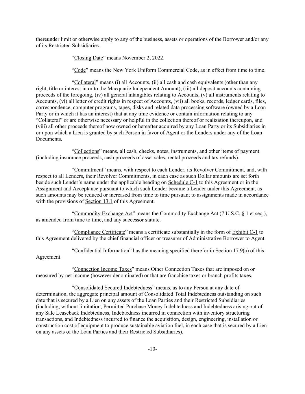 -10- thereunder limit or otherwise apply to any of the business, assets or operations of the Borrower and/or any of its Restricted Subsidiaries. “Closing Date” means November 2, 2022. “Code” means the New York Uniform Commercial Code, as in effect from time to time. “Collateral” means (i) all Accounts, (ii) all cash and cash equivalents (other than any right, title or interest in or to the Macquarie Independent Amount), (iii) all deposit accounts containing proceeds of the foregoing, (iv) all general intangibles relating to Accounts, (v) all instruments relating to Accounts, (vi) all letter of credit rights in respect of Accounts, (vii) all books, records, ledger cards, files, correspondence, computer programs, tapes, disks and related data processing software (owned by a Loan Party or in which it has an interest) that at any time evidence or contain information relating to any “Collateral” or are otherwise necessary or helpful in the collection thereof or realization thereupon, and (viii) all other proceeds thereof now owned or hereafter acquired by any Loan Party or its Subsidiaries in or upon which a Lien is granted by such Person in favor of Agent or the Lenders under any of the Loan Documents. “Collections” means, all cash, checks, notes, instruments, and other items of payment (including insurance proceeds, cash proceeds of asset sales, rental proceeds and tax refunds). “Commitment” means, with respect to each Lender, its Revolver Commitment, and, with respect to all Lenders, their Revolver Commitments, in each case as such Dollar amounts are set forth beside such Lender’s name under the applicable heading on Schedule C-1 to this Agreement or in the Assignment and Acceptance pursuant to which such Lender became a Lender under this Agreement, as such amounts may be reduced or increased from time to time pursuant to assignments made in accordance with the provisions of Section 13.1 of this Agreement. “Commodity Exchange Act” means the Commodity Exchange Act (7 U.S.C. § 1 et seq.), as amended from time to time, and any successor statute. “Compliance Certificate” means a certificate substantially in the form of Exhibit C-1 to this Agreement delivered by the chief financial officer or treasurer of Administrative Borrower to Agent. “Confidential Information” has the meaning specified therefor in Section 17.9(a) of this Agreement. “Connection Income Taxes” means Other Connection Taxes that are imposed on or measured by net income (however denominated) or that are franchise taxes or branch profits taxes. “Consolidated Secured Indebtedness” means, as to any Person at any date of determination, the aggregate principal amount of Consolidated Total Indebtedness outstanding on such date that is secured by a Lien on any assets of the Loan Parties and their Restricted Subsidiaries (including, without limitation, Permitted Purchase Money Indebtedness and Indebtedness arising out of any Sale Leaseback Indebtedness, Indebtedness incurred in connection with inventory structuring transactions, and Indebtedness incurred to finance the acquisition, design, engineering, installation or construction cost of equipment to produce sustainable aviation fuel, in each case that is secured by a Lien on any assets of the Loan Parties and their Restricted Subsidiaries).