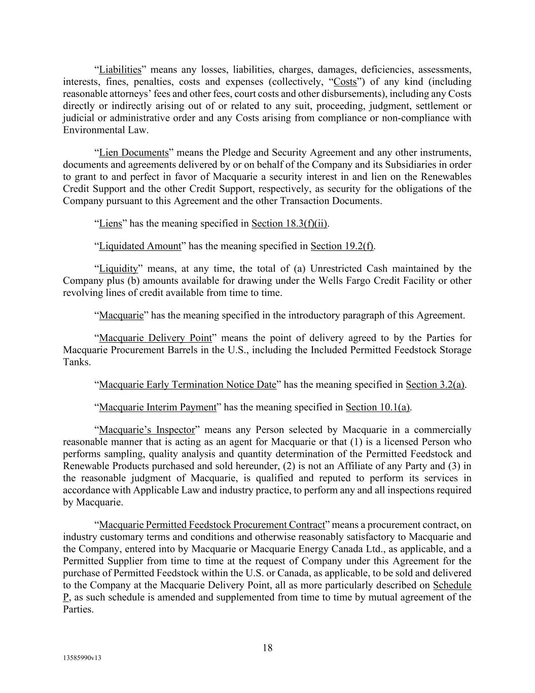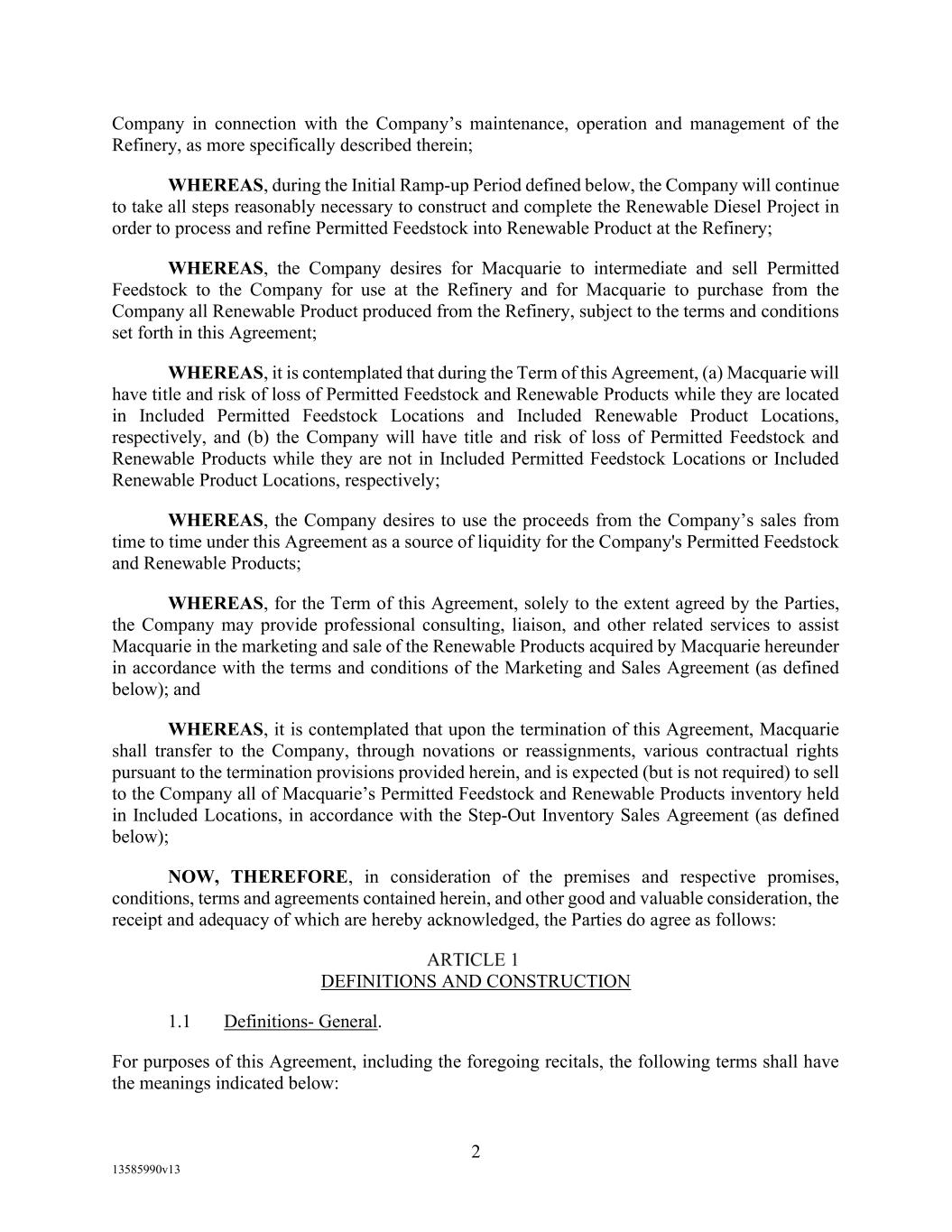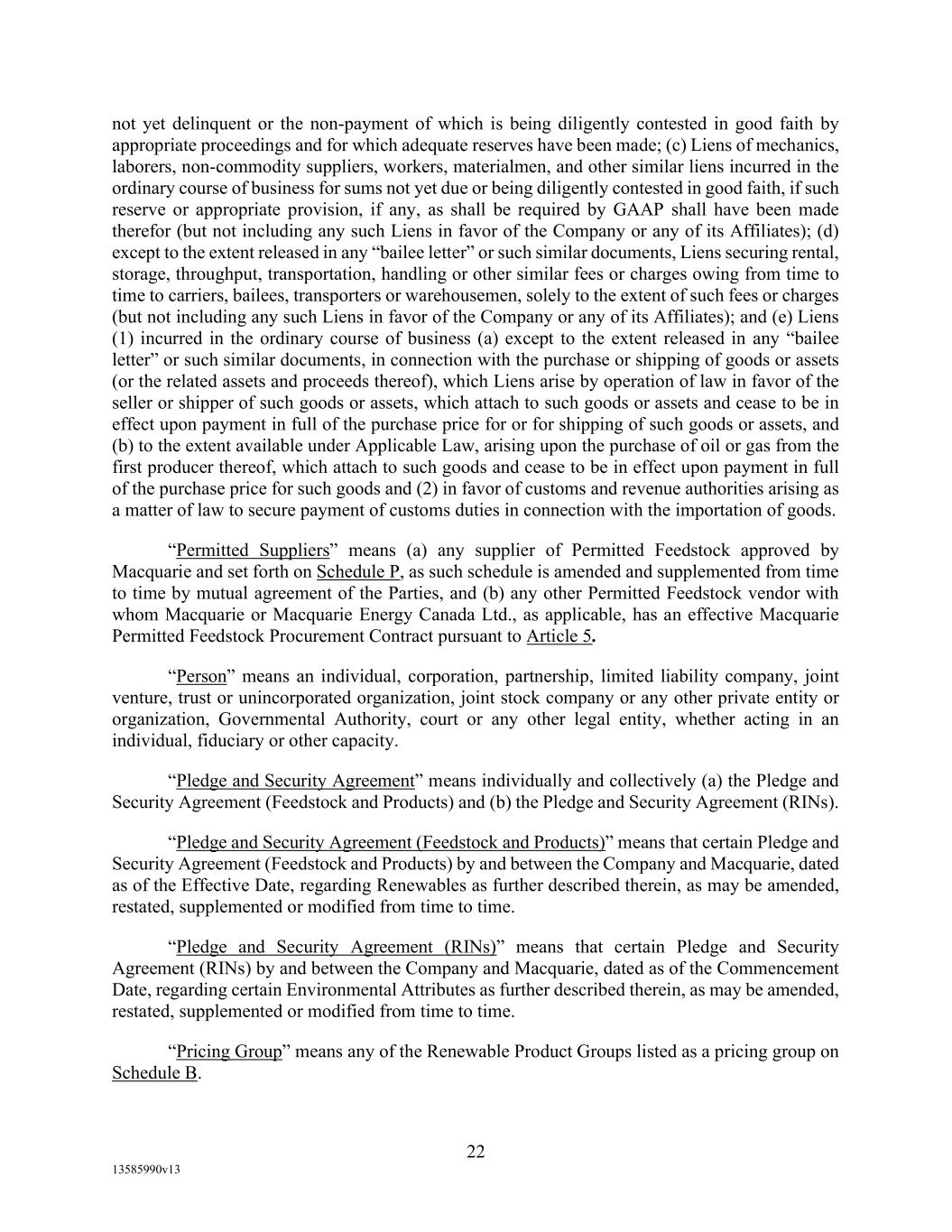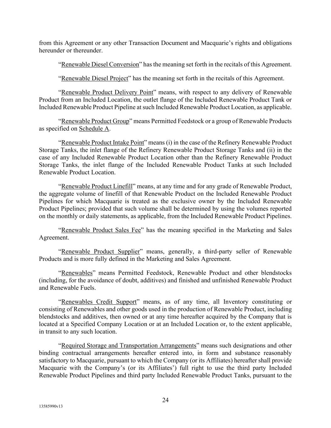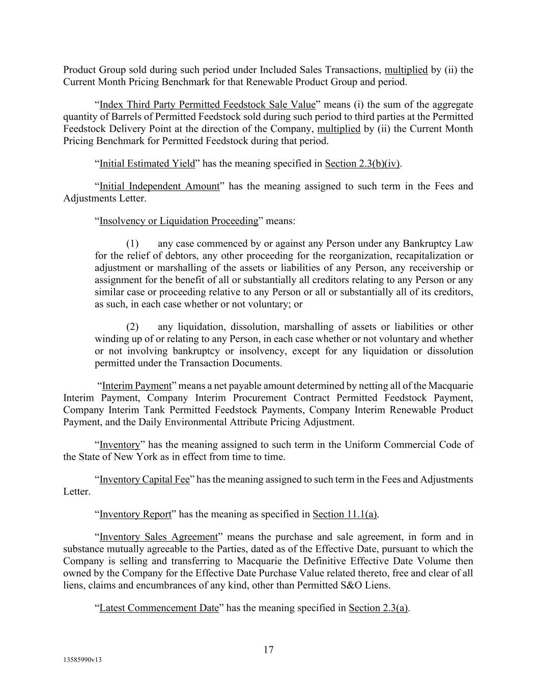 -10- thereunder limit or otherwise apply to any of the business, assets or operations of the Borrower and/or any of its Restricted Subsidiaries. “Closing Date” means November 2, 2022. “Code” means the New York Uniform Commercial Code, as in effect from time to time. “Collateral” means (i) all Accounts, (ii) all cash and cash equivalents (other than any right, title or interest in or to the Macquarie Independent Amount), (iii) all deposit accounts containing proceeds of the foregoing, (iv) all general intangibles relating to Accounts, (v) all instruments relating to Accounts, (vi) all letter of credit rights in respect of Accounts, (vii) all books, records, ledger cards, files, correspondence, computer programs, tapes, disks and related data processing software (owned by a Loan Party or in which it has an interest) that at any time evidence or contain information relating to any “Collateral” or are otherwise necessary or helpful in the collection thereof or realization thereupon, and (viii) all other proceeds thereof now owned or hereafter acquired by any Loan Party or its Subsidiaries in or upon which a Lien is granted by such Person in favor of Agent or the Lenders under any of the Loan Documents. “Collections” means, all cash, checks, notes, instruments, and other items of payment (including insurance proceeds, cash proceeds of asset sales, rental proceeds and tax refunds). “Commitment” means, with respect to each Lender, its Revolver Commitment, and, with respect to all Lenders, their Revolver Commitments, in each case as such Dollar amounts are set forth beside such Lender’s name under the applicable heading on Schedule C-1 to this Agreement or in the Assignment and Acceptance pursuant to which such Lender became a Lender under this Agreement, as such amounts may be reduced or increased from time to time pursuant to assignments made in accordance with the provisions of Section 13.1 of this Agreement. “Commodity Exchange Act” means the Commodity Exchange Act (7 U.S.C. § 1 et seq.), as amended from time to time, and any successor statute. “Compliance Certificate” means a certificate substantially in the form of Exhibit C-1 to this Agreement delivered by the chief financial officer or treasurer of Administrative Borrower to Agent. “Confidential Information” has the meaning specified therefor in Section 17.9(a) of this Agreement. “Connection Income Taxes” means Other Connection Taxes that are imposed on or measured by net income (however denominated) or that are franchise taxes or branch profits taxes. “Consolidated Secured Indebtedness” means, as to any Person at any date of determination, the aggregate principal amount of Consolidated Total Indebtedness outstanding on such date that is secured by a Lien on any assets of the Loan Parties and their Restricted Subsidiaries (including, without limitation, Permitted Purchase Money Indebtedness and Indebtedness arising out of any Sale Leaseback Indebtedness, Indebtedness incurred in connection with inventory structuring transactions, and Indebtedness incurred to finance the acquisition, design, engineering, installation or construction cost of equipment to produce sustainable aviation fuel, in each case that is secured by a Lien on any assets of the Loan Parties and their Restricted Subsidiaries).