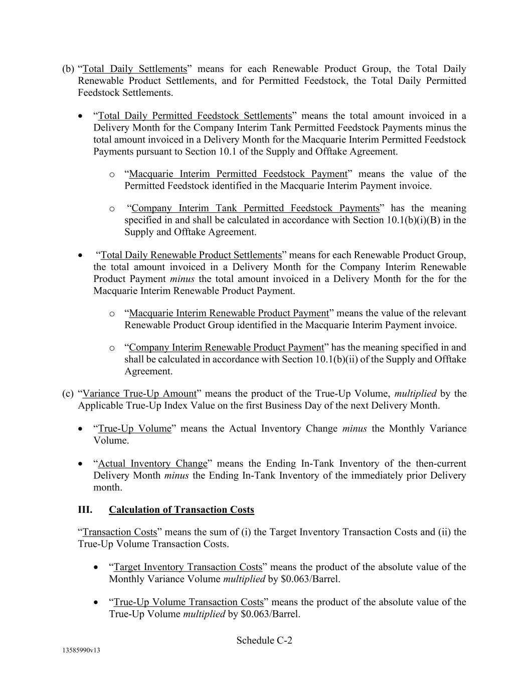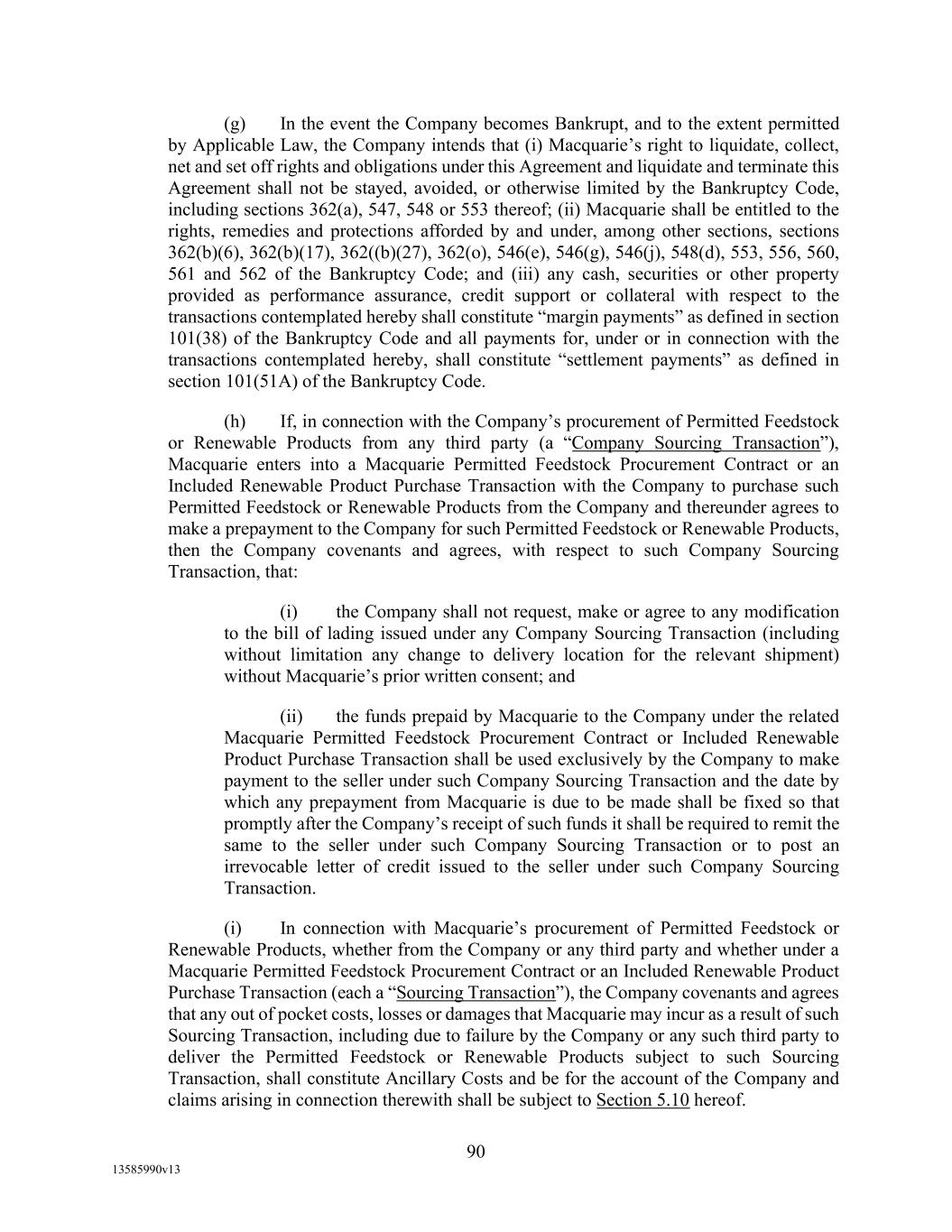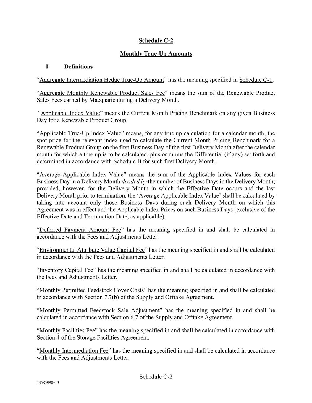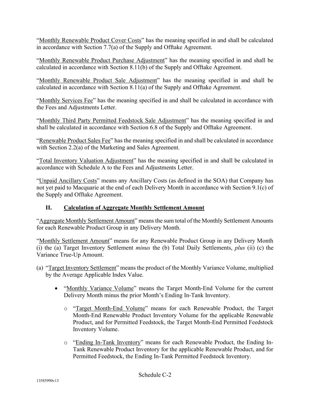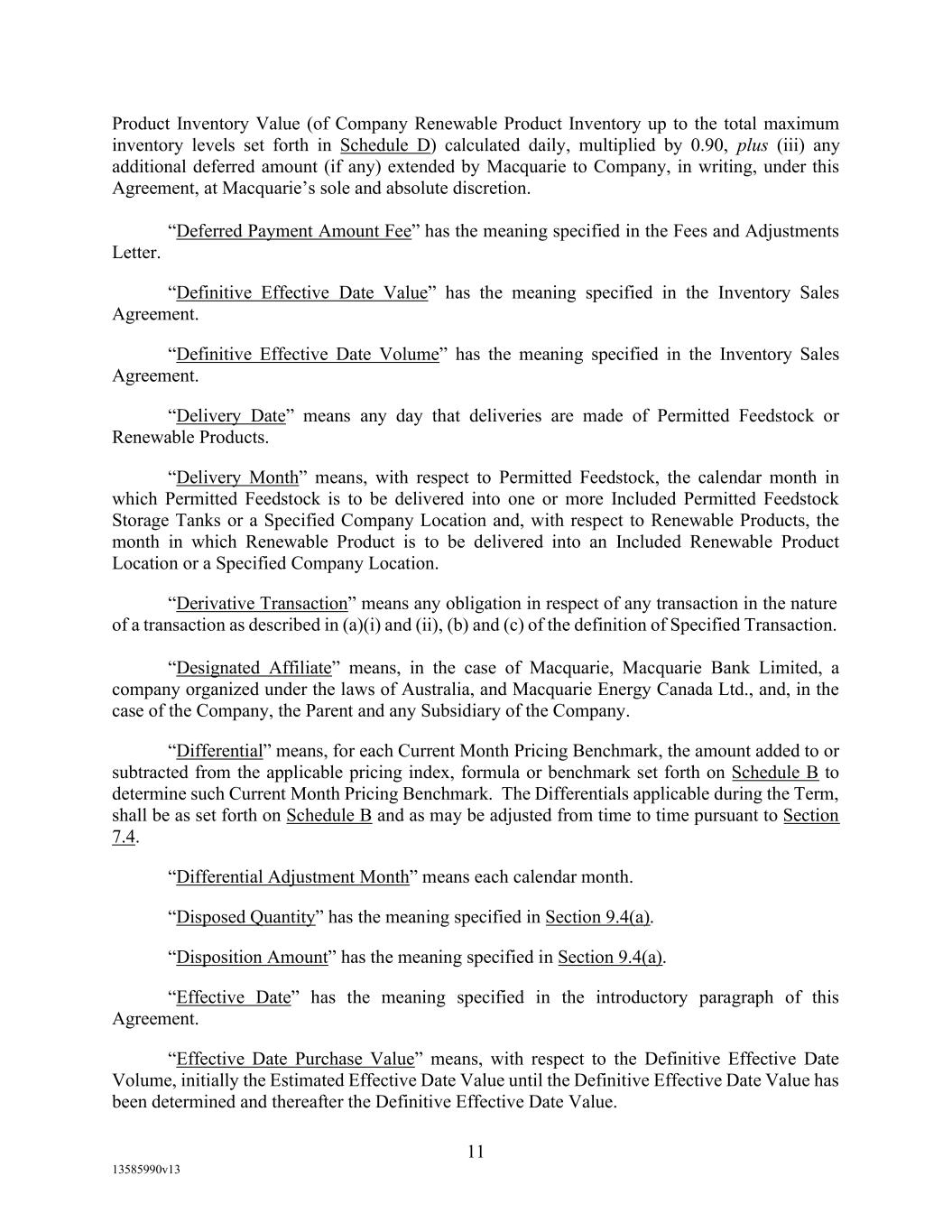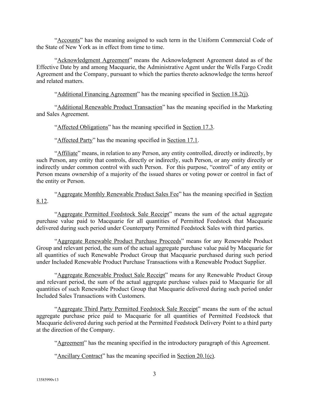 -10- thereunder limit or otherwise apply to any of the business, assets or operations of the Borrower and/or any of its Restricted Subsidiaries. “Closing Date” means November 2, 2022. “Code” means the New York Uniform Commercial Code, as in effect from time to time. “Collateral” means (i) all Accounts, (ii) all cash and cash equivalents (other than any right, title or interest in or to the Macquarie Independent Amount), (iii) all deposit accounts containing proceeds of the foregoing, (iv) all general intangibles relating to Accounts, (v) all instruments relating to Accounts, (vi) all letter of credit rights in respect of Accounts, (vii) all books, records, ledger cards, files, correspondence, computer programs, tapes, disks and related data processing software (owned by a Loan Party or in which it has an interest) that at any time evidence or contain information relating to any “Collateral” or are otherwise necessary or helpful in the collection thereof or realization thereupon, and (viii) all other proceeds thereof now owned or hereafter acquired by any Loan Party or its Subsidiaries in or upon which a Lien is granted by such Person in favor of Agent or the Lenders under any of the Loan Documents. “Collections” means, all cash, checks, notes, instruments, and other items of payment (including insurance proceeds, cash proceeds of asset sales, rental proceeds and tax refunds). “Commitment” means, with respect to each Lender, its Revolver Commitment, and, with respect to all Lenders, their Revolver Commitments, in each case as such Dollar amounts are set forth beside such Lender’s name under the applicable heading on Schedule C-1 to this Agreement or in the Assignment and Acceptance pursuant to which such Lender became a Lender under this Agreement, as such amounts may be reduced or increased from time to time pursuant to assignments made in accordance with the provisions of Section 13.1 of this Agreement. “Commodity Exchange Act” means the Commodity Exchange Act (7 U.S.C. § 1 et seq.), as amended from time to time, and any successor statute. “Compliance Certificate” means a certificate substantially in the form of Exhibit C-1 to this Agreement delivered by the chief financial officer or treasurer of Administrative Borrower to Agent. “Confidential Information” has the meaning specified therefor in Section 17.9(a) of this Agreement. “Connection Income Taxes” means Other Connection Taxes that are imposed on or measured by net income (however denominated) or that are franchise taxes or branch profits taxes. “Consolidated Secured Indebtedness” means, as to any Person at any date of determination, the aggregate principal amount of Consolidated Total Indebtedness outstanding on such date that is secured by a Lien on any assets of the Loan Parties and their Restricted Subsidiaries (including, without limitation, Permitted Purchase Money Indebtedness and Indebtedness arising out of any Sale Leaseback Indebtedness, Indebtedness incurred in connection with inventory structuring transactions, and Indebtedness incurred to finance the acquisition, design, engineering, installation or construction cost of equipment to produce sustainable aviation fuel, in each case that is secured by a Lien on any assets of the Loan Parties and their Restricted Subsidiaries).