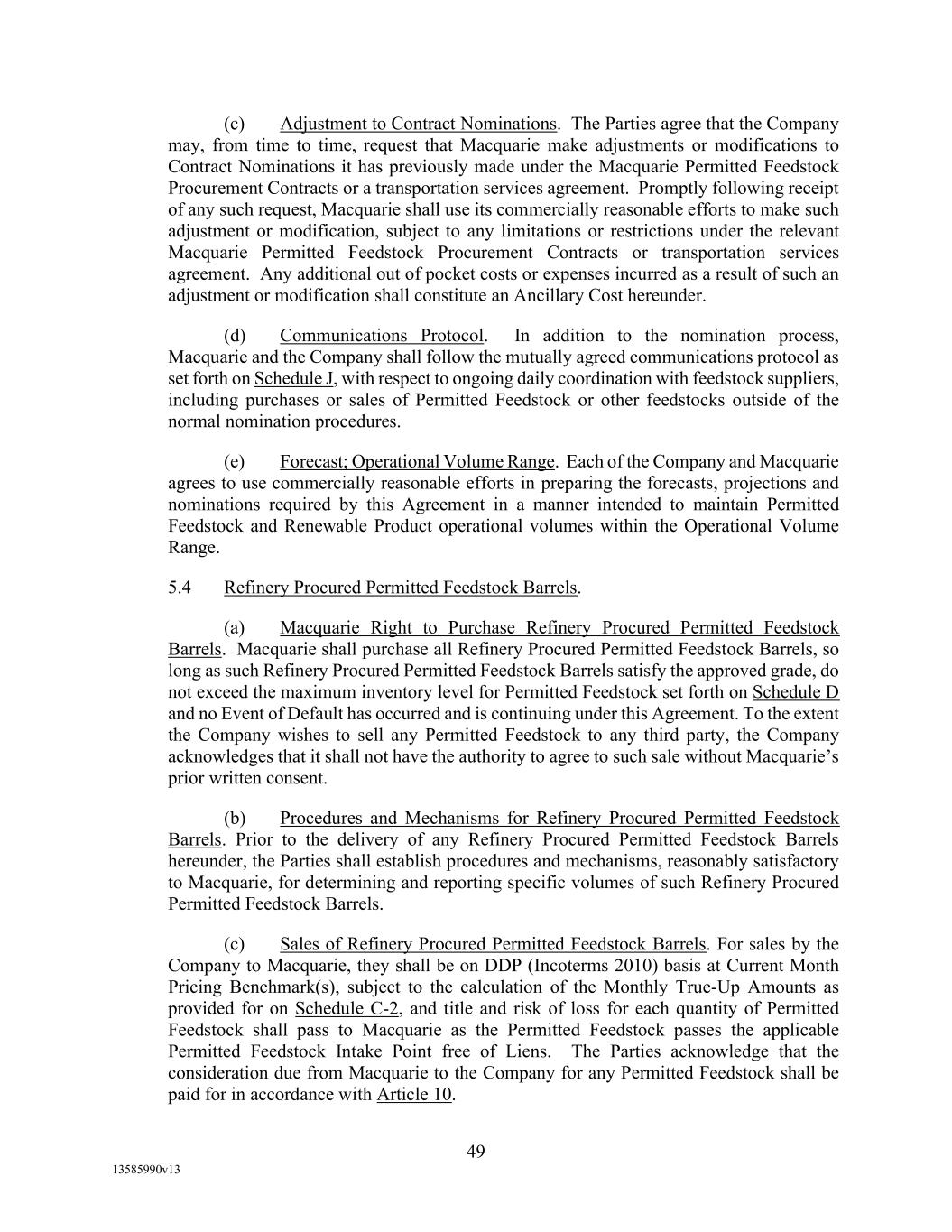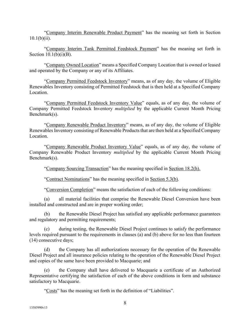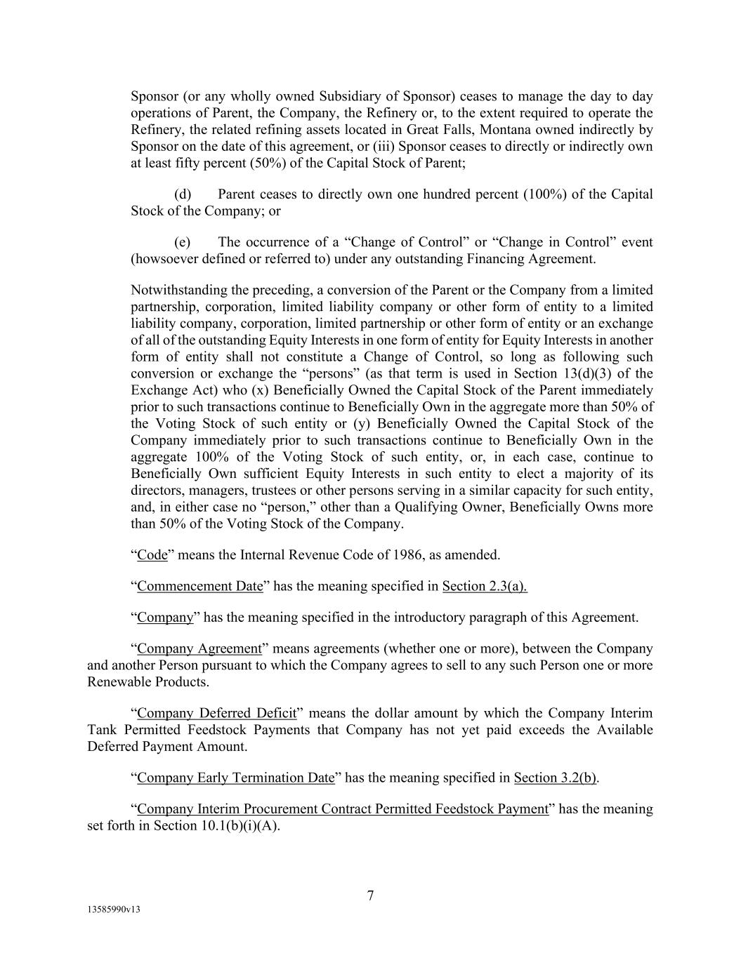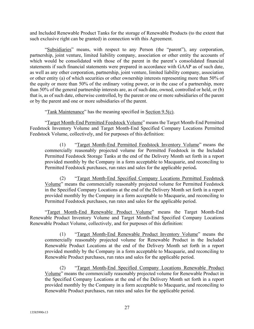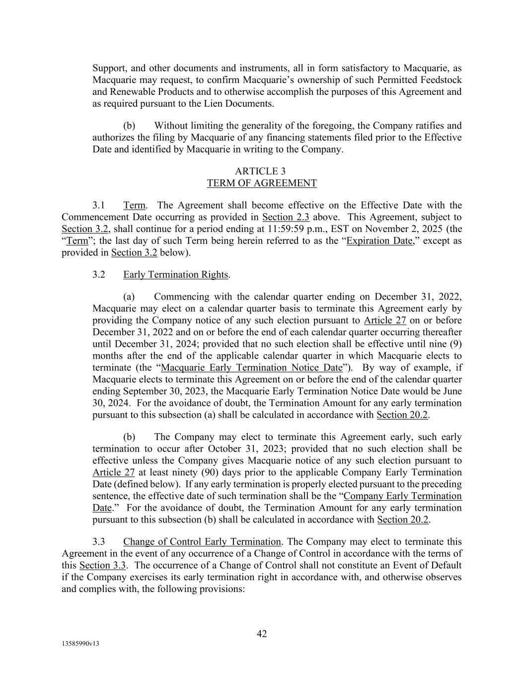 -10- thereunder limit or otherwise apply to any of the business, assets or operations of the Borrower and/or any of its Restricted Subsidiaries. “Closing Date” means November 2, 2022. “Code” means the New York Uniform Commercial Code, as in effect from time to time. “Collateral” means (i) all Accounts, (ii) all cash and cash equivalents (other than any right, title or interest in or to the Macquarie Independent Amount), (iii) all deposit accounts containing proceeds of the foregoing, (iv) all general intangibles relating to Accounts, (v) all instruments relating to Accounts, (vi) all letter of credit rights in respect of Accounts, (vii) all books, records, ledger cards, files, correspondence, computer programs, tapes, disks and related data processing software (owned by a Loan Party or in which it has an interest) that at any time evidence or contain information relating to any “Collateral” or are otherwise necessary or helpful in the collection thereof or realization thereupon, and (viii) all other proceeds thereof now owned or hereafter acquired by any Loan Party or its Subsidiaries in or upon which a Lien is granted by such Person in favor of Agent or the Lenders under any of the Loan Documents. “Collections” means, all cash, checks, notes, instruments, and other items of payment (including insurance proceeds, cash proceeds of asset sales, rental proceeds and tax refunds). “Commitment” means, with respect to each Lender, its Revolver Commitment, and, with respect to all Lenders, their Revolver Commitments, in each case as such Dollar amounts are set forth beside such Lender’s name under the applicable heading on Schedule C-1 to this Agreement or in the Assignment and Acceptance pursuant to which such Lender became a Lender under this Agreement, as such amounts may be reduced or increased from time to time pursuant to assignments made in accordance with the provisions of Section 13.1 of this Agreement. “Commodity Exchange Act” means the Commodity Exchange Act (7 U.S.C. § 1 et seq.), as amended from time to time, and any successor statute. “Compliance Certificate” means a certificate substantially in the form of Exhibit C-1 to this Agreement delivered by the chief financial officer or treasurer of Administrative Borrower to Agent. “Confidential Information” has the meaning specified therefor in Section 17.9(a) of this Agreement. “Connection Income Taxes” means Other Connection Taxes that are imposed on or measured by net income (however denominated) or that are franchise taxes or branch profits taxes. “Consolidated Secured Indebtedness” means, as to any Person at any date of determination, the aggregate principal amount of Consolidated Total Indebtedness outstanding on such date that is secured by a Lien on any assets of the Loan Parties and their Restricted Subsidiaries (including, without limitation, Permitted Purchase Money Indebtedness and Indebtedness arising out of any Sale Leaseback Indebtedness, Indebtedness incurred in connection with inventory structuring transactions, and Indebtedness incurred to finance the acquisition, design, engineering, installation or construction cost of equipment to produce sustainable aviation fuel, in each case that is secured by a Lien on any assets of the Loan Parties and their Restricted Subsidiaries).