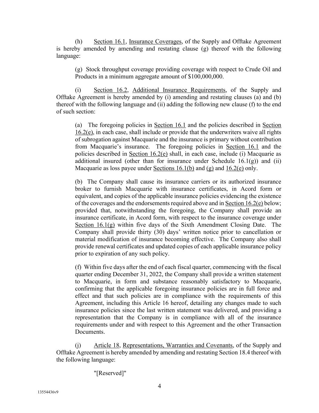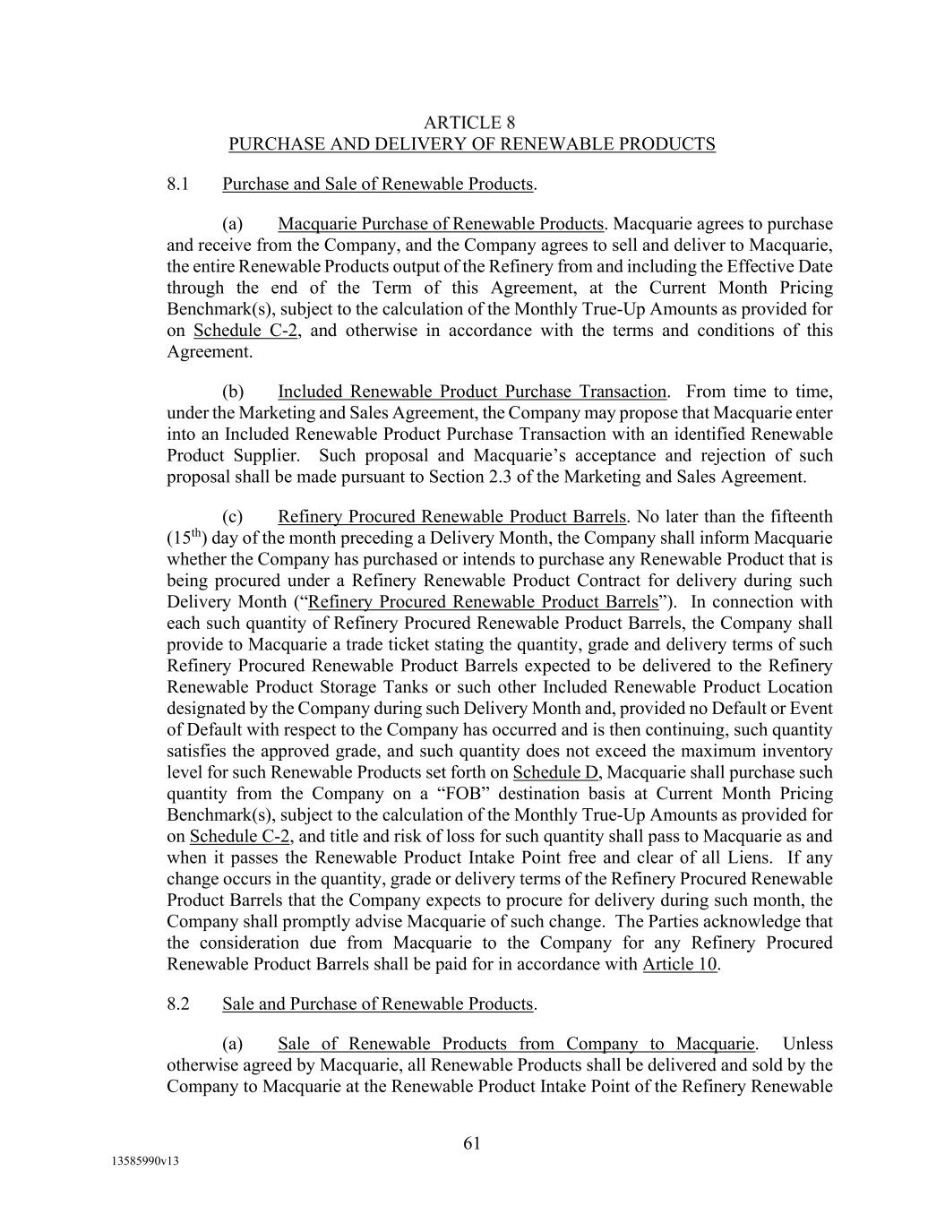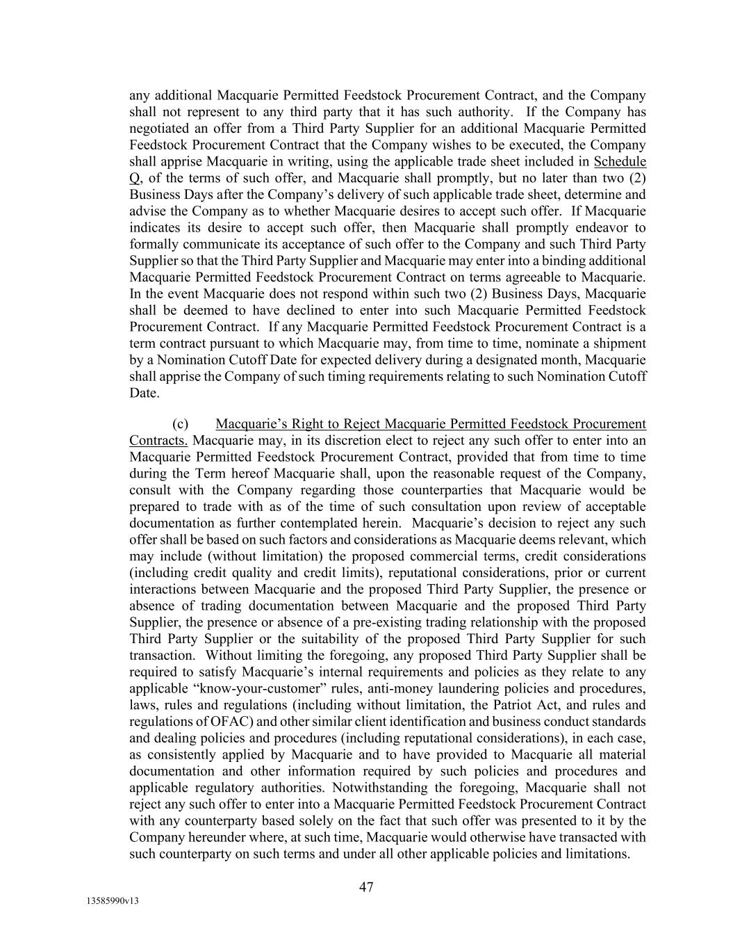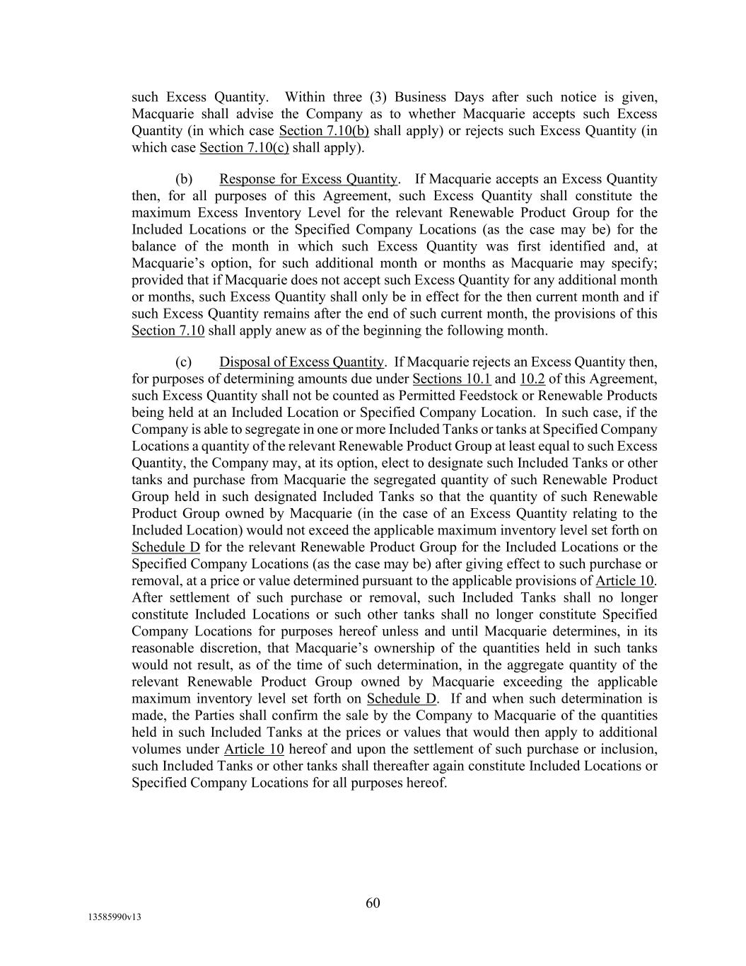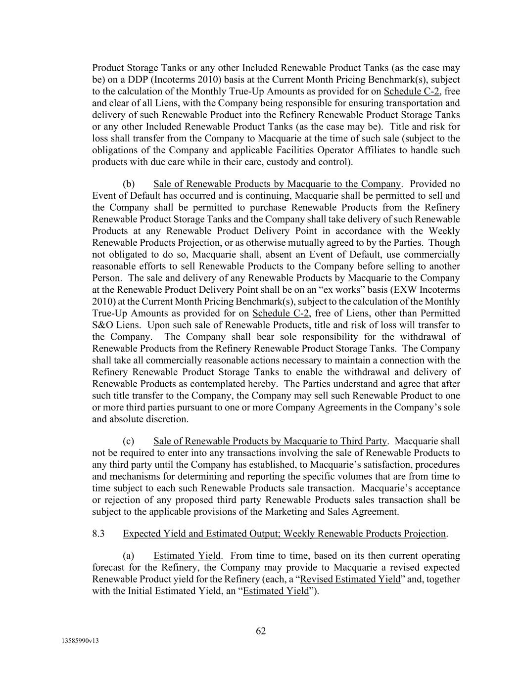 -10- thereunder limit or otherwise apply to any of the business, assets or operations of the Borrower and/or any of its Restricted Subsidiaries. “Closing Date” means November 2, 2022. “Code” means the New York Uniform Commercial Code, as in effect from time to time. “Collateral” means (i) all Accounts, (ii) all cash and cash equivalents (other than any right, title or interest in or to the Macquarie Independent Amount), (iii) all deposit accounts containing proceeds of the foregoing, (iv) all general intangibles relating to Accounts, (v) all instruments relating to Accounts, (vi) all letter of credit rights in respect of Accounts, (vii) all books, records, ledger cards, files, correspondence, computer programs, tapes, disks and related data processing software (owned by a Loan Party or in which it has an interest) that at any time evidence or contain information relating to any “Collateral” or are otherwise necessary or helpful in the collection thereof or realization thereupon, and (viii) all other proceeds thereof now owned or hereafter acquired by any Loan Party or its Subsidiaries in or upon which a Lien is granted by such Person in favor of Agent or the Lenders under any of the Loan Documents. “Collections” means, all cash, checks, notes, instruments, and other items of payment (including insurance proceeds, cash proceeds of asset sales, rental proceeds and tax refunds). “Commitment” means, with respect to each Lender, its Revolver Commitment, and, with respect to all Lenders, their Revolver Commitments, in each case as such Dollar amounts are set forth beside such Lender’s name under the applicable heading on Schedule C-1 to this Agreement or in the Assignment and Acceptance pursuant to which such Lender became a Lender under this Agreement, as such amounts may be reduced or increased from time to time pursuant to assignments made in accordance with the provisions of Section 13.1 of this Agreement. “Commodity Exchange Act” means the Commodity Exchange Act (7 U.S.C. § 1 et seq.), as amended from time to time, and any successor statute. “Compliance Certificate” means a certificate substantially in the form of Exhibit C-1 to this Agreement delivered by the chief financial officer or treasurer of Administrative Borrower to Agent. “Confidential Information” has the meaning specified therefor in Section 17.9(a) of this Agreement. “Connection Income Taxes” means Other Connection Taxes that are imposed on or measured by net income (however denominated) or that are franchise taxes or branch profits taxes. “Consolidated Secured Indebtedness” means, as to any Person at any date of determination, the aggregate principal amount of Consolidated Total Indebtedness outstanding on such date that is secured by a Lien on any assets of the Loan Parties and their Restricted Subsidiaries (including, without limitation, Permitted Purchase Money Indebtedness and Indebtedness arising out of any Sale Leaseback Indebtedness, Indebtedness incurred in connection with inventory structuring transactions, and Indebtedness incurred to finance the acquisition, design, engineering, installation or construction cost of equipment to produce sustainable aviation fuel, in each case that is secured by a Lien on any assets of the Loan Parties and their Restricted Subsidiaries).