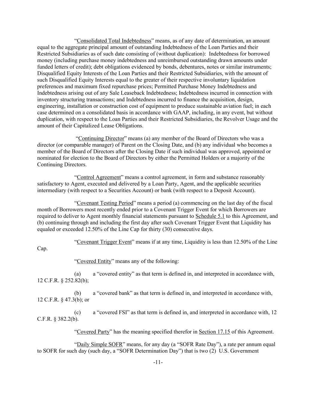 -11- “Consolidated Total Indebtedness” means, as of any date of determination, an amount equal to the aggregate principal amount of outstanding Indebtedness of the Loan Parties and their Restricted Subsidiaries as of such date consisting of (without duplication): Indebtedness for borrowed money (including purchase money indebtedness and unreimbursed outstanding drawn amounts under funded letters of credit); debt obligations evidenced by bonds, debentures, notes or similar instruments; Disqualified Equity Interests of the Loan Parties and their Restricted Subsidiaries, with the amount of such Disqualified Equity Interests equal to the greater of their respective involuntary liquidation preferences and maximum fixed repurchase prices; Permitted Purchase Money Indebtedness and Indebtedness arising out of any Sale Leaseback Indebtedness; Indebtedness incurred in connection with inventory structuring transactions; and Indebtedness incurred to finance the acquisition, design, engineering, installation or construction cost of equipment to produce sustainable aviation fuel; in each case determined on a consolidated basis in accordance with GAAP, including, in any event, but without duplication, with respect to the Loan Parties and their Restricted Subsidiaries, the Revolver Usage and the amount of their Capitalized Lease Obligations. “Continuing Director” means (a) any member of the Board of Directors who was a director (or comparable manager) of Parent on the Closing Date, and (b) any individual who becomes a member of the Board of Directors after the Closing Date if such individual was approved, appointed or nominated for election to the Board of Directors by either the Permitted Holders or a majority of the Continuing Directors. “Control Agreement” means a control agreement, in form and substance reasonably satisfactory to Agent, executed and delivered by a Loan Party, Agent, and the applicable securities intermediary (with respect to a Securities Account) or bank (with respect to a Deposit Account). “Covenant Testing Period” means a period (a) commencing on the last day of the fiscal month of Borrowers most recently ended prior to a Covenant Trigger Event for which Borrowers are required to deliver to Agent monthly financial statements pursuant to Schedule 5.1 to this Agreement, and (b) continuing through and including the first day after such Covenant Trigger Event that Liquidity has equaled or exceeded 12.50% of the Line Cap for thirty (30) consecutive days. “Covenant Trigger Event” means if at any time, Liquidity is less than 12.50% of the Line Cap. “Covered Entity” means any of the following: (a) a “covered entity” as that term is defined in, and interpreted in accordance with, 12 C.F.R. § 252.82(b); (b) a “covered bank” as that term is defined in, and interpreted in accordance with, 12 C.F.R. § 47.3(b); or (c) a “covered FSI” as that term is defined in, and interpreted in accordance with, 12 C.F.R. § 382.2(b). “Covered Party” has the meaning specified therefor in Section 17.15 of this Agreement. “Daily Simple SOFR” means, for any day (a “SOFR Rate Day”), a rate per annum equal to SOFR for such day (such day, a “SOFR Determination Day”) that is two (2) U.S. Government