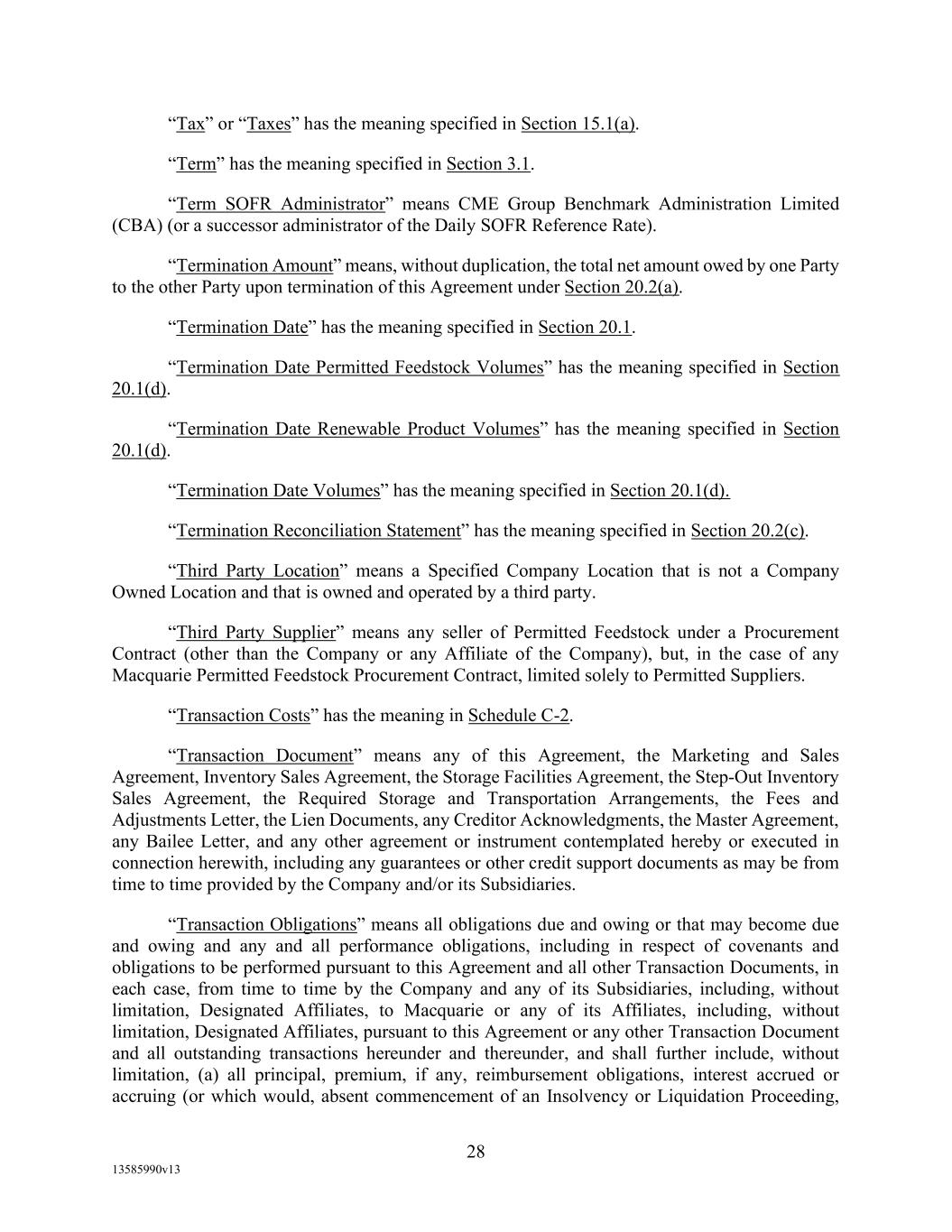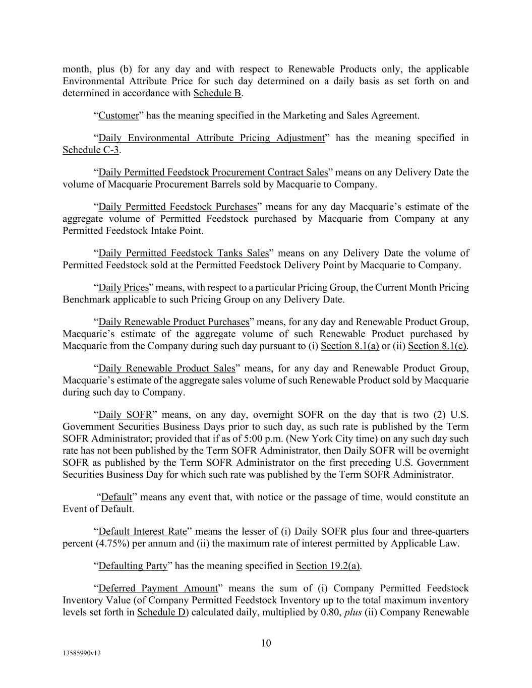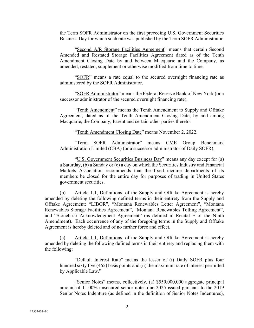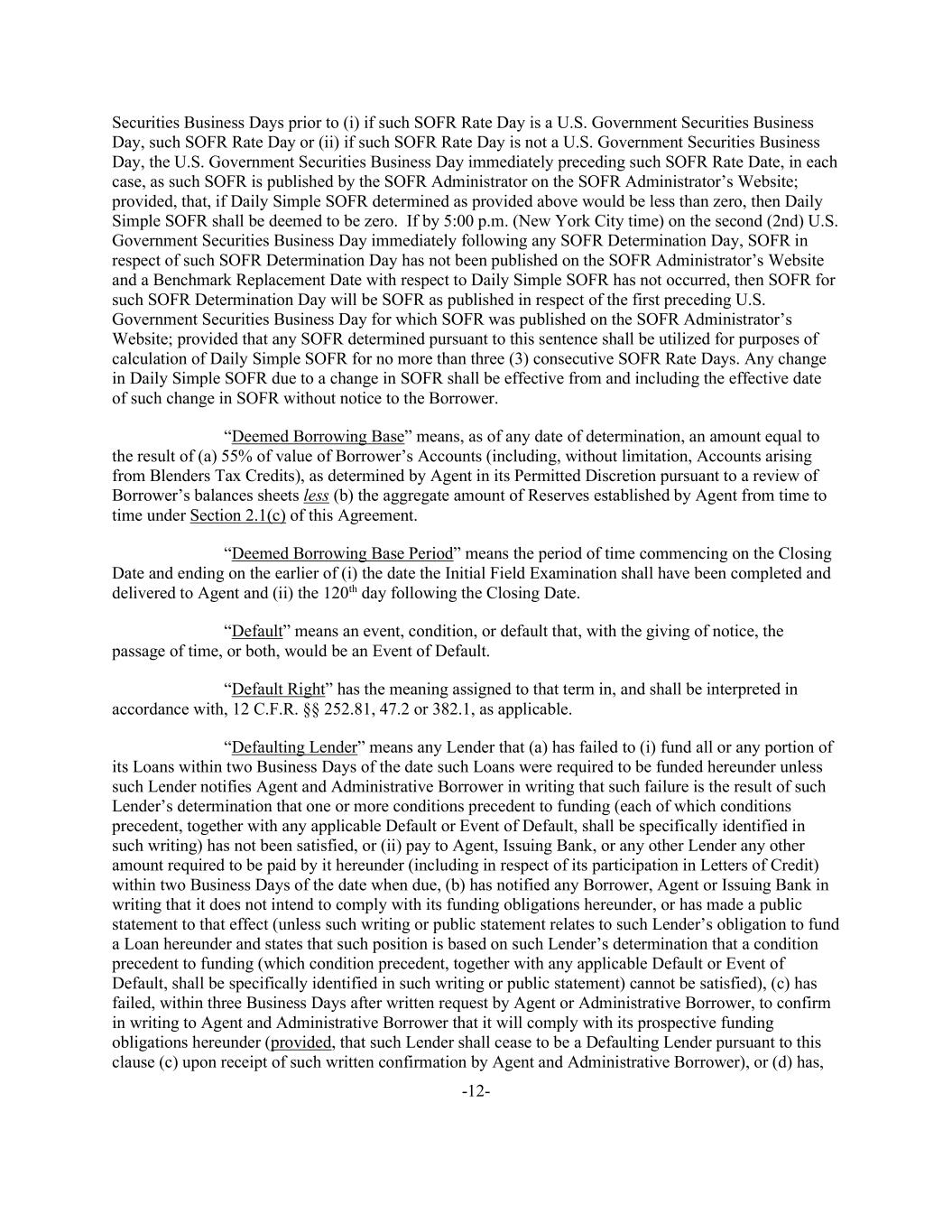 -12- Securities Business Days prior to (i) if such SOFR Rate Day is a U.S. Government Securities Business Day, such SOFR Rate Day or (ii) if such SOFR Rate Day is not a U.S. Government Securities Business Day, the U.S. Government Securities Business Day immediately preceding such SOFR Rate Date, in each case, as such SOFR is published by the SOFR Administrator on the SOFR Administrator’s Website; provided, that, if Daily Simple SOFR determined as provided above would be less than zero, then Daily Simple SOFR shall be deemed to be zero. If by 5:00 p.m. (New York City time) on the second (2nd) U.S. Government Securities Business Day immediately following any SOFR Determination Day, SOFR in respect of such SOFR Determination Day has not been published on the SOFR Administrator’s Website and a Benchmark Replacement Date with respect to Daily Simple SOFR has not occurred, then SOFR for such SOFR Determination Day will be SOFR as published in respect of the first preceding U.S. Government Securities Business Day for which SOFR was published on the SOFR Administrator’s Website; provided that any SOFR determined pursuant to this sentence shall be utilized for purposes of calculation of Daily Simple SOFR for no more than three (3) consecutive SOFR Rate Days. Any change in Daily Simple SOFR due to a change in SOFR shall be effective from and including the effective date of such change in SOFR without notice to the Borrower. “Deemed Borrowing Base” means, as of any date of determination, an amount equal to the result of (a) 55% of value of Borrower’s Accounts (including, without limitation, Accounts arising from Blenders Tax Credits), as determined by Agent in its Permitted Discretion pursuant to a review of Borrower’s balances sheets less (b) the aggregate amount of Reserves established by Agent from time to time under Section 2.1(c) of this Agreement. “Deemed Borrowing Base Period” means the period of time commencing on the Closing Date and ending on the earlier of (i) the date the Initial Field Examination shall have been completed and delivered to Agent and (ii) the 120th day following the Closing Date. “Default” means an event, condition, or default that, with the giving of notice, the passage of time, or both, would be an Event of Default. “Default Right” has the meaning assigned to that term in, and shall be interpreted in accordance with, 12 C.F.R. §§ 252.81, 47.2 or 382.1, as applicable. “Defaulting Lender” means any Lender that (a) has failed to (i) fund all or any portion of its Loans within two Business Days of the date such Loans were required to be funded hereunder unless such Lender notifies Agent and Administrative Borrower in writing that such failure is the result of such Lender’s determination that one or more conditions precedent to funding (each of which conditions precedent, together with any applicable Default or Event of Default, shall be specifically identified in such writing) has not been satisfied, or (ii) pay to Agent, Issuing Bank, or any other Lender any other amount required to be paid by it hereunder (including in respect of its participation in Letters of Credit) within two Business Days of the date when due, (b) has notified any Borrower, Agent or Issuing Bank in writing that it does not intend to comply with its funding obligations hereunder, or has made a public statement to that effect (unless such writing or public statement relates to such Lender’s obligation to fund a Loan hereunder and states that such position is based on such Lender’s determination that a condition precedent to funding (which condition precedent, together with any applicable Default or Event of Default, shall be specifically identified in such writing or public statement) cannot be satisfied), (c) has failed, within three Business Days after written request by Agent or Administrative Borrower, to confirm in writing to Agent and Administrative Borrower that it will comply with its prospective funding obligations hereunder (provided, that such Lender shall cease to be a Defaulting Lender pursuant to this clause (c) upon receipt of such written confirmation by Agent and Administrative Borrower), or (d) has,