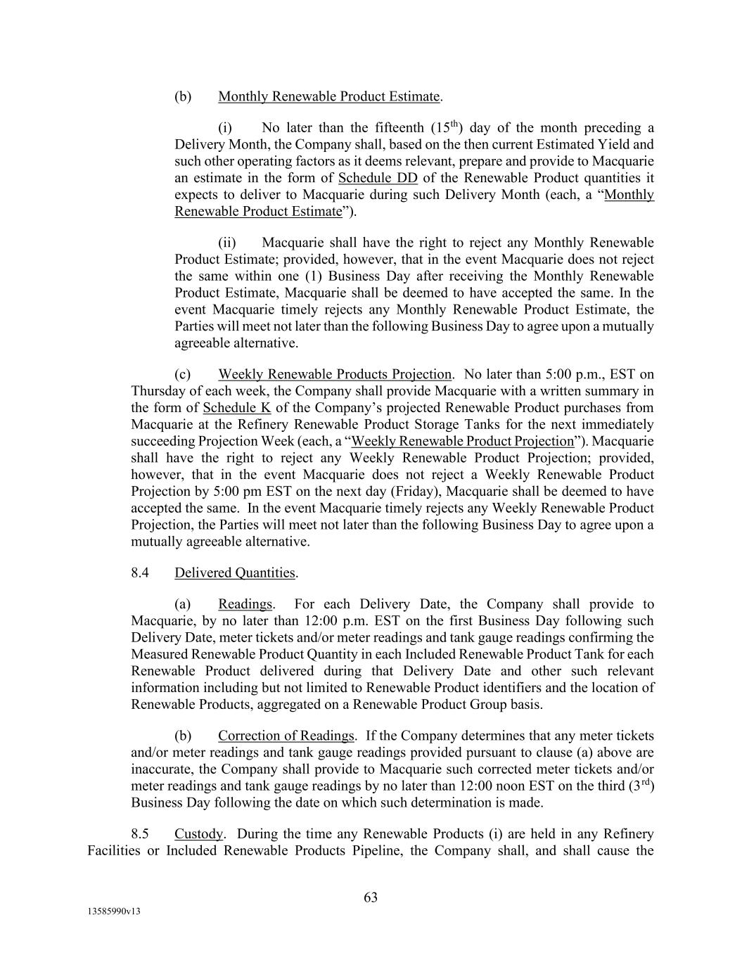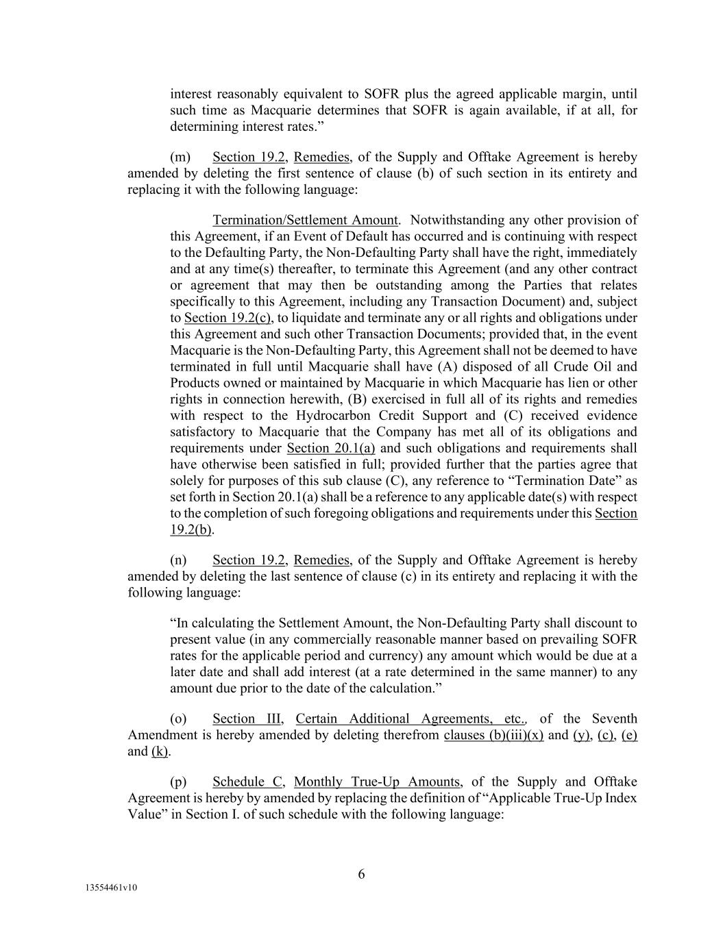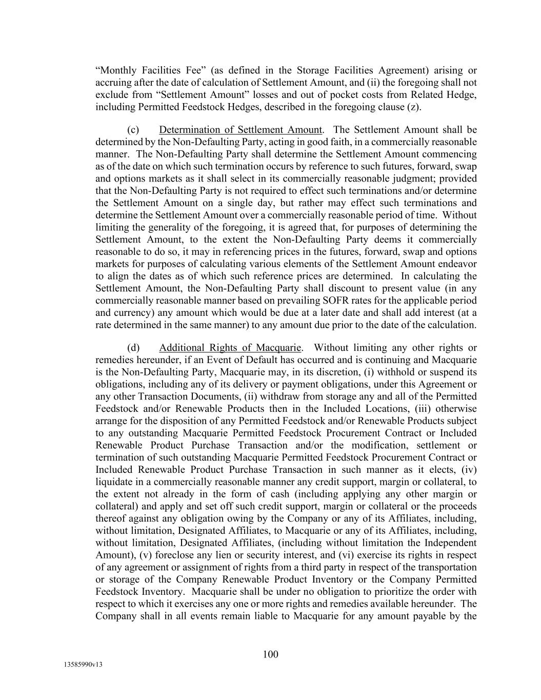 -12- Securities Business Days prior to (i) if such SOFR Rate Day is a U.S. Government Securities Business Day, such SOFR Rate Day or (ii) if such SOFR Rate Day is not a U.S. Government Securities Business Day, the U.S. Government Securities Business Day immediately preceding such SOFR Rate Date, in each case, as such SOFR is published by the SOFR Administrator on the SOFR Administrator’s Website; provided, that, if Daily Simple SOFR determined as provided above would be less than zero, then Daily Simple SOFR shall be deemed to be zero. If by 5:00 p.m. (New York City time) on the second (2nd) U.S. Government Securities Business Day immediately following any SOFR Determination Day, SOFR in respect of such SOFR Determination Day has not been published on the SOFR Administrator’s Website and a Benchmark Replacement Date with respect to Daily Simple SOFR has not occurred, then SOFR for such SOFR Determination Day will be SOFR as published in respect of the first preceding U.S. Government Securities Business Day for which SOFR was published on the SOFR Administrator’s Website; provided that any SOFR determined pursuant to this sentence shall be utilized for purposes of calculation of Daily Simple SOFR for no more than three (3) consecutive SOFR Rate Days. Any change in Daily Simple SOFR due to a change in SOFR shall be effective from and including the effective date of such change in SOFR without notice to the Borrower. “Deemed Borrowing Base” means, as of any date of determination, an amount equal to the result of (a) 55% of value of Borrower’s Accounts (including, without limitation, Accounts arising from Blenders Tax Credits), as determined by Agent in its Permitted Discretion pursuant to a review of Borrower’s balances sheets less (b) the aggregate amount of Reserves established by Agent from time to time under Section 2.1(c) of this Agreement. “Deemed Borrowing Base Period” means the period of time commencing on the Closing Date and ending on the earlier of (i) the date the Initial Field Examination shall have been completed and delivered to Agent and (ii) the 120th day following the Closing Date. “Default” means an event, condition, or default that, with the giving of notice, the passage of time, or both, would be an Event of Default. “Default Right” has the meaning assigned to that term in, and shall be interpreted in accordance with, 12 C.F.R. §§ 252.81, 47.2 or 382.1, as applicable. “Defaulting Lender” means any Lender that (a) has failed to (i) fund all or any portion of its Loans within two Business Days of the date such Loans were required to be funded hereunder unless such Lender notifies Agent and Administrative Borrower in writing that such failure is the result of such Lender’s determination that one or more conditions precedent to funding (each of which conditions precedent, together with any applicable Default or Event of Default, shall be specifically identified in such writing) has not been satisfied, or (ii) pay to Agent, Issuing Bank, or any other Lender any other amount required to be paid by it hereunder (including in respect of its participation in Letters of Credit) within two Business Days of the date when due, (b) has notified any Borrower, Agent or Issuing Bank in writing that it does not intend to comply with its funding obligations hereunder, or has made a public statement to that effect (unless such writing or public statement relates to such Lender’s obligation to fund a Loan hereunder and states that such position is based on such Lender’s determination that a condition precedent to funding (which condition precedent, together with any applicable Default or Event of Default, shall be specifically identified in such writing or public statement) cannot be satisfied), (c) has failed, within three Business Days after written request by Agent or Administrative Borrower, to confirm in writing to Agent and Administrative Borrower that it will comply with its prospective funding obligations hereunder (provided, that such Lender shall cease to be a Defaulting Lender pursuant to this clause (c) upon receipt of such written confirmation by Agent and Administrative Borrower), or (d) has,