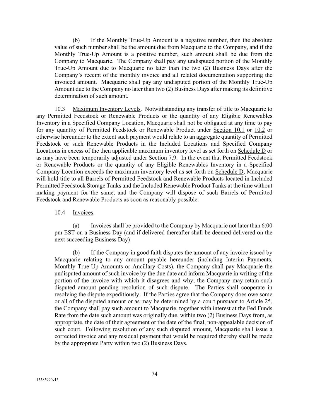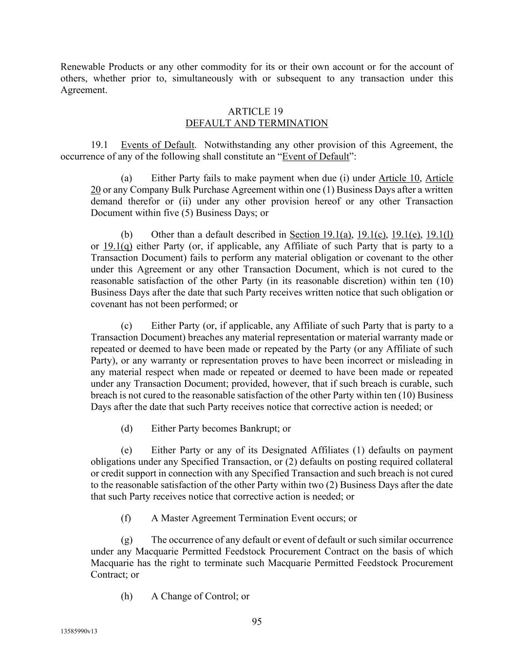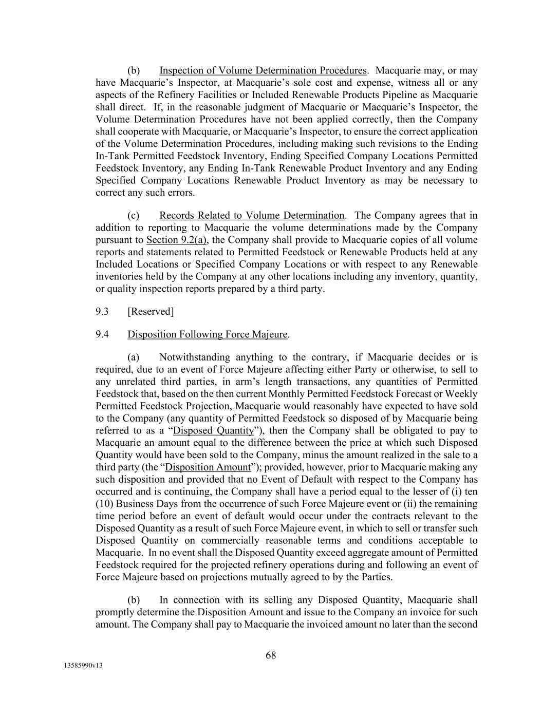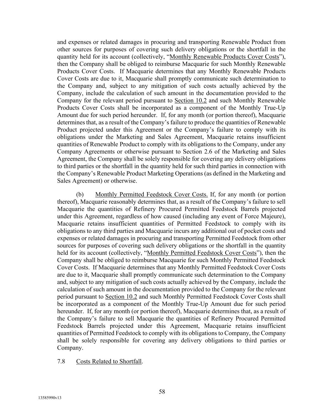 -12- Securities Business Days prior to (i) if such SOFR Rate Day is a U.S. Government Securities Business Day, such SOFR Rate Day or (ii) if such SOFR Rate Day is not a U.S. Government Securities Business Day, the U.S. Government Securities Business Day immediately preceding such SOFR Rate Date, in each case, as such SOFR is published by the SOFR Administrator on the SOFR Administrator’s Website; provided, that, if Daily Simple SOFR determined as provided above would be less than zero, then Daily Simple SOFR shall be deemed to be zero. If by 5:00 p.m. (New York City time) on the second (2nd) U.S. Government Securities Business Day immediately following any SOFR Determination Day, SOFR in respect of such SOFR Determination Day has not been published on the SOFR Administrator’s Website and a Benchmark Replacement Date with respect to Daily Simple SOFR has not occurred, then SOFR for such SOFR Determination Day will be SOFR as published in respect of the first preceding U.S. Government Securities Business Day for which SOFR was published on the SOFR Administrator’s Website; provided that any SOFR determined pursuant to this sentence shall be utilized for purposes of calculation of Daily Simple SOFR for no more than three (3) consecutive SOFR Rate Days. Any change in Daily Simple SOFR due to a change in SOFR shall be effective from and including the effective date of such change in SOFR without notice to the Borrower. “Deemed Borrowing Base” means, as of any date of determination, an amount equal to the result of (a) 55% of value of Borrower’s Accounts (including, without limitation, Accounts arising from Blenders Tax Credits), as determined by Agent in its Permitted Discretion pursuant to a review of Borrower’s balances sheets less (b) the aggregate amount of Reserves established by Agent from time to time under Section 2.1(c) of this Agreement. “Deemed Borrowing Base Period” means the period of time commencing on the Closing Date and ending on the earlier of (i) the date the Initial Field Examination shall have been completed and delivered to Agent and (ii) the 120th day following the Closing Date. “Default” means an event, condition, or default that, with the giving of notice, the passage of time, or both, would be an Event of Default. “Default Right” has the meaning assigned to that term in, and shall be interpreted in accordance with, 12 C.F.R. §§ 252.81, 47.2 or 382.1, as applicable. “Defaulting Lender” means any Lender that (a) has failed to (i) fund all or any portion of its Loans within two Business Days of the date such Loans were required to be funded hereunder unless such Lender notifies Agent and Administrative Borrower in writing that such failure is the result of such Lender’s determination that one or more conditions precedent to funding (each of which conditions precedent, together with any applicable Default or Event of Default, shall be specifically identified in such writing) has not been satisfied, or (ii) pay to Agent, Issuing Bank, or any other Lender any other amount required to be paid by it hereunder (including in respect of its participation in Letters of Credit) within two Business Days of the date when due, (b) has notified any Borrower, Agent or Issuing Bank in writing that it does not intend to comply with its funding obligations hereunder, or has made a public statement to that effect (unless such writing or public statement relates to such Lender’s obligation to fund a Loan hereunder and states that such position is based on such Lender’s determination that a condition precedent to funding (which condition precedent, together with any applicable Default or Event of Default, shall be specifically identified in such writing or public statement) cannot be satisfied), (c) has failed, within three Business Days after written request by Agent or Administrative Borrower, to confirm in writing to Agent and Administrative Borrower that it will comply with its prospective funding obligations hereunder (provided, that such Lender shall cease to be a Defaulting Lender pursuant to this clause (c) upon receipt of such written confirmation by Agent and Administrative Borrower), or (d) has,