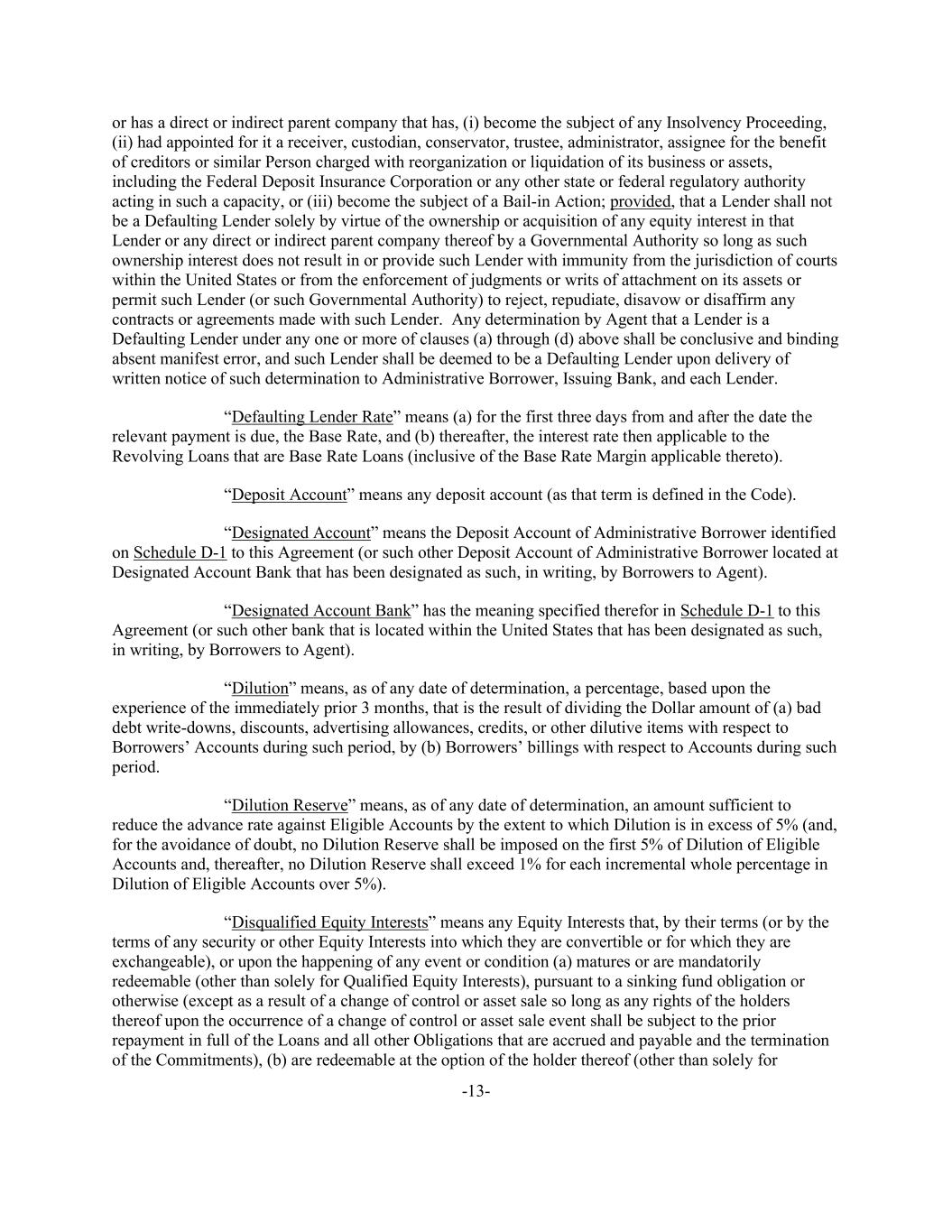 -13- or has a direct or indirect parent company that has, (i) become the subject of any Insolvency Proceeding, (ii) had appointed for it a receiver, custodian, conservator, trustee, administrator, assignee for the benefit of creditors or similar Person charged with reorganization or liquidation of its business or assets, including the Federal Deposit Insurance Corporation or any other state or federal regulatory authority acting in such a capacity, or (iii) become the subject of a Bail-in Action; provided, that a Lender shall not be a Defaulting Lender solely by virtue of the ownership or acquisition of any equity interest in that Lender or any direct or indirect parent company thereof by a Governmental Authority so long as such ownership interest does not result in or provide such Lender with immunity from the jurisdiction of courts within the United States or from the enforcement of judgments or writs of attachment on its assets or permit such Lender (or such Governmental Authority) to reject, repudiate, disavow or disaffirm any contracts or agreements made with such Lender. Any determination by Agent that a Lender is a Defaulting Lender under any one or more of clauses (a) through (d) above shall be conclusive and binding absent manifest error, and such Lender shall be deemed to be a Defaulting Lender upon delivery of written notice of such determination to Administrative Borrower, Issuing Bank, and each Lender. “Defaulting Lender Rate” means (a) for the first three days from and after the date the relevant payment is due, the Base Rate, and (b) thereafter, the interest rate then applicable to the Revolving Loans that are Base Rate Loans (inclusive of the Base Rate Margin applicable thereto). “Deposit Account” means any deposit account (as that term is defined in the Code). “Designated Account” means the Deposit Account of Administrative Borrower identified on Schedule D-1 to this Agreement (or such other Deposit Account of Administrative Borrower located at Designated Account Bank that has been designated as such, in writing, by Borrowers to Agent). “Designated Account Bank” has the meaning specified therefor in Schedule D-1 to this Agreement (or such other bank that is located within the United States that has been designated as such, in writing, by Borrowers to Agent). “Dilution” means, as of any date of determination, a percentage, based upon the experience of the immediately prior 3 months, that is the result of dividing the Dollar amount of (a) bad debt write-downs, discounts, advertising allowances, credits, or other dilutive items with respect to Borrowers’ Accounts during such period, by (b) Borrowers’ billings with respect to Accounts during such period. “Dilution Reserve” means, as of any date of determination, an amount sufficient to reduce the advance rate against Eligible Accounts by the extent to which Dilution is in excess of 5% (and, for the avoidance of doubt, no Dilution Reserve shall be imposed on the first 5% of Dilution of Eligible Accounts and, thereafter, no Dilution Reserve shall exceed 1% for each incremental whole percentage in Dilution of Eligible Accounts over 5%). “Disqualified Equity Interests” means any Equity Interests that, by their terms (or by the terms of any security or other Equity Interests into which they are convertible or for which they are exchangeable), or upon the happening of any event or condition (a) matures or are mandatorily redeemable (other than solely for Qualified Equity Interests), pursuant to a sinking fund obligation or otherwise (except as a result of a change of control or asset sale so long as any rights of the holders thereof upon the occurrence of a change of control or asset sale event shall be subject to the prior repayment in full of the Loans and all other Obligations that are accrued and payable and the termination of the Commitments), (b) are redeemable at the option of the holder thereof (other than solely for