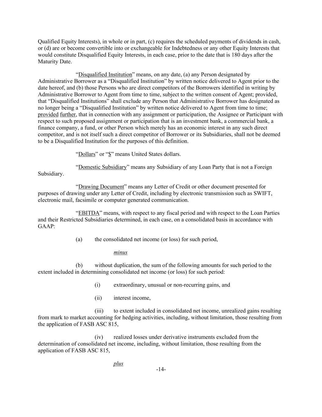 -14- Qualified Equity Interests), in whole or in part, (c) requires the scheduled payments of dividends in cash, or (d) are or become convertible into or exchangeable for Indebtedness or any other Equity Interests that would constitute Disqualified Equity Interests, in each case, prior to the date that is 180 days after the Maturity Date. “Disqualified Institution” means, on any date, (a) any Person designated by Administrative Borrower as a “Disqualified Institution” by written notice delivered to Agent prior to the date hereof, and (b) those Persons who are direct competitors of the Borrowers identified in writing by Administrative Borrower to Agent from time to time, subject to the written consent of Agent; provided, that “Disqualified Institutions” shall exclude any Person that Administrative Borrower has designated as no longer being a “Disqualified Institution” by written notice delivered to Agent from time to time; provided further, that in connection with any assignment or participation, the Assignee or Participant with respect to such proposed assignment or participation that is an investment bank, a commercial bank, a finance company, a fund, or other Person which merely has an economic interest in any such direct competitor, and is not itself such a direct competitor of Borrower or its Subsidiaries, shall not be deemed to be a Disqualified Institution for the purposes of this definition. “Dollars” or “$” means United States dollars. “Domestic Subsidiary” means any Subsidiary of any Loan Party that is not a Foreign Subsidiary. “Drawing Document” means any Letter of Credit or other document presented for purposes of drawing under any Letter of Credit, including by electronic transmission such as SWIFT, electronic mail, facsimile or computer generated communication. “EBITDA” means, with respect to any fiscal period and with respect to the Loan Parties and their Restricted Subsidiaries determined, in each case, on a consolidated basis in accordance with GAAP: (a) the consolidated net income (or loss) for such period, minus (b) without duplication, the sum of the following amounts for such period to the extent included in determining consolidated net income (or loss) for such period: (i) extraordinary, unusual or non-recurring gains, and (ii) interest income, (iii) to extent included in consolidated net income, unrealized gains resulting from mark to market accounting for hedging activities, including, without limitation, those resulting from the application of FASB ASC 815, (iv) realized losses under derivative instruments excluded from the determination of consolidated net income, including, without limitation, those resulting from the application of FASB ASC 815, plus