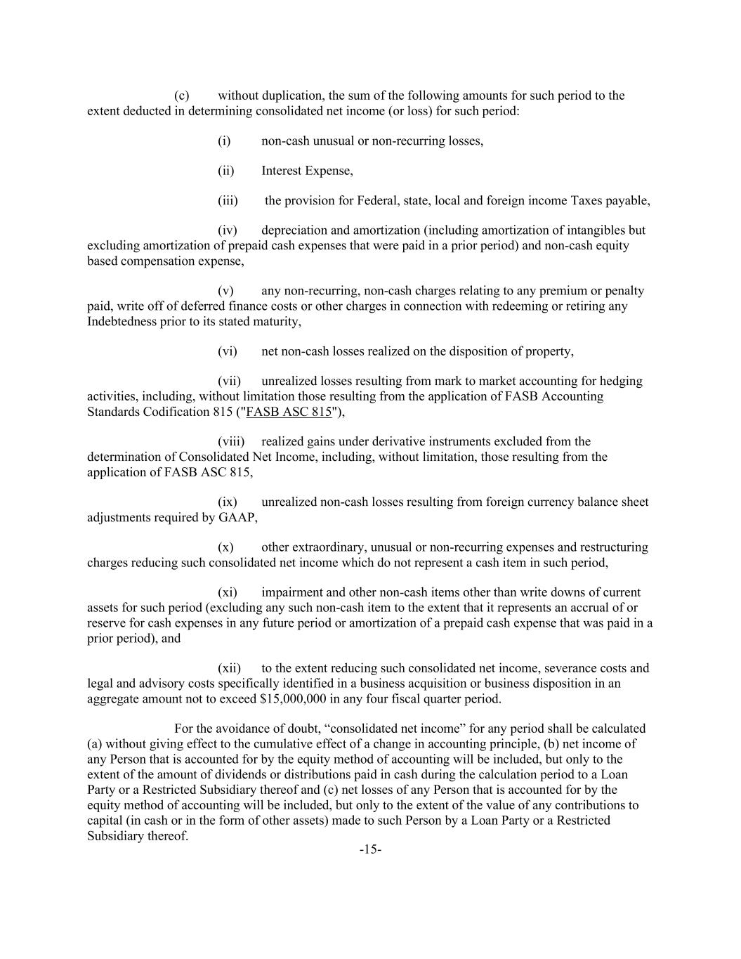 -15- (c) without duplication, the sum of the following amounts for such period to the extent deducted in determining consolidated net income (or loss) for such period: (i) non-cash unusual or non-recurring losses, (ii) Interest Expense, (iii) the provision for Federal, state, local and foreign income Taxes payable, (iv) depreciation and amortization (including amortization of intangibles but excluding amortization of prepaid cash expenses that were paid in a prior period) and non-cash equity based compensation expense, (v) any non-recurring, non-cash charges relating to any premium or penalty paid, write off of deferred finance costs or other charges in connection with redeeming or retiring any Indebtedness prior to its stated maturity, (vi) net non-cash losses realized on the disposition of property, (vii) unrealized losses resulting from mark to market accounting for hedging activities, including, without limitation those resulting from the application of FASB Accounting Standards Codification 815 ("FASB ASC 815"), (viii) realized gains under derivative instruments excluded from the determination of Consolidated Net Income, including, without limitation, those resulting from the application of FASB ASC 815, (ix) unrealized non-cash losses resulting from foreign currency balance sheet adjustments required by GAAP, (x) other extraordinary, unusual or non-recurring expenses and restructuring charges reducing such consolidated net income which do not represent a cash item in such period, (xi) impairment and other non-cash items other than write downs of current assets for such period (excluding any such non-cash item to the extent that it represents an accrual of or reserve for cash expenses in any future period or amortization of a prepaid cash expense that was paid in a prior period), and (xii) to the extent reducing such consolidated net income, severance costs and legal and advisory costs specifically identified in a business acquisition or business disposition in an aggregate amount not to exceed $15,000,000 in any four fiscal quarter period. For the avoidance of doubt, “consolidated net income” for any period shall be calculated (a) without giving effect to the cumulative effect of a change in accounting principle, (b) net income of any Person that is accounted for by the equity method of accounting will be included, but only to the extent of the amount of dividends or distributions paid in cash during the calculation period to a Loan Party or a Restricted Subsidiary thereof and (c) net losses of any Person that is accounted for by the equity method of accounting will be included, but only to the extent of the value of any contributions to capital (in cash or in the form of other assets) made to such Person by a Loan Party or a Restricted Subsidiary thereof.