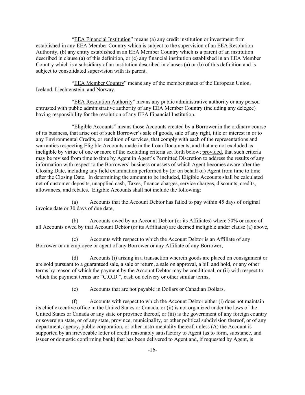 -16- “EEA Financial Institution” means (a) any credit institution or investment firm established in any EEA Member Country which is subject to the supervision of an EEA Resolution Authority, (b) any entity established in an EEA Member Country which is a parent of an institution described in clause (a) of this definition, or (c) any financial institution established in an EEA Member Country which is a subsidiary of an institution described in clauses (a) or (b) of this definition and is subject to consolidated supervision with its parent. “EEA Member Country” means any of the member states of the European Union, Iceland, Liechtenstein, and Norway. “EEA Resolution Authority” means any public administrative authority or any person entrusted with public administrative authority of any EEA Member Country (including any delegee) having responsibility for the resolution of any EEA Financial Institution. “Eligible Accounts” means those Accounts created by a Borrower in the ordinary course of its business, that arise out of such Borrower’s sale of goods, sale of any right, title or interest in or to any Environmental Credits, or rendition of services, that comply with each of the representations and warranties respecting Eligible Accounts made in the Loan Documents, and that are not excluded as ineligible by virtue of one or more of the excluding criteria set forth below; provided, that such criteria may be revised from time to time by Agent in Agent’s Permitted Discretion to address the results of any information with respect to the Borrowers’ business or assets of which Agent becomes aware after the Closing Date, including any field examination performed by (or on behalf of) Agent from time to time after the Closing Date. In determining the amount to be included, Eligible Accounts shall be calculated net of customer deposits, unapplied cash, Taxes, finance charges, service charges, discounts, credits, allowances, and rebates. Eligible Accounts shall not include the following: (a) Accounts that the Account Debtor has failed to pay within 45 days of original invoice date or 30 days of due date, (b) Accounts owed by an Account Debtor (or its Affiliates) where 50% or more of all Accounts owed by that Account Debtor (or its Affiliates) are deemed ineligible under clause (a) above, (c) Accounts with respect to which the Account Debtor is an Affiliate of any Borrower or an employee or agent of any Borrower or any Affiliate of any Borrower, (d) Accounts (i) arising in a transaction wherein goods are placed on consignment or are sold pursuant to a guaranteed sale, a sale or return, a sale on approval, a bill and hold, or any other terms by reason of which the payment by the Account Debtor may be conditional, or (ii) with respect to which the payment terms are “C.O.D.”, cash on delivery or other similar terms, (e) Accounts that are not payable in Dollars or Canadian Dollars, (f) Accounts with respect to which the Account Debtor either (i) does not maintain its chief executive office in the United States or Canada, or (ii) is not organized under the laws of the United States or Canada or any state or province thereof, or (iii) is the government of any foreign country or sovereign state, or of any state, province, municipality, or other political subdivision thereof, or of any department, agency, public corporation, or other instrumentality thereof, unless (A) the Account is supported by an irrevocable letter of credit reasonably satisfactory to Agent (as to form, substance, and issuer or domestic confirming bank) that has been delivered to Agent and, if requested by Agent, is
