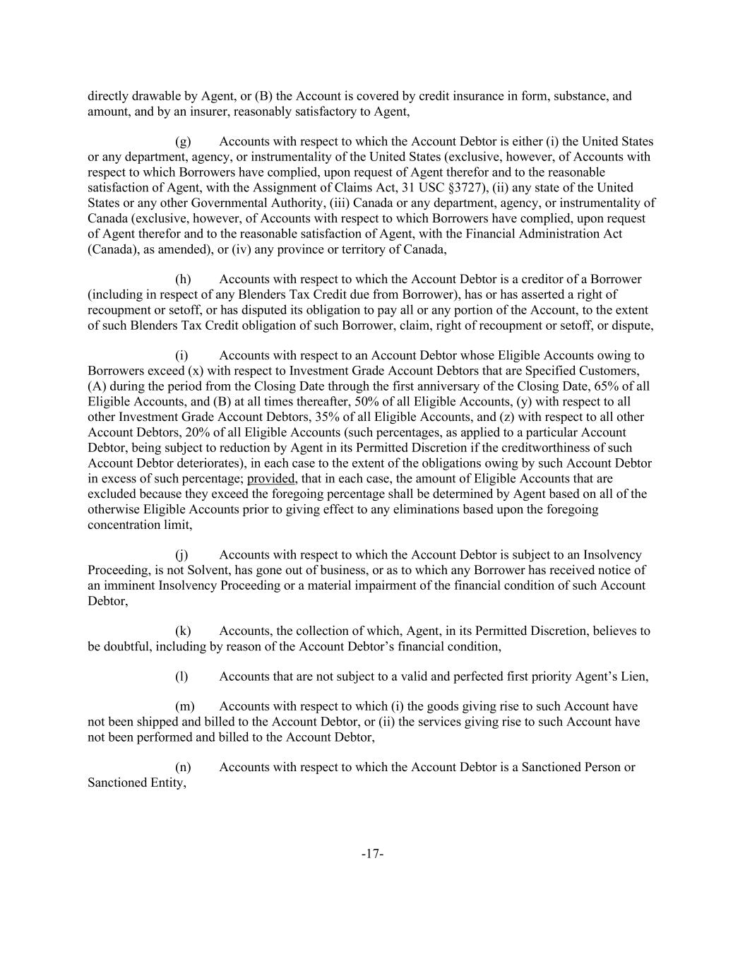 -17- directly drawable by Agent, or (B) the Account is covered by credit insurance in form, substance, and amount, and by an insurer, reasonably satisfactory to Agent, (g) Accounts with respect to which the Account Debtor is either (i) the United States or any department, agency, or instrumentality of the United States (exclusive, however, of Accounts with respect to which Borrowers have complied, upon request of Agent therefor and to the reasonable satisfaction of Agent, with the Assignment of Claims Act, 31 USC §3727), (ii) any state of the United States or any other Governmental Authority, (iii) Canada or any department, agency, or instrumentality of Canada (exclusive, however, of Accounts with respect to which Borrowers have complied, upon request of Agent therefor and to the reasonable satisfaction of Agent, with the Financial Administration Act (Canada), as amended), or (iv) any province or territory of Canada, (h) Accounts with respect to which the Account Debtor is a creditor of a Borrower (including in respect of any Blenders Tax Credit due from Borrower), has or has asserted a right of recoupment or setoff, or has disputed its obligation to pay all or any portion of the Account, to the extent of such Blenders Tax Credit obligation of such Borrower, claim, right of recoupment or setoff, or dispute, (i) Accounts with respect to an Account Debtor whose Eligible Accounts owing to Borrowers exceed (x) with respect to Investment Grade Account Debtors that are Specified Customers, (A) during the period from the Closing Date through the first anniversary of the Closing Date, 65% of all Eligible Accounts, and (B) at all times thereafter, 50% of all Eligible Accounts, (y) with respect to all other Investment Grade Account Debtors, 35% of all Eligible Accounts, and (z) with respect to all other Account Debtors, 20% of all Eligible Accounts (such percentages, as applied to a particular Account Debtor, being subject to reduction by Agent in its Permitted Discretion if the creditworthiness of such Account Debtor deteriorates), in each case to the extent of the obligations owing by such Account Debtor in excess of such percentage; provided, that in each case, the amount of Eligible Accounts that are excluded because they exceed the foregoing percentage shall be determined by Agent based on all of the otherwise Eligible Accounts prior to giving effect to any eliminations based upon the foregoing concentration limit, (j) Accounts with respect to which the Account Debtor is subject to an Insolvency Proceeding, is not Solvent, has gone out of business, or as to which any Borrower has received notice of an imminent Insolvency Proceeding or a material impairment of the financial condition of such Account Debtor, (k) Accounts, the collection of which, Agent, in its Permitted Discretion, believes to be doubtful, including by reason of the Account Debtor’s financial condition, (l) Accounts that are not subject to a valid and perfected first priority Agent’s Lien, (m) Accounts with respect to which (i) the goods giving rise to such Account have not been shipped and billed to the Account Debtor, or (ii) the services giving rise to such Account have not been performed and billed to the Account Debtor, (n) Accounts with respect to which the Account Debtor is a Sanctioned Person or Sanctioned Entity,
