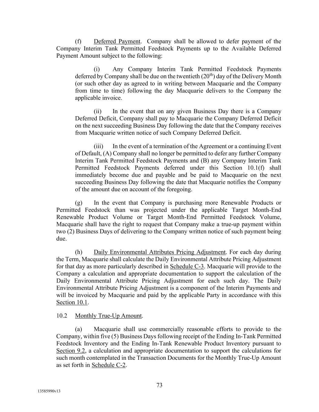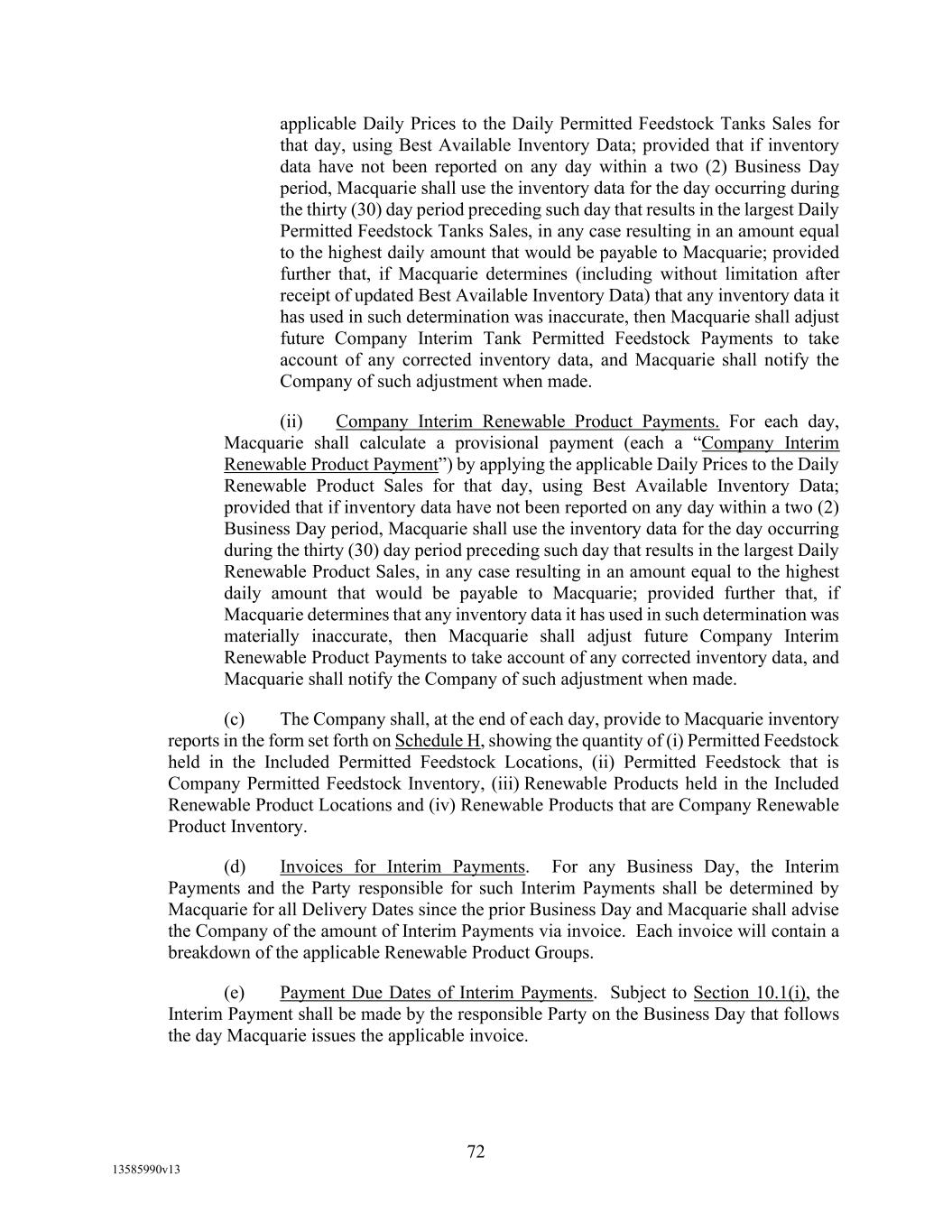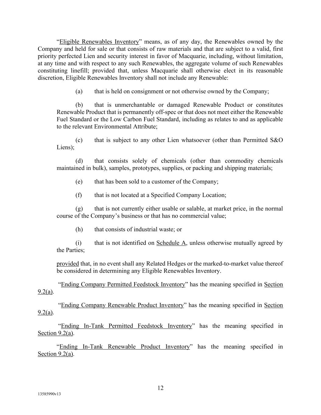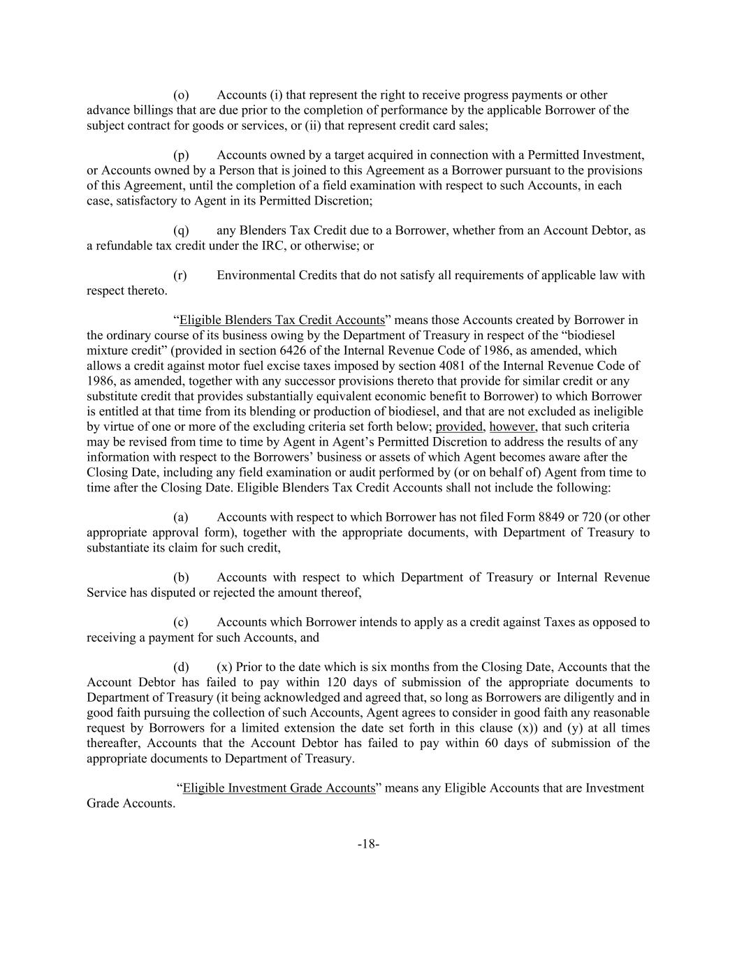 -18- (o) Accounts (i) that represent the right to receive progress payments or other advance billings that are due prior to the completion of performance by the applicable Borrower of the subject contract for goods or services, or (ii) that represent credit card sales; (p) Accounts owned by a target acquired in connection with a Permitted Investment, or Accounts owned by a Person that is joined to this Agreement as a Borrower pursuant to the provisions of this Agreement, until the completion of a field examination with respect to such Accounts, in each case, satisfactory to Agent in its Permitted Discretion; (q) any Blenders Tax Credit due to a Borrower, whether from an Account Debtor, as a refundable tax credit under the IRC, or otherwise; or (r) Environmental Credits that do not satisfy all requirements of applicable law with respect thereto. “Eligible Blenders Tax Credit Accounts” means those Accounts created by Borrower in the ordinary course of its business owing by the Department of Treasury in respect of the “biodiesel mixture credit” (provided in section 6426 of the Internal Revenue Code of 1986, as amended, which allows a credit against motor fuel excise taxes imposed by section 4081 of the Internal Revenue Code of 1986, as amended, together with any successor provisions thereto that provide for similar credit or any substitute credit that provides substantially equivalent economic benefit to Borrower) to which Borrower is entitled at that time from its blending or production of biodiesel, and that are not excluded as ineligible by virtue of one or more of the excluding criteria set forth below; provided, however, that such criteria may be revised from time to time by Agent in Agent’s Permitted Discretion to address the results of any information with respect to the Borrowers’ business or assets of which Agent becomes aware after the Closing Date, including any field examination or audit performed by (or on behalf of) Agent from time to time after the Closing Date. Eligible Blenders Tax Credit Accounts shall not include the following: (a) Accounts with respect to which Borrower has not filed Form 8849 or 720 (or other appropriate approval form), together with the appropriate documents, with Department of Treasury to substantiate its claim for such credit, (b) Accounts with respect to which Department of Treasury or Internal Revenue Service has disputed or rejected the amount thereof, (c) Accounts which Borrower intends to apply as a credit against Taxes as opposed to receiving a payment for such Accounts, and (d) (x) Prior to the date which is six months from the Closing Date, Accounts that the Account Debtor has failed to pay within 120 days of submission of the appropriate documents to Department of Treasury (it being acknowledged and agreed that, so long as Borrowers are diligently and in good faith pursuing the collection of such Accounts, Agent agrees to consider in good faith any reasonable request by Borrowers for a limited extension the date set forth in this clause (x)) and (y) at all times thereafter, Accounts that the Account Debtor has failed to pay within 60 days of submission of the appropriate documents to Department of Treasury. “Eligible Investment Grade Accounts” means any Eligible Accounts that are Investment Grade Accounts.