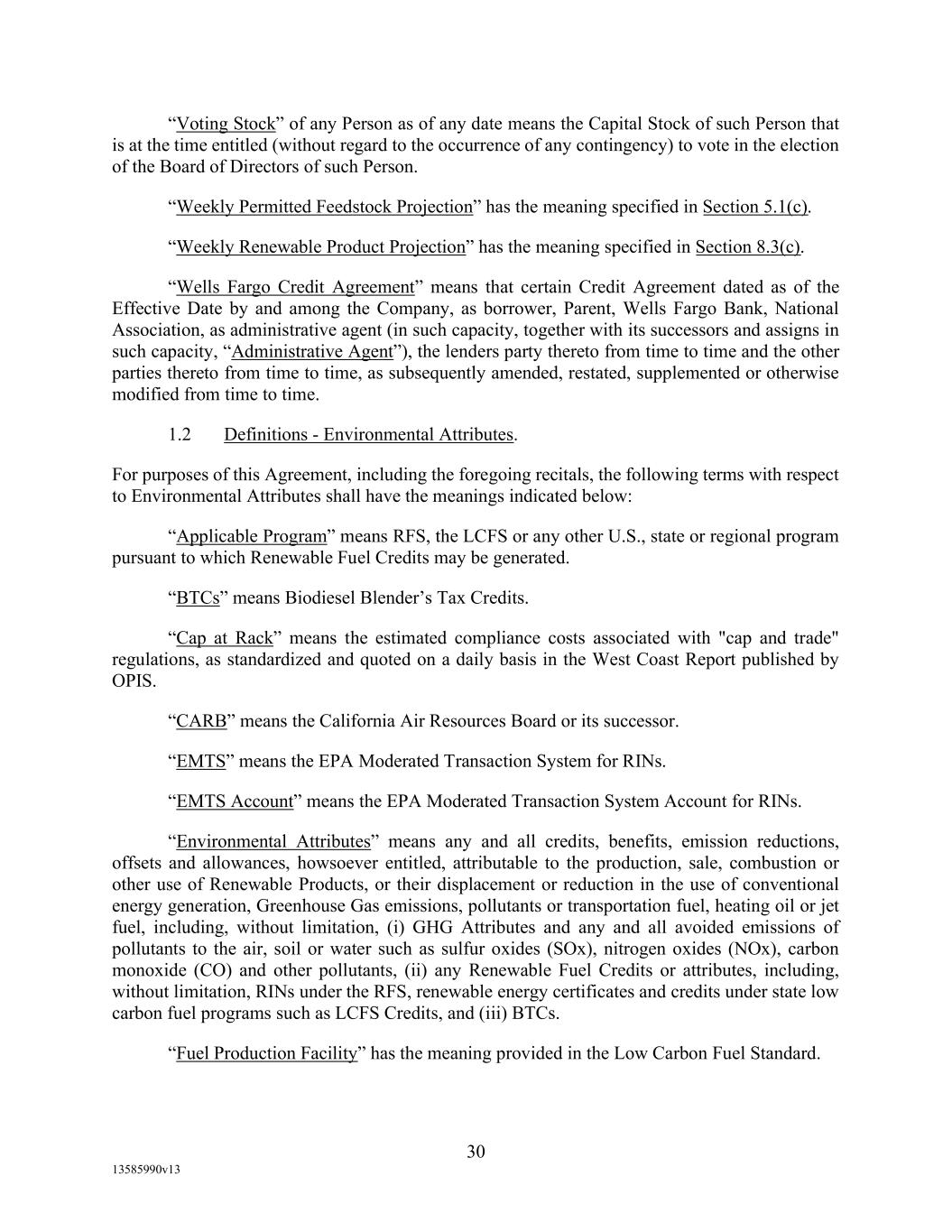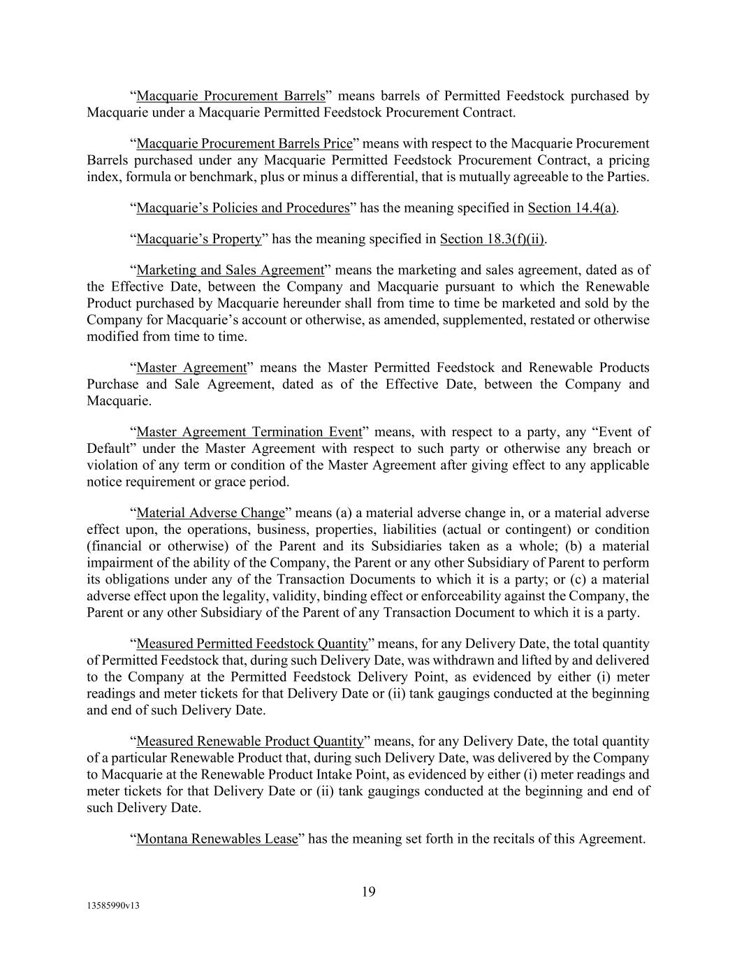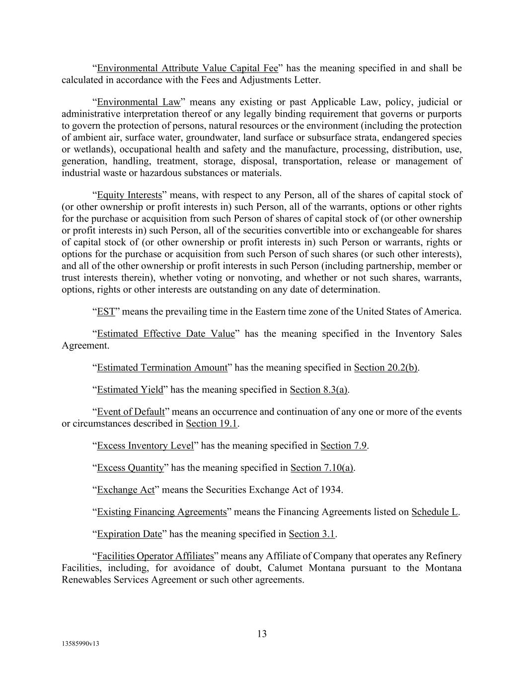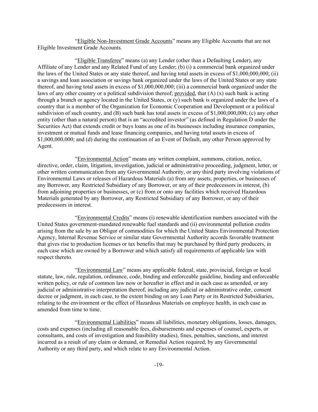 -19- “Eligible Non-Investment Grade Accounts” means any Eligible Accounts that are not Eligible Investment Grade Accounts. “Eligible Transferee” means (a) any Lender (other than a Defaulting Lender), any Affiliate of any Lender and any Related Fund of any Lender; (b) (i) a commercial bank organized under the laws of the United States or any state thereof, and having total assets in excess of $1,000,000,000; (ii) a savings and loan association or savings bank organized under the laws of the United States or any state thereof, and having total assets in excess of $1,000,000,000; (iii) a commercial bank organized under the laws of any other country or a political subdivision thereof; provided, that (A) (x) such bank is acting through a branch or agency located in the United States, or (y) such bank is organized under the laws of a country that is a member of the Organization for Economic Cooperation and Development or a political subdivision of such country, and (B) such bank has total assets in excess of $1,000,000,000; (c) any other entity (other than a natural person) that is an “accredited investor” (as defined in Regulation D under the Securities Act) that extends credit or buys loans as one of its businesses including insurance companies, investment or mutual funds and lease financing companies, and having total assets in excess of $1,000,000,000; and (d) during the continuation of an Event of Default, any other Person approved by Agent. “Environmental Action” means any written complaint, summons, citation, notice, directive, order, claim, litigation, investigation, judicial or administrative proceeding, judgment, letter, or other written communication from any Governmental Authority, or any third party involving violations of Environmental Laws or releases of Hazardous Materials (a) from any assets, properties, or businesses of any Borrower, any Restricted Subsidiary of any Borrower, or any of their predecessors in interest, (b) from adjoining properties or businesses, or (c) from or onto any facilities which received Hazardous Materials generated by any Borrower, any Restricted Subsidiary of any Borrower, or any of their predecessors in interest. “Environmental Credits” means (i) renewable identification numbers associated with the United States government-mandated renewable fuel standards and (ii) environmental pollution credits arising from the sale by an Obligor of commodities for which the United States Environmental Protection Agency, Internal Revenue Service or similar state Governmental Authority accords favorable treatment that gives rise to production licenses or tax benefits that may be purchased by third party producers, in each case which are owned by a Borrower and which satisfy all requirements of applicable law with respect thereto. “Environmental Law” means any applicable federal, state, provincial, foreign or local statute, law, rule, regulation, ordinance, code, binding and enforceable guideline, binding and enforceable written policy, or rule of common law now or hereafter in effect and in each case as amended, or any judicial or administrative interpretation thereof, including any judicial or administrative order, consent decree or judgment, in each case, to the extent binding on any Loan Party or its Restricted Subsidiaries, relating to the environment or the effect of Hazardous Materials on employee health, in each case as amended from time to time. “Environmental Liabilities” means all liabilities, monetary obligations, losses, damages, costs and expenses (including all reasonable fees, disbursements and expenses of counsel, experts, or consultants, and costs of investigation and feasibility studies), fines, penalties, sanctions, and interest incurred as a result of any claim or demand, or Remedial Action required, by any Governmental Authority or any third party, and which relate to any Environmental Action.