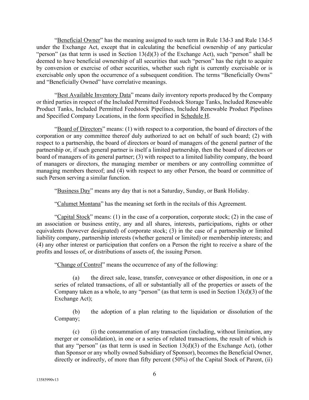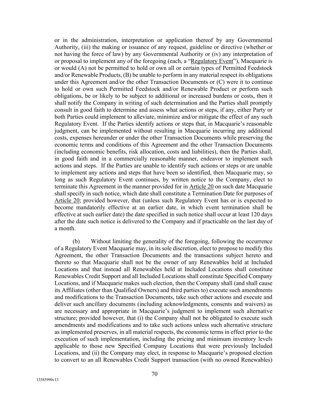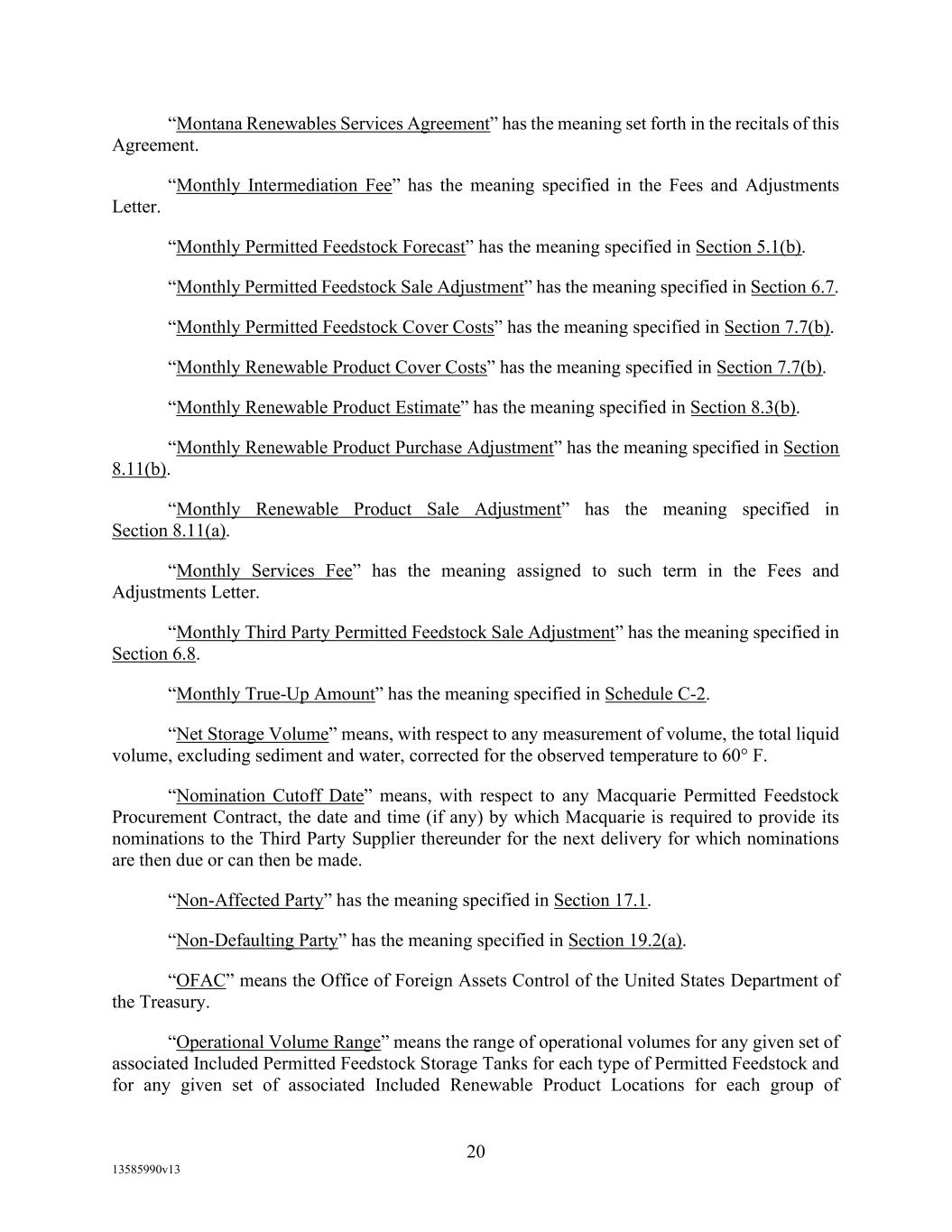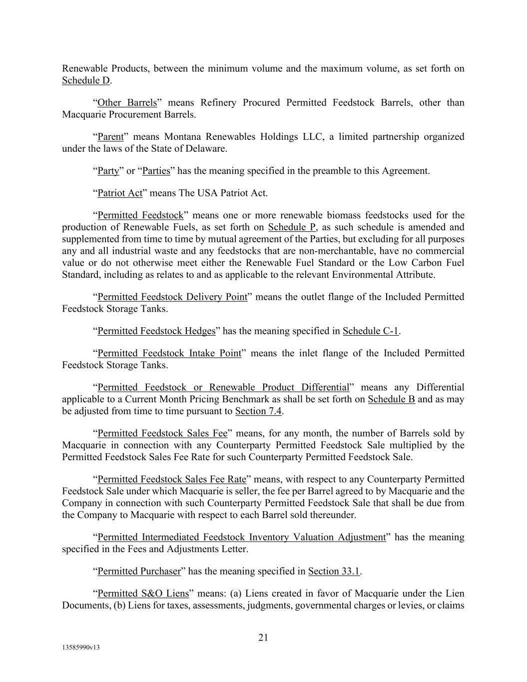 -19- “Eligible Non-Investment Grade Accounts” means any Eligible Accounts that are not Eligible Investment Grade Accounts. “Eligible Transferee” means (a) any Lender (other than a Defaulting Lender), any Affiliate of any Lender and any Related Fund of any Lender; (b) (i) a commercial bank organized under the laws of the United States or any state thereof, and having total assets in excess of $1,000,000,000; (ii) a savings and loan association or savings bank organized under the laws of the United States or any state thereof, and having total assets in excess of $1,000,000,000; (iii) a commercial bank organized under the laws of any other country or a political subdivision thereof; provided, that (A) (x) such bank is acting through a branch or agency located in the United States, or (y) such bank is organized under the laws of a country that is a member of the Organization for Economic Cooperation and Development or a political subdivision of such country, and (B) such bank has total assets in excess of $1,000,000,000; (c) any other entity (other than a natural person) that is an “accredited investor” (as defined in Regulation D under the Securities Act) that extends credit or buys loans as one of its businesses including insurance companies, investment or mutual funds and lease financing companies, and having total assets in excess of $1,000,000,000; and (d) during the continuation of an Event of Default, any other Person approved by Agent. “Environmental Action” means any written complaint, summons, citation, notice, directive, order, claim, litigation, investigation, judicial or administrative proceeding, judgment, letter, or other written communication from any Governmental Authority, or any third party involving violations of Environmental Laws or releases of Hazardous Materials (a) from any assets, properties, or businesses of any Borrower, any Restricted Subsidiary of any Borrower, or any of their predecessors in interest, (b) from adjoining properties or businesses, or (c) from or onto any facilities which received Hazardous Materials generated by any Borrower, any Restricted Subsidiary of any Borrower, or any of their predecessors in interest. “Environmental Credits” means (i) renewable identification numbers associated with the United States government-mandated renewable fuel standards and (ii) environmental pollution credits arising from the sale by an Obligor of commodities for which the United States Environmental Protection Agency, Internal Revenue Service or similar state Governmental Authority accords favorable treatment that gives rise to production licenses or tax benefits that may be purchased by third party producers, in each case which are owned by a Borrower and which satisfy all requirements of applicable law with respect thereto. “Environmental Law” means any applicable federal, state, provincial, foreign or local statute, law, rule, regulation, ordinance, code, binding and enforceable guideline, binding and enforceable written policy, or rule of common law now or hereafter in effect and in each case as amended, or any judicial or administrative interpretation thereof, including any judicial or administrative order, consent decree or judgment, in each case, to the extent binding on any Loan Party or its Restricted Subsidiaries, relating to the environment or the effect of Hazardous Materials on employee health, in each case as amended from time to time. “Environmental Liabilities” means all liabilities, monetary obligations, losses, damages, costs and expenses (including all reasonable fees, disbursements and expenses of counsel, experts, or consultants, and costs of investigation and feasibility studies), fines, penalties, sanctions, and interest incurred as a result of any claim or demand, or Remedial Action required, by any Governmental Authority or any third party, and which relate to any Environmental Action.