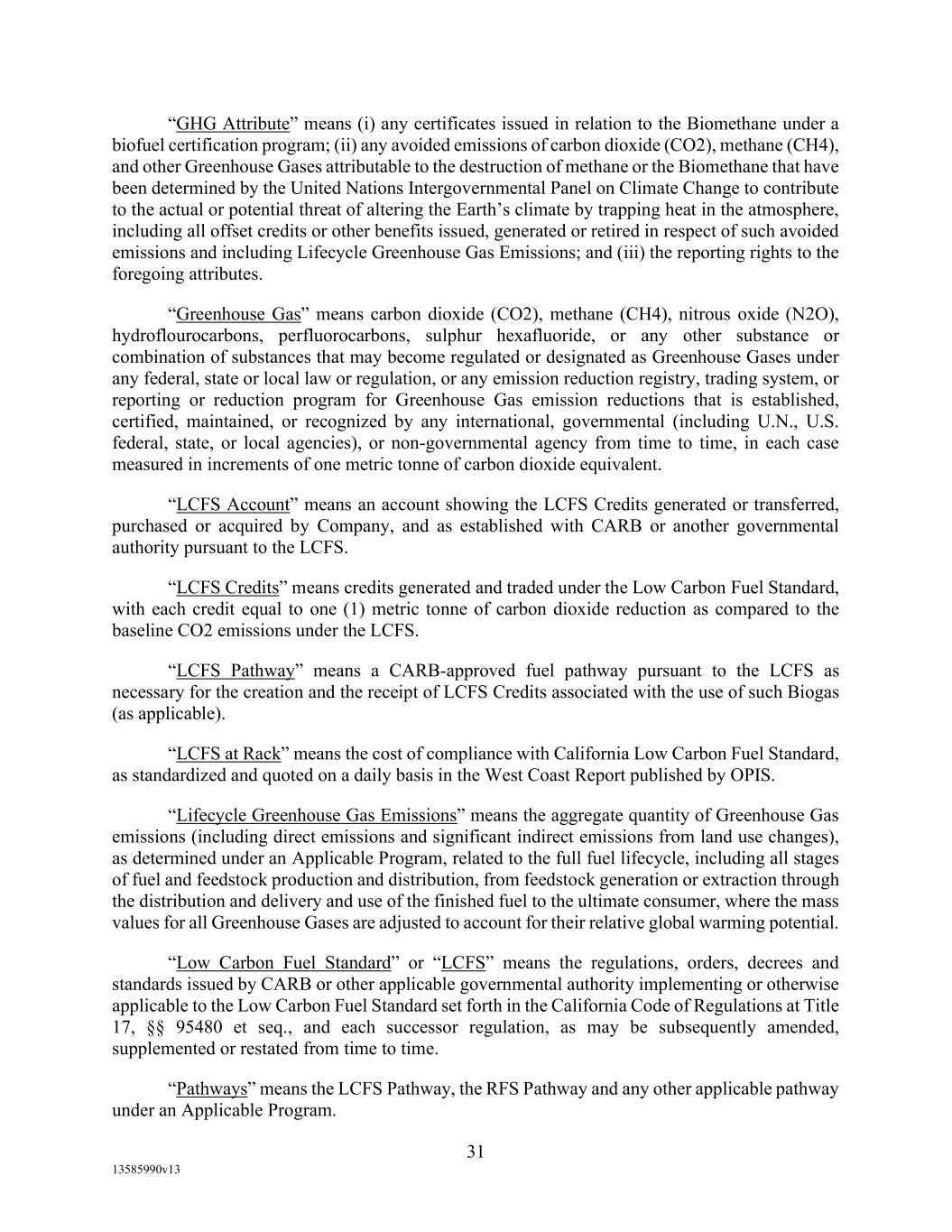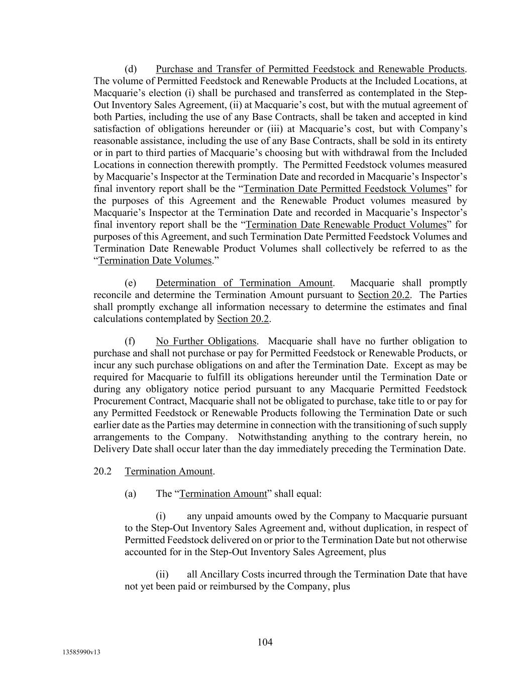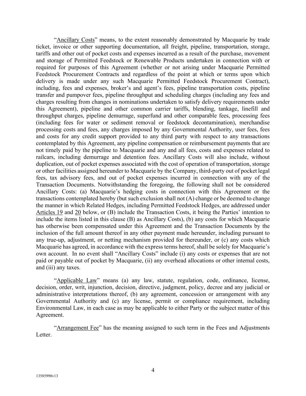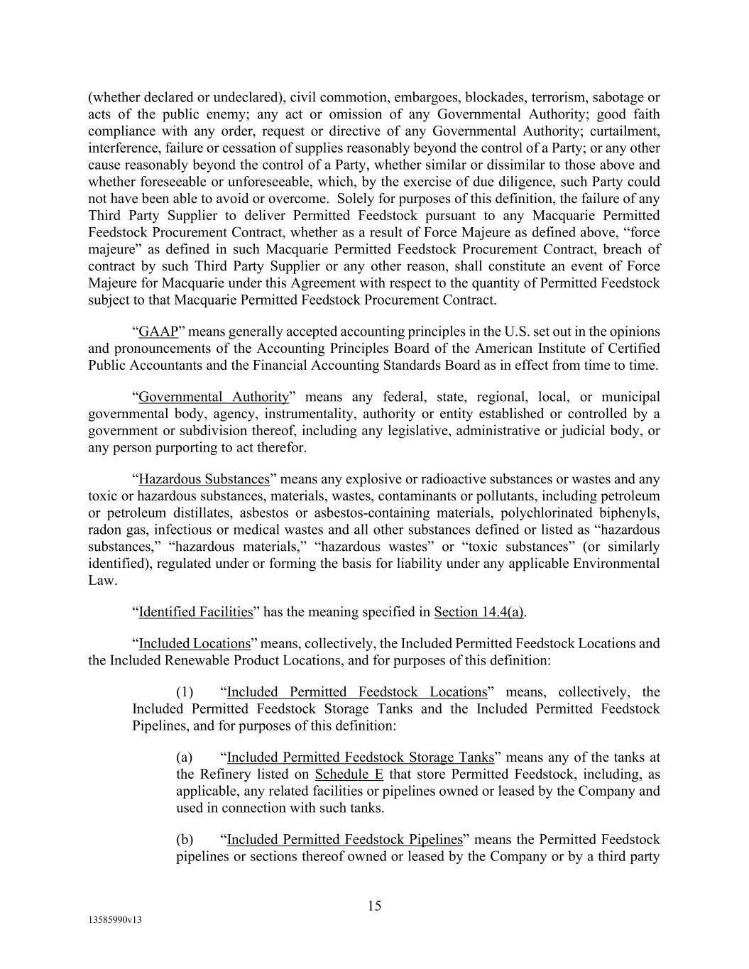 -19- “Eligible Non-Investment Grade Accounts” means any Eligible Accounts that are not Eligible Investment Grade Accounts. “Eligible Transferee” means (a) any Lender (other than a Defaulting Lender), any Affiliate of any Lender and any Related Fund of any Lender; (b) (i) a commercial bank organized under the laws of the United States or any state thereof, and having total assets in excess of $1,000,000,000; (ii) a savings and loan association or savings bank organized under the laws of the United States or any state thereof, and having total assets in excess of $1,000,000,000; (iii) a commercial bank organized under the laws of any other country or a political subdivision thereof; provided, that (A) (x) such bank is acting through a branch or agency located in the United States, or (y) such bank is organized under the laws of a country that is a member of the Organization for Economic Cooperation and Development or a political subdivision of such country, and (B) such bank has total assets in excess of $1,000,000,000; (c) any other entity (other than a natural person) that is an “accredited investor” (as defined in Regulation D under the Securities Act) that extends credit or buys loans as one of its businesses including insurance companies, investment or mutual funds and lease financing companies, and having total assets in excess of $1,000,000,000; and (d) during the continuation of an Event of Default, any other Person approved by Agent. “Environmental Action” means any written complaint, summons, citation, notice, directive, order, claim, litigation, investigation, judicial or administrative proceeding, judgment, letter, or other written communication from any Governmental Authority, or any third party involving violations of Environmental Laws or releases of Hazardous Materials (a) from any assets, properties, or businesses of any Borrower, any Restricted Subsidiary of any Borrower, or any of their predecessors in interest, (b) from adjoining properties or businesses, or (c) from or onto any facilities which received Hazardous Materials generated by any Borrower, any Restricted Subsidiary of any Borrower, or any of their predecessors in interest. “Environmental Credits” means (i) renewable identification numbers associated with the United States government-mandated renewable fuel standards and (ii) environmental pollution credits arising from the sale by an Obligor of commodities for which the United States Environmental Protection Agency, Internal Revenue Service or similar state Governmental Authority accords favorable treatment that gives rise to production licenses or tax benefits that may be purchased by third party producers, in each case which are owned by a Borrower and which satisfy all requirements of applicable law with respect thereto. “Environmental Law” means any applicable federal, state, provincial, foreign or local statute, law, rule, regulation, ordinance, code, binding and enforceable guideline, binding and enforceable written policy, or rule of common law now or hereafter in effect and in each case as amended, or any judicial or administrative interpretation thereof, including any judicial or administrative order, consent decree or judgment, in each case, to the extent binding on any Loan Party or its Restricted Subsidiaries, relating to the environment or the effect of Hazardous Materials on employee health, in each case as amended from time to time. “Environmental Liabilities” means all liabilities, monetary obligations, losses, damages, costs and expenses (including all reasonable fees, disbursements and expenses of counsel, experts, or consultants, and costs of investigation and feasibility studies), fines, penalties, sanctions, and interest incurred as a result of any claim or demand, or Remedial Action required, by any Governmental Authority or any third party, and which relate to any Environmental Action.