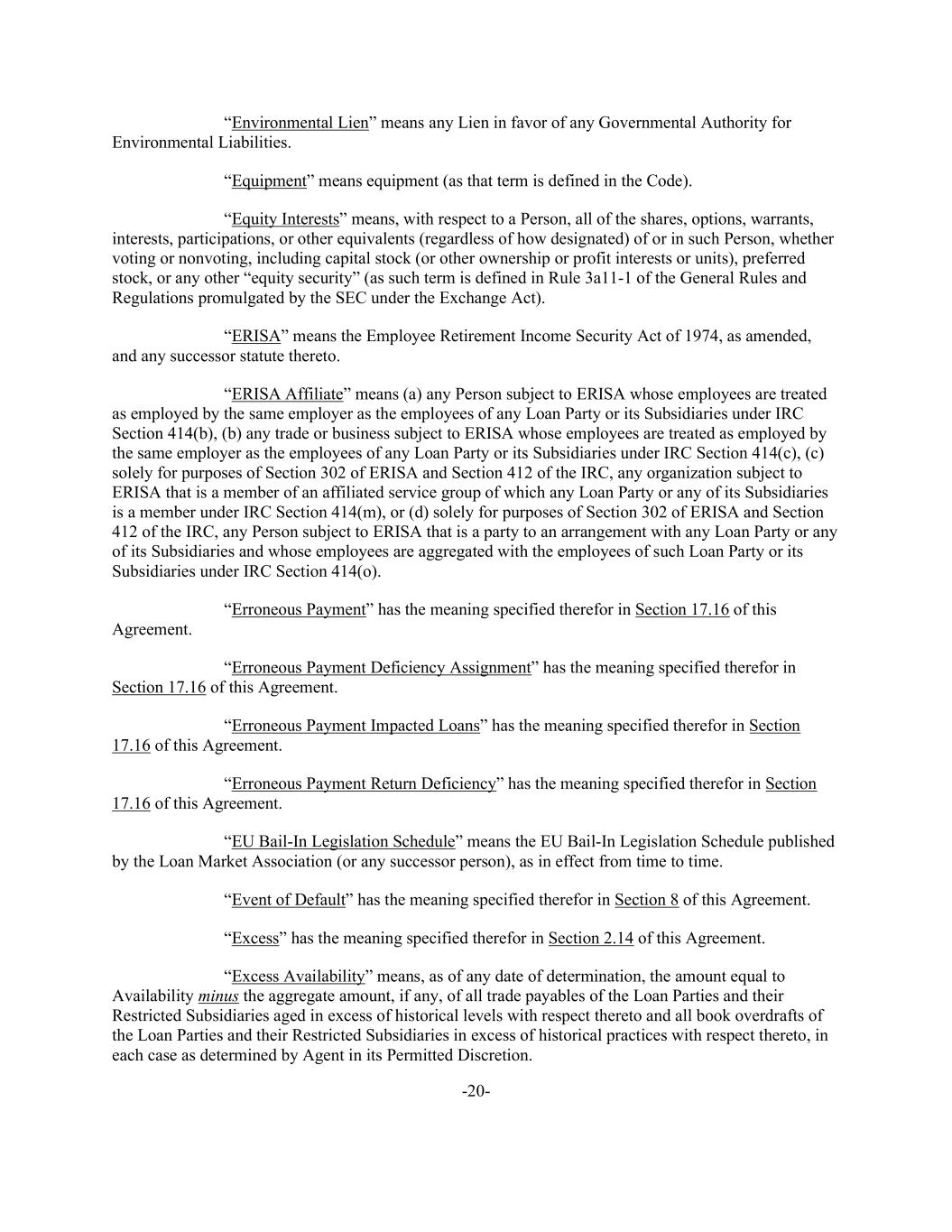 -20- “Environmental Lien” means any Lien in favor of any Governmental Authority for Environmental Liabilities. “Equipment” means equipment (as that term is defined in the Code). “Equity Interests” means, with respect to a Person, all of the shares, options, warrants, interests, participations, or other equivalents (regardless of how designated) of or in such Person, whether voting or nonvoting, including capital stock (or other ownership or profit interests or units), preferred stock, or any other “equity security” (as such term is defined in Rule 3a11-1 of the General Rules and Regulations promulgated by the SEC under the Exchange Act). “ERISA” means the Employee Retirement Income Security Act of 1974, as amended, and any successor statute thereto. “ERISA Affiliate” means (a) any Person subject to ERISA whose employees are treated as employed by the same employer as the employees of any Loan Party or its Subsidiaries under IRC Section 414(b), (b) any trade or business subject to ERISA whose employees are treated as employed by the same employer as the employees of any Loan Party or its Subsidiaries under IRC Section 414(c), (c) solely for purposes of Section 302 of ERISA and Section 412 of the IRC, any organization subject to ERISA that is a member of an affiliated service group of which any Loan Party or any of its Subsidiaries is a member under IRC Section 414(m), or (d) solely for purposes of Section 302 of ERISA and Section 412 of the IRC, any Person subject to ERISA that is a party to an arrangement with any Loan Party or any of its Subsidiaries and whose employees are aggregated with the employees of such Loan Party or its Subsidiaries under IRC Section 414(o). “Erroneous Payment” has the meaning specified therefor in Section 17.16 of this Agreement. “Erroneous Payment Deficiency Assignment” has the meaning specified therefor in Section 17.16 of this Agreement. “Erroneous Payment Impacted Loans” has the meaning specified therefor in Section 17.16 of this Agreement. “Erroneous Payment Return Deficiency” has the meaning specified therefor in Section 17.16 of this Agreement. “EU Bail-In Legislation Schedule” means the EU Bail-In Legislation Schedule published by the Loan Market Association (or any successor person), as in effect from time to time. “Event of Default” has the meaning specified therefor in Section 8 of this Agreement. “Excess” has the meaning specified therefor in Section 2.14 of this Agreement. “Excess Availability” means, as of any date of determination, the amount equal to Availability minus the aggregate amount, if any, of all trade payables of the Loan Parties and their Restricted Subsidiaries aged in excess of historical levels with respect thereto and all book overdrafts of the Loan Parties and their Restricted Subsidiaries in excess of historical practices with respect thereto, in each case as determined by Agent in its Permitted Discretion.