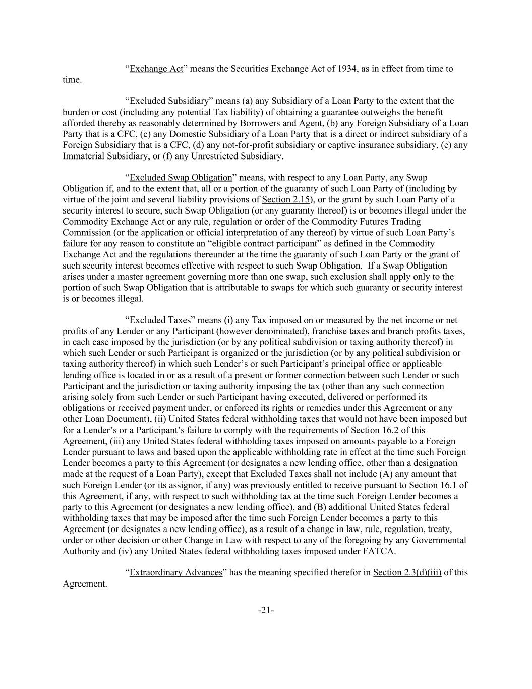 -21- “Exchange Act” means the Securities Exchange Act of 1934, as in effect from time to time. “Excluded Subsidiary” means (a) any Subsidiary of a Loan Party to the extent that the burden or cost (including any potential Tax liability) of obtaining a guarantee outweighs the benefit afforded thereby as reasonably determined by Borrowers and Agent, (b) any Foreign Subsidiary of a Loan Party that is a CFC, (c) any Domestic Subsidiary of a Loan Party that is a direct or indirect subsidiary of a Foreign Subsidiary that is a CFC, (d) any not-for-profit subsidiary or captive insurance subsidiary, (e) any Immaterial Subsidiary, or (f) any Unrestricted Subsidiary. “Excluded Swap Obligation” means, with respect to any Loan Party, any Swap Obligation if, and to the extent that, all or a portion of the guaranty of such Loan Party of (including by virtue of the joint and several liability provisions of Section 2.15), or the grant by such Loan Party of a security interest to secure, such Swap Obligation (or any guaranty thereof) is or becomes illegal under the Commodity Exchange Act or any rule, regulation or order of the Commodity Futures Trading Commission (or the application or official interpretation of any thereof) by virtue of such Loan Party’s failure for any reason to constitute an “eligible contract participant” as defined in the Commodity Exchange Act and the regulations thereunder at the time the guaranty of such Loan Party or the grant of such security interest becomes effective with respect to such Swap Obligation. If a Swap Obligation arises under a master agreement governing more than one swap, such exclusion shall apply only to the portion of such Swap Obligation that is attributable to swaps for which such guaranty or security interest is or becomes illegal. “Excluded Taxes” means (i) any Tax imposed on or measured by the net income or net profits of any Lender or any Participant (however denominated), franchise taxes and branch profits taxes, in each case imposed by the jurisdiction (or by any political subdivision or taxing authority thereof) in which such Lender or such Participant is organized or the jurisdiction (or by any political subdivision or taxing authority thereof) in which such Lender’s or such Participant’s principal office or applicable lending office is located in or as a result of a present or former connection between such Lender or such Participant and the jurisdiction or taxing authority imposing the tax (other than any such connection arising solely from such Lender or such Participant having executed, delivered or performed its obligations or received payment under, or enforced its rights or remedies under this Agreement or any other Loan Document), (ii) United States federal withholding taxes that would not have been imposed but for a Lender’s or a Participant’s failure to comply with the requirements of Section 16.2 of this Agreement, (iii) any United States federal withholding taxes imposed on amounts payable to a Foreign Lender pursuant to laws and based upon the applicable withholding rate in effect at the time such Foreign Lender becomes a party to this Agreement (or designates a new lending office, other than a designation made at the request of a Loan Party), except that Excluded Taxes shall not include (A) any amount that such Foreign Lender (or its assignor, if any) was previously entitled to receive pursuant to Section 16.1 of this Agreement, if any, with respect to such withholding tax at the time such Foreign Lender becomes a party to this Agreement (or designates a new lending office), and (B) additional United States federal withholding taxes that may be imposed after the time such Foreign Lender becomes a party to this Agreement (or designates a new lending office), as a result of a change in law, rule, regulation, treaty, order or other decision or other Change in Law with respect to any of the foregoing by any Governmental Authority and (iv) any United States federal withholding taxes imposed under FATCA. “Extraordinary Advances” has the meaning specified therefor in Section 2.3(d)(iii) of this Agreement.