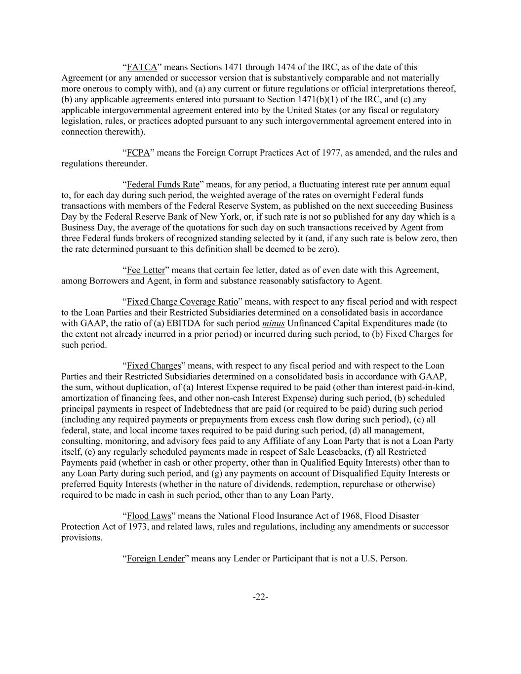 -22- “FATCA” means Sections 1471 through 1474 of the IRC, as of the date of this Agreement (or any amended or successor version that is substantively comparable and not materially more onerous to comply with), and (a) any current or future regulations or official interpretations thereof, (b) any applicable agreements entered into pursuant to Section 1471(b)(1) of the IRC, and (c) any applicable intergovernmental agreement entered into by the United States (or any fiscal or regulatory legislation, rules, or practices adopted pursuant to any such intergovernmental agreement entered into in connection therewith). “FCPA” means the Foreign Corrupt Practices Act of 1977, as amended, and the rules and regulations thereunder. “Federal Funds Rate” means, for any period, a fluctuating interest rate per annum equal to, for each day during such period, the weighted average of the rates on overnight Federal funds transactions with members of the Federal Reserve System, as published on the next succeeding Business Day by the Federal Reserve Bank of New York, or, if such rate is not so published for any day which is a Business Day, the average of the quotations for such day on such transactions received by Agent from three Federal funds brokers of recognized standing selected by it (and, if any such rate is below zero, then the rate determined pursuant to this definition shall be deemed to be zero). “Fee Letter” means that certain fee letter, dated as of even date with this Agreement, among Borrowers and Agent, in form and substance reasonably satisfactory to Agent. “Fixed Charge Coverage Ratio” means, with respect to any fiscal period and with respect to the Loan Parties and their Restricted Subsidiaries determined on a consolidated basis in accordance with GAAP, the ratio of (a) EBITDA for such period minus Unfinanced Capital Expenditures made (to the extent not already incurred in a prior period) or incurred during such period, to (b) Fixed Charges for such period. “Fixed Charges” means, with respect to any fiscal period and with respect to the Loan Parties and their Restricted Subsidiaries determined on a consolidated basis in accordance with GAAP, the sum, without duplication, of (a) Interest Expense required to be paid (other than interest paid-in-kind, amortization of financing fees, and other non-cash Interest Expense) during such period, (b) scheduled principal payments in respect of Indebtedness that are paid (or required to be paid) during such period (including any required payments or prepayments from excess cash flow during such period), (c) all federal, state, and local income taxes required to be paid during such period, (d) all management, consulting, monitoring, and advisory fees paid to any Affiliate of any Loan Party that is not a Loan Party itself, (e) any regularly scheduled payments made in respect of Sale Leasebacks, (f) all Restricted Payments paid (whether in cash or other property, other than in Qualified Equity Interests) other than to any Loan Party during such period, and (g) any payments on account of Disqualified Equity Interests or preferred Equity Interests (whether in the nature of dividends, redemption, repurchase or otherwise) required to be made in cash in such period, other than to any Loan Party. “Flood Laws” means the National Flood Insurance Act of 1968, Flood Disaster Protection Act of 1973, and related laws, rules and regulations, including any amendments or successor provisions. “Foreign Lender” means any Lender or Participant that is not a U.S. Person.