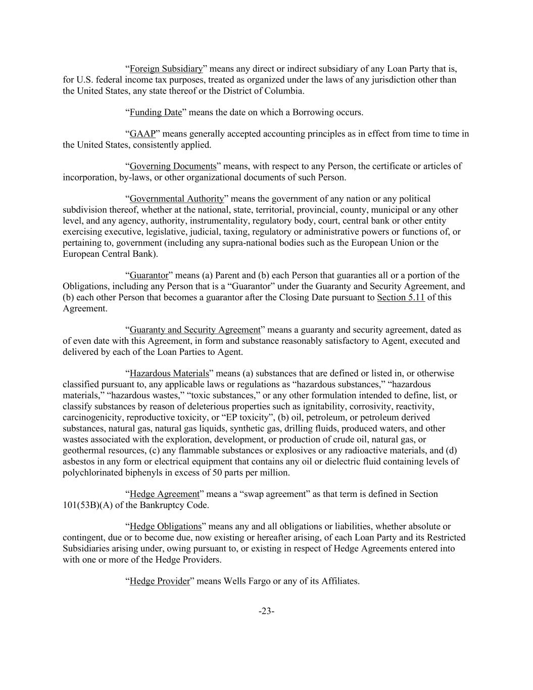 -23- “Foreign Subsidiary” means any direct or indirect subsidiary of any Loan Party that is, for U.S. federal income tax purposes, treated as organized under the laws of any jurisdiction other than the United States, any state thereof or the District of Columbia. “Funding Date” means the date on which a Borrowing occurs. “GAAP” means generally accepted accounting principles as in effect from time to time in the United States, consistently applied. “Governing Documents” means, with respect to any Person, the certificate or articles of incorporation, by-laws, or other organizational documents of such Person. “Governmental Authority” means the government of any nation or any political subdivision thereof, whether at the national, state, territorial, provincial, county, municipal or any other level, and any agency, authority, instrumentality, regulatory body, court, central bank or other entity exercising executive, legislative, judicial, taxing, regulatory or administrative powers or functions of, or pertaining to, government (including any supra-national bodies such as the European Union or the European Central Bank). “Guarantor” means (a) Parent and (b) each Person that guaranties all or a portion of the Obligations, including any Person that is a “Guarantor” under the Guaranty and Security Agreement, and (b) each other Person that becomes a guarantor after the Closing Date pursuant to Section 5.11 of this Agreement. “Guaranty and Security Agreement” means a guaranty and security agreement, dated as of even date with this Agreement, in form and substance reasonably satisfactory to Agent, executed and delivered by each of the Loan Parties to Agent. “Hazardous Materials” means (a) substances that are defined or listed in, or otherwise classified pursuant to, any applicable laws or regulations as “hazardous substances,” “hazardous materials,” “hazardous wastes,” “toxic substances,” or any other formulation intended to define, list, or classify substances by reason of deleterious properties such as ignitability, corrosivity, reactivity, carcinogenicity, reproductive toxicity, or “EP toxicity”, (b) oil, petroleum, or petroleum derived substances, natural gas, natural gas liquids, synthetic gas, drilling fluids, produced waters, and other wastes associated with the exploration, development, or production of crude oil, natural gas, or geothermal resources, (c) any flammable substances or explosives or any radioactive materials, and (d) asbestos in any form or electrical equipment that contains any oil or dielectric fluid containing levels of polychlorinated biphenyls in excess of 50 parts per million. “Hedge Agreement” means a “swap agreement” as that term is defined in Section 101(53B)(A) of the Bankruptcy Code. “Hedge Obligations” means any and all obligations or liabilities, whether absolute or contingent, due or to become due, now existing or hereafter arising, of each Loan Party and its Restricted Subsidiaries arising under, owing pursuant to, or existing in respect of Hedge Agreements entered into with one or more of the Hedge Providers. “Hedge Provider” means Wells Fargo or any of its Affiliates.