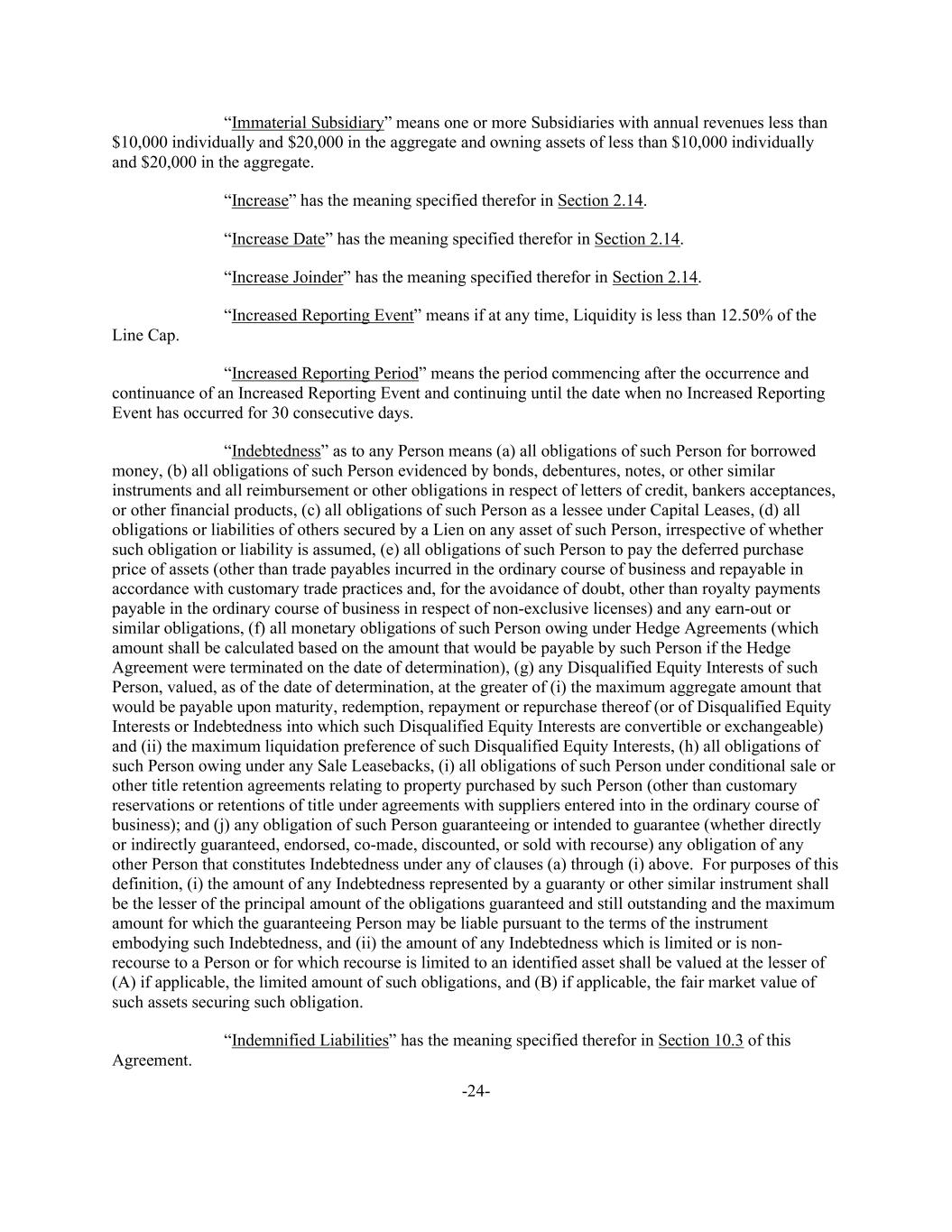 -24- “Immaterial Subsidiary” means one or more Subsidiaries with annual revenues less than $10,000 individually and $20,000 in the aggregate and owning assets of less than $10,000 individually and $20,000 in the aggregate. “Increase” has the meaning specified therefor in Section 2.14. “Increase Date” has the meaning specified therefor in Section 2.14. “Increase Joinder” has the meaning specified therefor in Section 2.14. “Increased Reporting Event” means if at any time, Liquidity is less than 12.50% of the Line Cap. “Increased Reporting Period” means the period commencing after the occurrence and continuance of an Increased Reporting Event and continuing until the date when no Increased Reporting Event has occurred for 30 consecutive days. “Indebtedness” as to any Person means (a) all obligations of such Person for borrowed money, (b) all obligations of such Person evidenced by bonds, debentures, notes, or other similar instruments and all reimbursement or other obligations in respect of letters of credit, bankers acceptances, or other financial products, (c) all obligations of such Person as a lessee under Capital Leases, (d) all obligations or liabilities of others secured by a Lien on any asset of such Person, irrespective of whether such obligation or liability is assumed, (e) all obligations of such Person to pay the deferred purchase price of assets (other than trade payables incurred in the ordinary course of business and repayable in accordance with customary trade practices and, for the avoidance of doubt, other than royalty payments payable in the ordinary course of business in respect of non-exclusive licenses) and any earn-out or similar obligations, (f) all monetary obligations of such Person owing under Hedge Agreements (which amount shall be calculated based on the amount that would be payable by such Person if the Hedge Agreement were terminated on the date of determination), (g) any Disqualified Equity Interests of such Person, valued, as of the date of determination, at the greater of (i) the maximum aggregate amount that would be payable upon maturity, redemption, repayment or repurchase thereof (or of Disqualified Equity Interests or Indebtedness into which such Disqualified Equity Interests are convertible or exchangeable) and (ii) the maximum liquidation preference of such Disqualified Equity Interests, (h) all obligations of such Person owing under any Sale Leasebacks, (i) all obligations of such Person under conditional sale or other title retention agreements relating to property purchased by such Person (other than customary reservations or retentions of title under agreements with suppliers entered into in the ordinary course of business); and (j) any obligation of such Person guaranteeing or intended to guarantee (whether directly or indirectly guaranteed, endorsed, co-made, discounted, or sold with recourse) any obligation of any other Person that constitutes Indebtedness under any of clauses (a) through (i) above. For purposes of this definition, (i) the amount of any Indebtedness represented by a guaranty or other similar instrument shall be the lesser of the principal amount of the obligations guaranteed and still outstanding and the maximum amount for which the guaranteeing Person may be liable pursuant to the terms of the instrument embodying such Indebtedness, and (ii) the amount of any Indebtedness which is limited or is non- recourse to a Person or for which recourse is limited to an identified asset shall be valued at the lesser of (A) if applicable, the limited amount of such obligations, and (B) if applicable, the fair market value of such assets securing such obligation. “Indemnified Liabilities” has the meaning specified therefor in Section 10.3 of this Agreement.