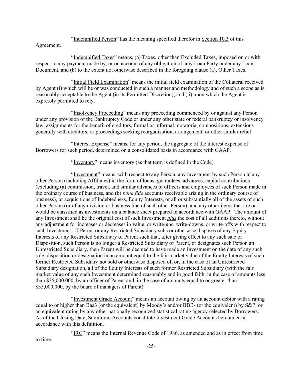 -25- “Indemnified Person” has the meaning specified therefor in Section 10.3 of this Agreement. “Indemnified Taxes” means, (a) Taxes, other than Excluded Taxes, imposed on or with respect to any payment made by, or on account of any obligation of, any Loan Party under any Loan Document, and (b) to the extent not otherwise described in the foregoing clause (a), Other Taxes. “Initial Field Examination” means the initial field examination of the Collateral received by Agent (i) which will be or was conducted in such a manner and methodology and of such a scope as is reasonably acceptable to the Agent (in its Permitted Discretion); and (ii) upon which the Agent is expressly permitted to rely. “Insolvency Proceeding” means any proceeding commenced by or against any Person under any provision of the Bankruptcy Code or under any other state or federal bankruptcy or insolvency law, assignments for the benefit of creditors, formal or informal moratoria, compositions, extensions generally with creditors, or proceedings seeking reorganization, arrangement, or other similar relief. “Interest Expense” means, for any period, the aggregate of the interest expense of Borrowers for such period, determined on a consolidated basis in accordance with GAAP. “Inventory” means inventory (as that term is defined in the Code). “Investment” means, with respect to any Person, any investment by such Person in any other Person (including Affiliates) in the form of loans, guarantees, advances, capital contributions (excluding (a) commission, travel, and similar advances to officers and employees of such Person made in the ordinary course of business, and (b) bona fide accounts receivable arising in the ordinary course of business), or acquisitions of Indebtedness, Equity Interests, or all or substantially all of the assets of such other Person (or of any division or business line of such other Person), and any other items that are or would be classified as investments on a balance sheet prepared in accordance with GAAP. The amount of any Investment shall be the original cost of such Investment plus the cost of all additions thereto, without any adjustment for increases or decreases in value, or write-ups, write-downs, or write-offs with respect to such Investment. If Parent or any Restricted Subsidiary sells or otherwise disposes of any Equity Interests of any Restricted Subsidiary of Parent such that, after giving effect to any such sale or Disposition, such Person is no longer a Restricted Subsidiary of Parent, or designates such Person an Unrestricted Subsidiary, then Parent will be deemed to have made an Investment on the date of any such sale, disposition or designation in an amount equal to the fair market value of the Equity Interests of such former Restricted Subsidiary not sold or otherwise disposed of, or, in the case of an Unrestricted Subsidiary designation, all of the Equity Interests of such former Restricted Subsidiary (with the fair market value of any such Investment determined reasonably and in good faith, in the case of amounts less than $35,000,000, by an officer of Parent and, in the case of amounts equal to or greater than $35,000,000, by the board of managers of Parent). “Investment Grade Account” means an account owing by an account debtor with a rating equal to or higher than Baa3 (or the equivalent) by Moody’s and/or BBB- (or the equivalent) by S&P, or an equivalent rating by any other nationally recognized statistical rating agency selected by Borrowers. As of the Closing Date, Sumitomo Accounts constitute Investment Grade Accounts hereunder in accordance with this definition. “IRC” means the Internal Revenue Code of 1986, as amended and as in effect from time to time.