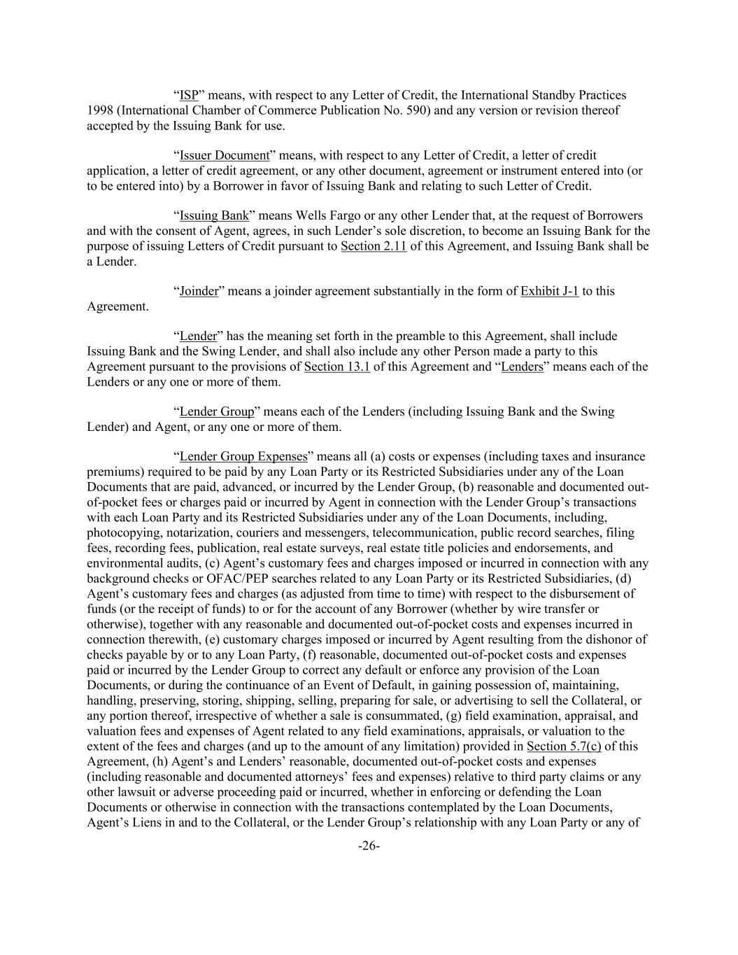-26- “ISP” means, with respect to any Letter of Credit, the International Standby Practices 1998 (International Chamber of Commerce Publication No. 590) and any version or revision thereof accepted by the Issuing Bank for use. “Issuer Document” means, with respect to any Letter of Credit, a letter of credit application, a letter of credit agreement, or any other document, agreement or instrument entered into (or to be entered into) by a Borrower in favor of Issuing Bank and relating to such Letter of Credit. “Issuing Bank” means Wells Fargo or any other Lender that, at the request of Borrowers and with the consent of Agent, agrees, in such Lender’s sole discretion, to become an Issuing Bank for the purpose of issuing Letters of Credit pursuant to Section 2.11 of this Agreement, and Issuing Bank shall be a Lender. “Joinder” means a joinder agreement substantially in the form of Exhibit J-1 to this Agreement. “Lender” has the meaning set forth in the preamble to this Agreement, shall include Issuing Bank and the Swing Lender, and shall also include any other Person made a party to this Agreement pursuant to the provisions of Section 13.1 of this Agreement and “Lenders” means each of the Lenders or any one or more of them. “Lender Group” means each of the Lenders (including Issuing Bank and the Swing Lender) and Agent, or any one or more of them. “Lender Group Expenses” means all (a) costs or expenses (including taxes and insurance premiums) required to be paid by any Loan Party or its Restricted Subsidiaries under any of the Loan Documents that are paid, advanced, or incurred by the Lender Group, (b) reasonable and documented out- of-pocket fees or charges paid or incurred by Agent in connection with the Lender Group’s transactions with each Loan Party and its Restricted Subsidiaries under any of the Loan Documents, including, photocopying, notarization, couriers and messengers, telecommunication, public record searches, filing fees, recording fees, publication, real estate surveys, real estate title policies and endorsements, and environmental audits, (c) Agent’s customary fees and charges imposed or incurred in connection with any background checks or OFAC/PEP searches related to any Loan Party or its Restricted Subsidiaries, (d) Agent’s customary fees and charges (as adjusted from time to time) with respect to the disbursement of funds (or the receipt of funds) to or for the account of any Borrower (whether by wire transfer or otherwise), together with any reasonable and documented out-of-pocket costs and expenses incurred in connection therewith, (e) customary charges imposed or incurred by Agent resulting from the dishonor of checks payable by or to any Loan Party, (f) reasonable, documented out-of-pocket costs and expenses paid or incurred by the Lender Group to correct any default or enforce any provision of the Loan Documents, or during the continuance of an Event of Default, in gaining possession of, maintaining, handling, preserving, storing, shipping, selling, preparing for sale, or advertising to sell the Collateral, or any portion thereof, irrespective of whether a sale is consummated, (g) field examination, appraisal, and valuation fees and expenses of Agent related to any field examinations, appraisals, or valuation to the extent of the fees and charges (and up to the amount of any limitation) provided in Section 5.7(c) of this Agreement, (h) Agent’s and Lenders’ reasonable, documented out-of-pocket costs and expenses (including reasonable and documented attorneys’ fees and expenses) relative to third party claims or any other lawsuit or adverse proceeding paid or incurred, whether in enforcing or defending the Loan Documents or otherwise in connection with the transactions contemplated by the Loan Documents, Agent’s Liens in and to the Collateral, or the Lender Group’s relationship with any Loan Party or any of