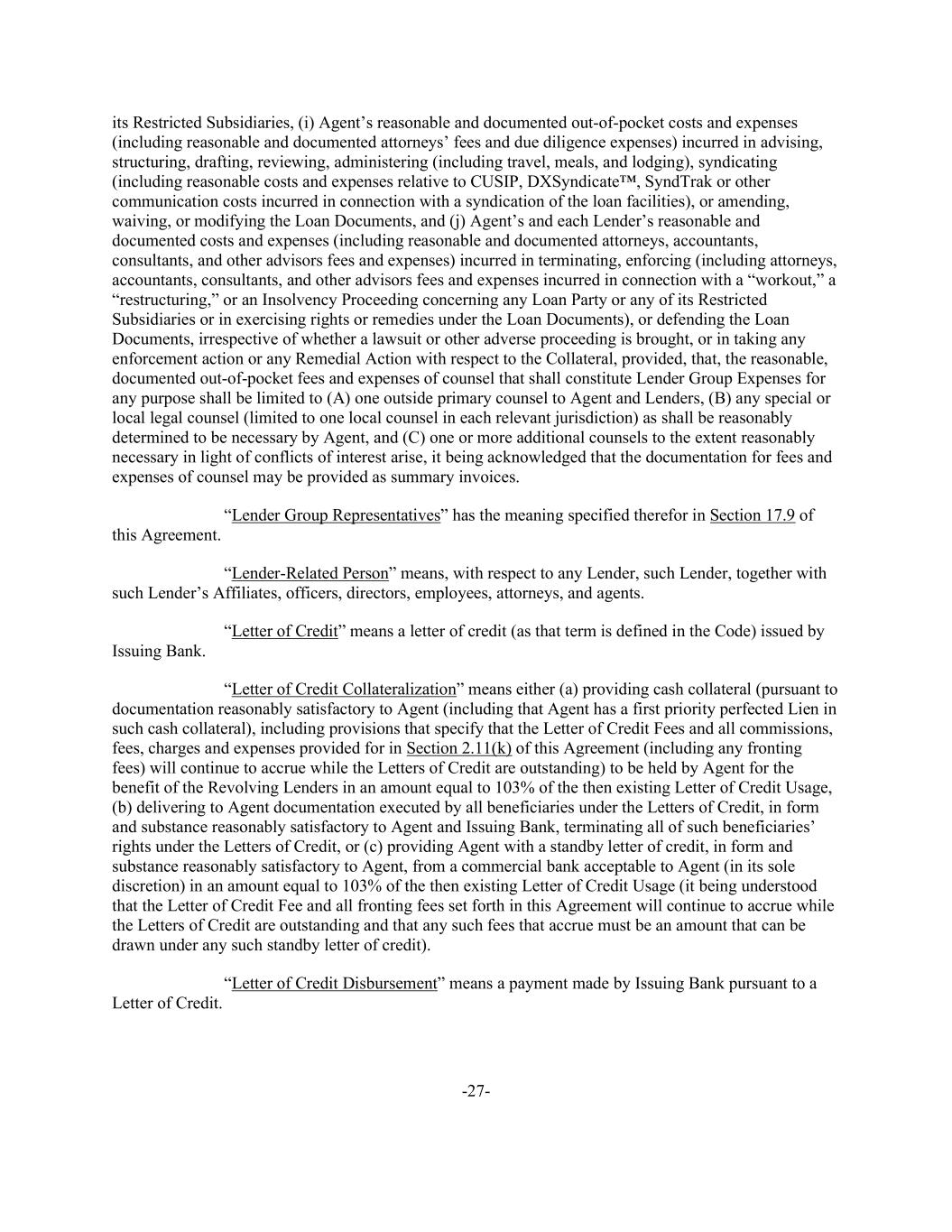 -27- its Restricted Subsidiaries, (i) Agent’s reasonable and documented out-of-pocket costs and expenses (including reasonable and documented attorneys’ fees and due diligence expenses) incurred in advising, structuring, drafting, reviewing, administering (including travel, meals, and lodging), syndicating (including reasonable costs and expenses relative to CUSIP, DXSyndicate™, SyndTrak or other communication costs incurred in connection with a syndication of the loan facilities), or amending, waiving, or modifying the Loan Documents, and (j) Agent’s and each Lender’s reasonable and documented costs and expenses (including reasonable and documented attorneys, accountants, consultants, and other advisors fees and expenses) incurred in terminating, enforcing (including attorneys, accountants, consultants, and other advisors fees and expenses incurred in connection with a “workout,” a “restructuring,” or an Insolvency Proceeding concerning any Loan Party or any of its Restricted Subsidiaries or in exercising rights or remedies under the Loan Documents), or defending the Loan Documents, irrespective of whether a lawsuit or other adverse proceeding is brought, or in taking any enforcement action or any Remedial Action with respect to the Collateral, provided, that, the reasonable, documented out-of-pocket fees and expenses of counsel that shall constitute Lender Group Expenses for any purpose shall be limited to (A) one outside primary counsel to Agent and Lenders, (B) any special or local legal counsel (limited to one local counsel in each relevant jurisdiction) as shall be reasonably determined to be necessary by Agent, and (C) one or more additional counsels to the extent reasonably necessary in light of conflicts of interest arise, it being acknowledged that the documentation for fees and expenses of counsel may be provided as summary invoices. “Lender Group Representatives” has the meaning specified therefor in Section 17.9 of this Agreement. “Lender-Related Person” means, with respect to any Lender, such Lender, together with such Lender’s Affiliates, officers, directors, employees, attorneys, and agents. “Letter of Credit” means a letter of credit (as that term is defined in the Code) issued by Issuing Bank. “Letter of Credit Collateralization” means either (a) providing cash collateral (pursuant to documentation reasonably satisfactory to Agent (including that Agent has a first priority perfected Lien in such cash collateral), including provisions that specify that the Letter of Credit Fees and all commissions, fees, charges and expenses provided for in Section 2.11(k) of this Agreement (including any fronting fees) will continue to accrue while the Letters of Credit are outstanding) to be held by Agent for the benefit of the Revolving Lenders in an amount equal to 103% of the then existing Letter of Credit Usage, (b) delivering to Agent documentation executed by all beneficiaries under the Letters of Credit, in form and substance reasonably satisfactory to Agent and Issuing Bank, terminating all of such beneficiaries’ rights under the Letters of Credit, or (c) providing Agent with a standby letter of credit, in form and substance reasonably satisfactory to Agent, from a commercial bank acceptable to Agent (in its sole discretion) in an amount equal to 103% of the then existing Letter of Credit Usage (it being understood that the Letter of Credit Fee and all fronting fees set forth in this Agreement will continue to accrue while the Letters of Credit are outstanding and that any such fees that accrue must be an amount that can be drawn under any such standby letter of credit). “Letter of Credit Disbursement” means a payment made by Issuing Bank pursuant to a Letter of Credit.