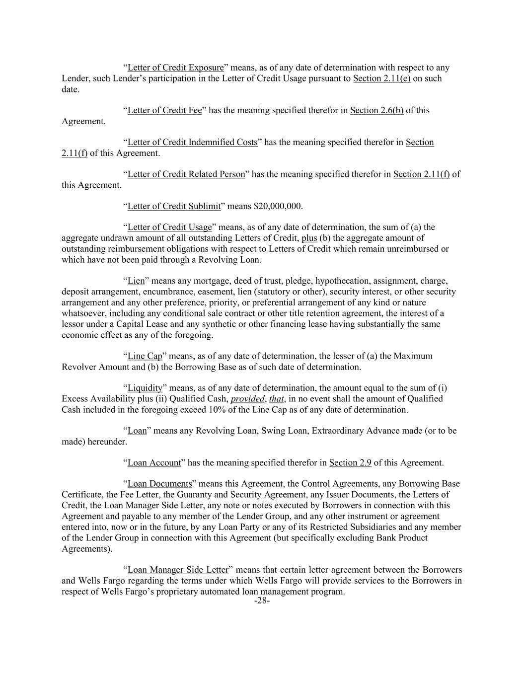 -28- “Letter of Credit Exposure” means, as of any date of determination with respect to any Lender, such Lender’s participation in the Letter of Credit Usage pursuant to Section 2.11(e) on such date. “Letter of Credit Fee” has the meaning specified therefor in Section 2.6(b) of this Agreement. “Letter of Credit Indemnified Costs” has the meaning specified therefor in Section 2.11(f) of this Agreement. “Letter of Credit Related Person” has the meaning specified therefor in Section 2.11(f) of this Agreement. “Letter of Credit Sublimit” means $20,000,000. “Letter of Credit Usage” means, as of any date of determination, the sum of (a) the aggregate undrawn amount of all outstanding Letters of Credit, plus (b) the aggregate amount of outstanding reimbursement obligations with respect to Letters of Credit which remain unreimbursed or which have not been paid through a Revolving Loan. “Lien” means any mortgage, deed of trust, pledge, hypothecation, assignment, charge, deposit arrangement, encumbrance, easement, lien (statutory or other), security interest, or other security arrangement and any other preference, priority, or preferential arrangement of any kind or nature whatsoever, including any conditional sale contract or other title retention agreement, the interest of a lessor under a Capital Lease and any synthetic or other financing lease having substantially the same economic effect as any of the foregoing. “Line Cap” means, as of any date of determination, the lesser of (a) the Maximum Revolver Amount and (b) the Borrowing Base as of such date of determination. “Liquidity” means, as of any date of determination, the amount equal to the sum of (i) Excess Availability plus (ii) Qualified Cash, provided, that, in no event shall the amount of Qualified Cash included in the foregoing exceed 10% of the Line Cap as of any date of determination. “Loan” means any Revolving Loan, Swing Loan, Extraordinary Advance made (or to be made) hereunder. “Loan Account” has the meaning specified therefor in Section 2.9 of this Agreement. “Loan Documents” means this Agreement, the Control Agreements, any Borrowing Base Certificate, the Fee Letter, the Guaranty and Security Agreement, any Issuer Documents, the Letters of Credit, the Loan Manager Side Letter, any note or notes executed by Borrowers in connection with this Agreement and payable to any member of the Lender Group, and any other instrument or agreement entered into, now or in the future, by any Loan Party or any of its Restricted Subsidiaries and any member of the Lender Group in connection with this Agreement (but specifically excluding Bank Product Agreements). “Loan Manager Side Letter” means that certain letter agreement between the Borrowers and Wells Fargo regarding the terms under which Wells Fargo will provide services to the Borrowers in respect of Wells Fargo’s proprietary automated loan management program.