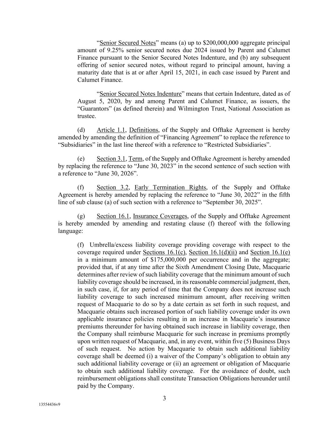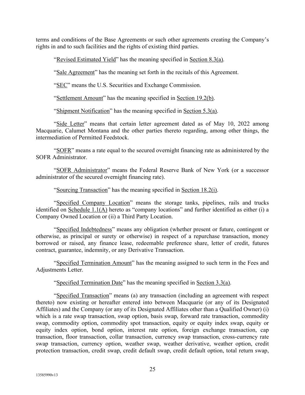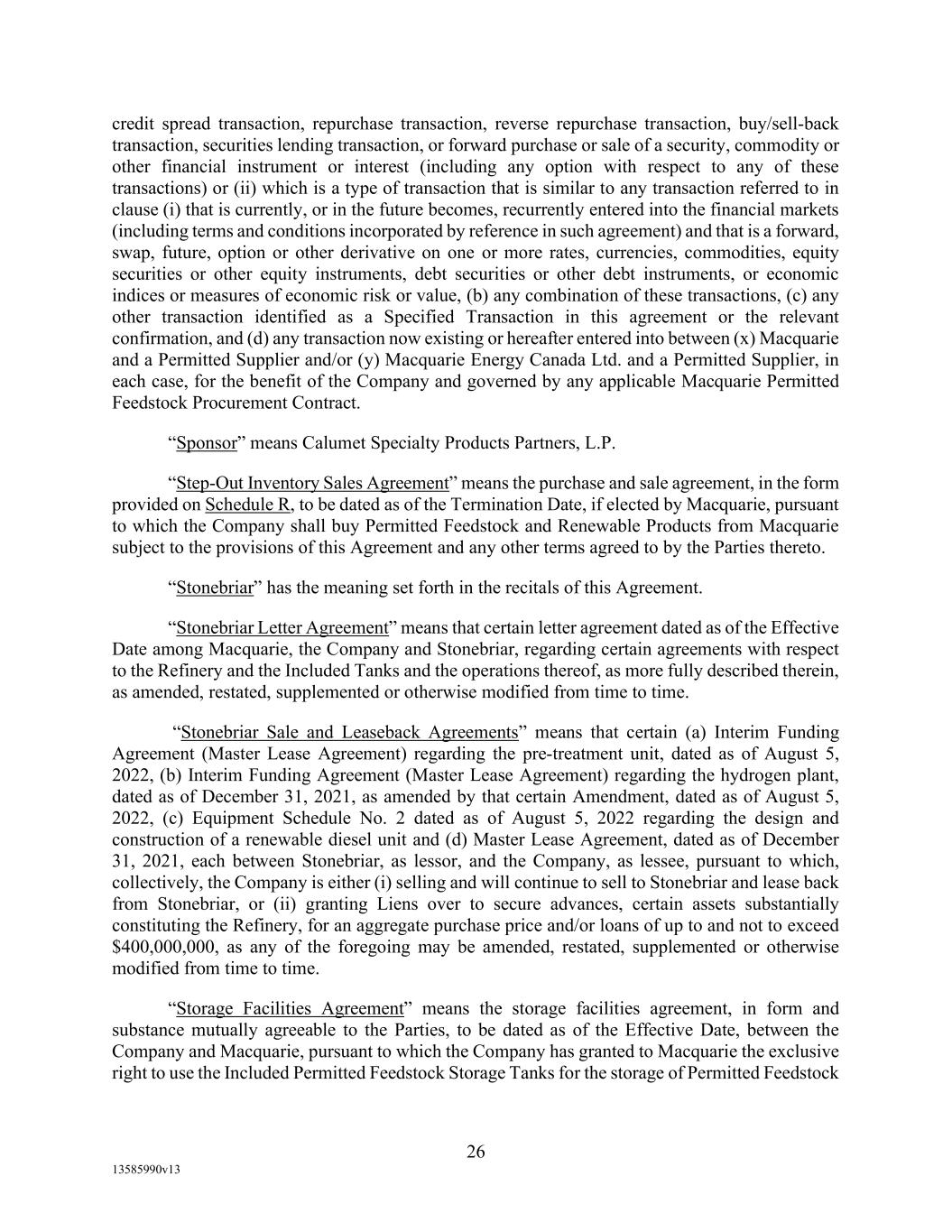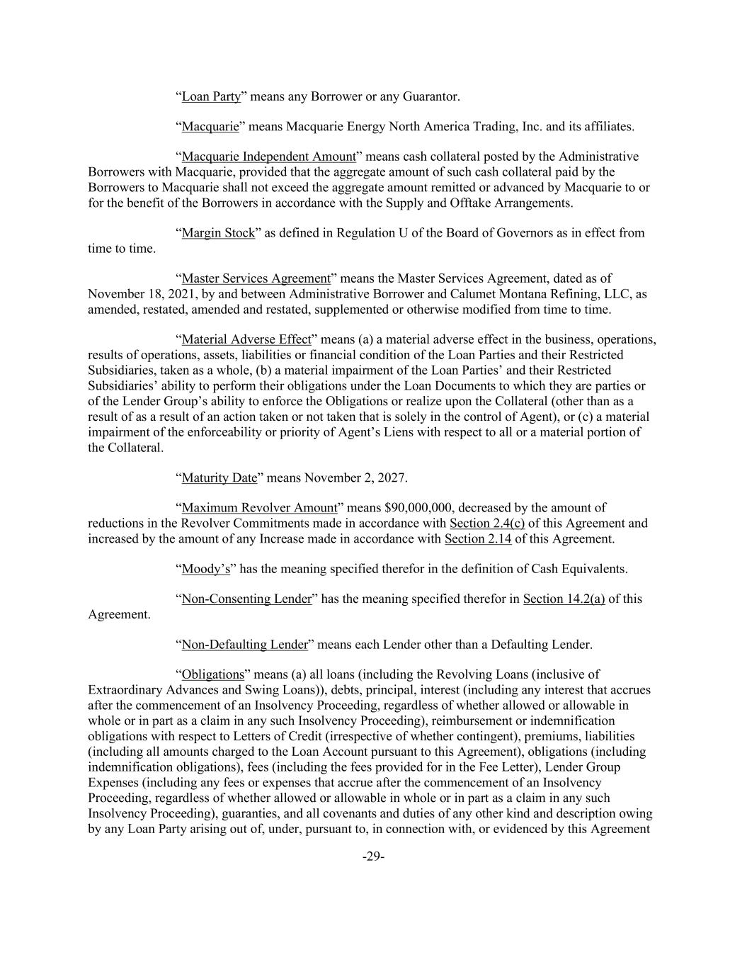 -29- “Loan Party” means any Borrower or any Guarantor. “Macquarie” means Macquarie Energy North America Trading, Inc. and its affiliates. “Macquarie Independent Amount” means cash collateral posted by the Administrative Borrowers with Macquarie, provided that the aggregate amount of such cash collateral paid by the Borrowers to Macquarie shall not exceed the aggregate amount remitted or advanced by Macquarie to or for the benefit of the Borrowers in accordance with the Supply and Offtake Arrangements. “Margin Stock” as defined in Regulation U of the Board of Governors as in effect from time to time. “Master Services Agreement” means the Master Services Agreement, dated as of November 18, 2021, by and between Administrative Borrower and Calumet Montana Refining, LLC, as amended, restated, amended and restated, supplemented or otherwise modified from time to time. “Material Adverse Effect” means (a) a material adverse effect in the business, operations, results of operations, assets, liabilities or financial condition of the Loan Parties and their Restricted Subsidiaries, taken as a whole, (b) a material impairment of the Loan Parties’ and their Restricted Subsidiaries’ ability to perform their obligations under the Loan Documents to which they are parties or of the Lender Group’s ability to enforce the Obligations or realize upon the Collateral (other than as a result of as a result of an action taken or not taken that is solely in the control of Agent), or (c) a material impairment of the enforceability or priority of Agent’s Liens with respect to all or a material portion of the Collateral. “Maturity Date” means November 2, 2027. “Maximum Revolver Amount” means $90,000,000, decreased by the amount of reductions in the Revolver Commitments made in accordance with Section 2.4(c) of this Agreement and increased by the amount of any Increase made in accordance with Section 2.14 of this Agreement. “Moody’s” has the meaning specified therefor in the definition of Cash Equivalents. “Non-Consenting Lender” has the meaning specified therefor in Section 14.2(a) of this Agreement. “Non-Defaulting Lender” means each Lender other than a Defaulting Lender. “Obligations” means (a) all loans (including the Revolving Loans (inclusive of Extraordinary Advances and Swing Loans)), debts, principal, interest (including any interest that accrues after the commencement of an Insolvency Proceeding, regardless of whether allowed or allowable in whole or in part as a claim in any such Insolvency Proceeding), reimbursement or indemnification obligations with respect to Letters of Credit (irrespective of whether contingent), premiums, liabilities (including all amounts charged to the Loan Account pursuant to this Agreement), obligations (including indemnification obligations), fees (including the fees provided for in the Fee Letter), Lender Group Expenses (including any fees or expenses that accrue after the commencement of an Insolvency Proceeding, regardless of whether allowed or allowable in whole or in part as a claim in any such Insolvency Proceeding), guaranties, and all covenants and duties of any other kind and description owing by any Loan Party arising out of, under, pursuant to, in connection with, or evidenced by this Agreement