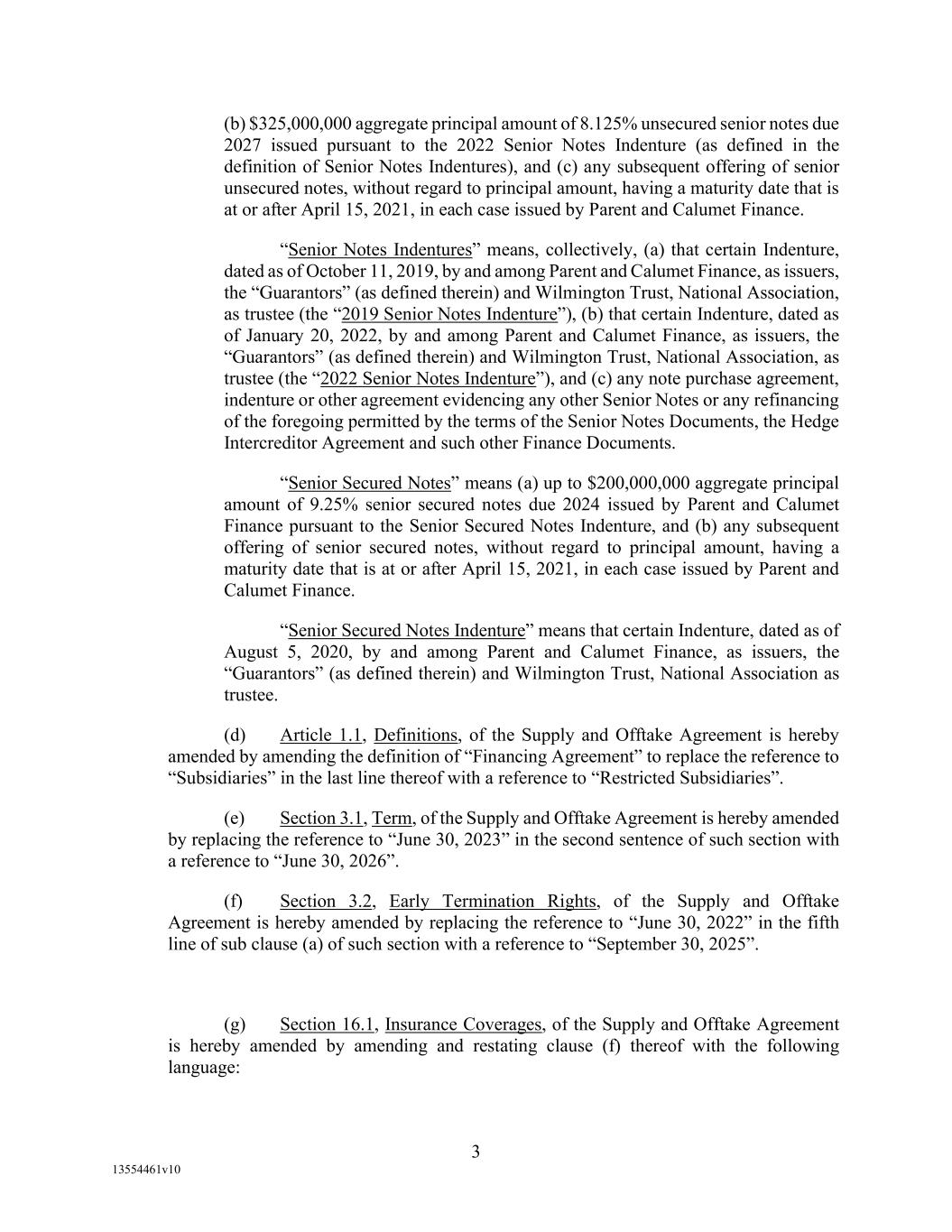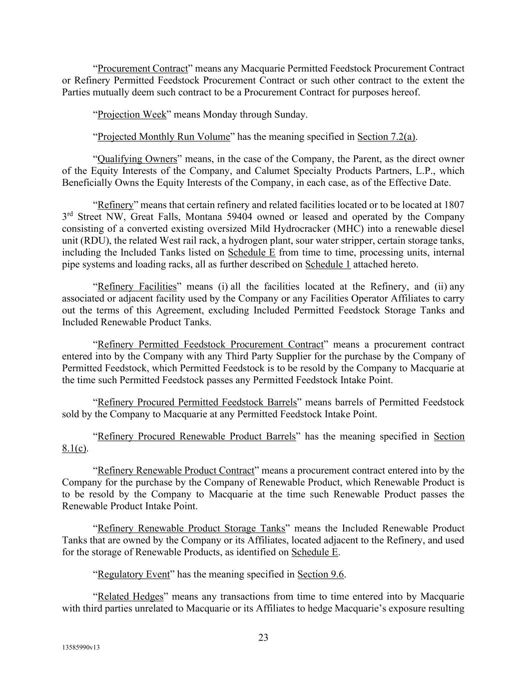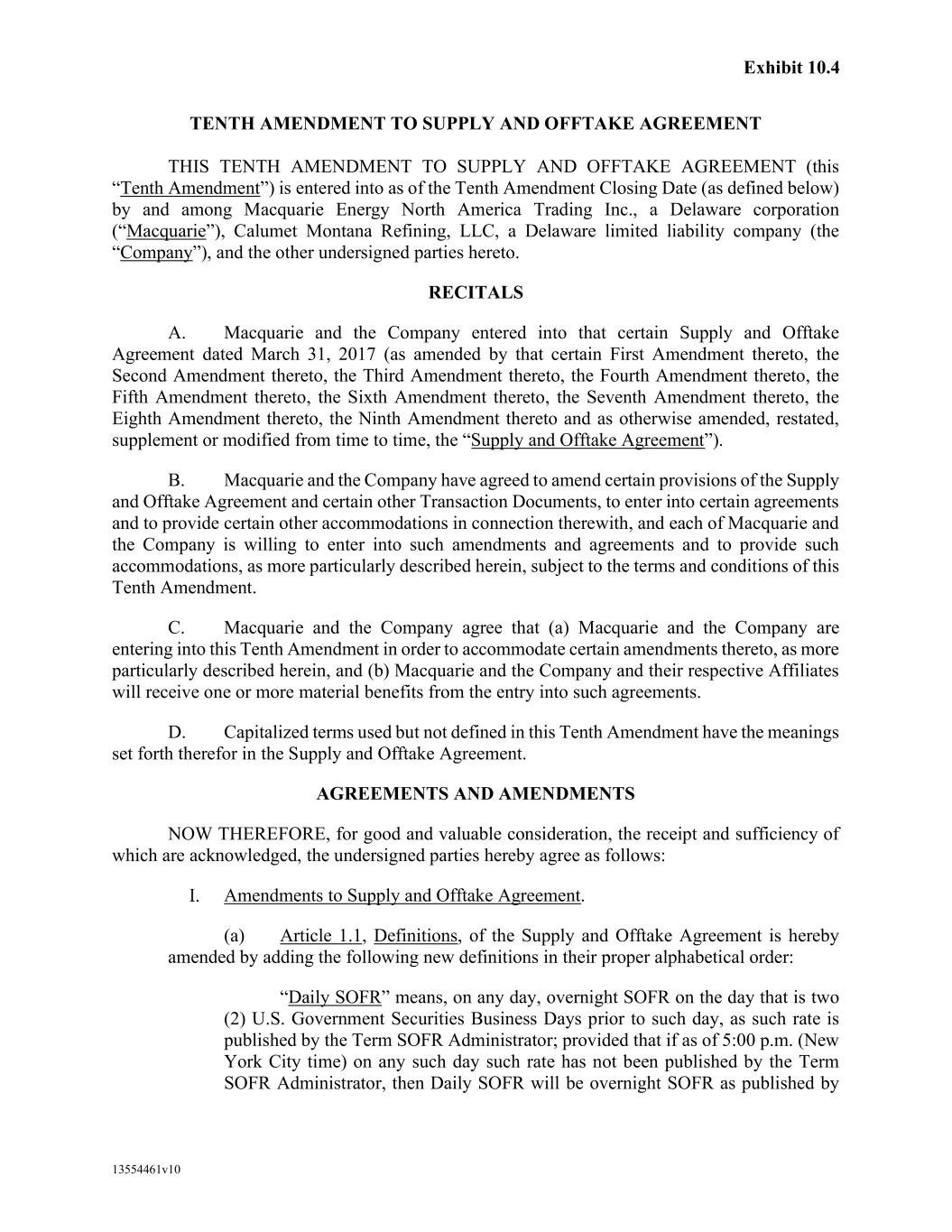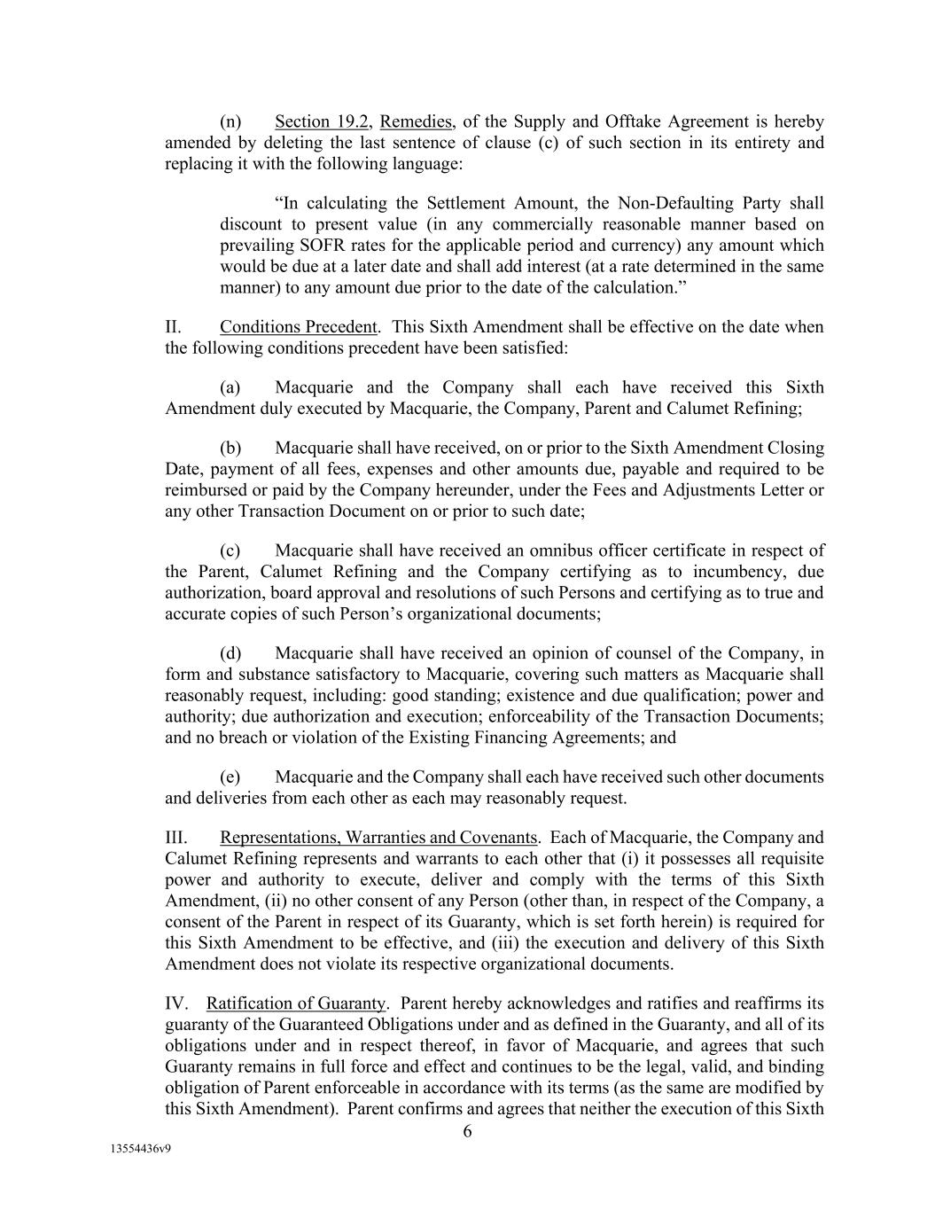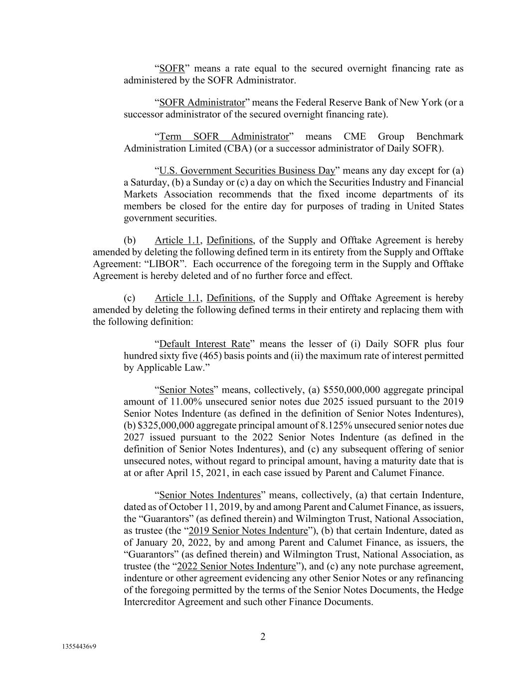 -29- “Loan Party” means any Borrower or any Guarantor. “Macquarie” means Macquarie Energy North America Trading, Inc. and its affiliates. “Macquarie Independent Amount” means cash collateral posted by the Administrative Borrowers with Macquarie, provided that the aggregate amount of such cash collateral paid by the Borrowers to Macquarie shall not exceed the aggregate amount remitted or advanced by Macquarie to or for the benefit of the Borrowers in accordance with the Supply and Offtake Arrangements. “Margin Stock” as defined in Regulation U of the Board of Governors as in effect from time to time. “Master Services Agreement” means the Master Services Agreement, dated as of November 18, 2021, by and between Administrative Borrower and Calumet Montana Refining, LLC, as amended, restated, amended and restated, supplemented or otherwise modified from time to time. “Material Adverse Effect” means (a) a material adverse effect in the business, operations, results of operations, assets, liabilities or financial condition of the Loan Parties and their Restricted Subsidiaries, taken as a whole, (b) a material impairment of the Loan Parties’ and their Restricted Subsidiaries’ ability to perform their obligations under the Loan Documents to which they are parties or of the Lender Group’s ability to enforce the Obligations or realize upon the Collateral (other than as a result of as a result of an action taken or not taken that is solely in the control of Agent), or (c) a material impairment of the enforceability or priority of Agent’s Liens with respect to all or a material portion of the Collateral. “Maturity Date” means November 2, 2027. “Maximum Revolver Amount” means $90,000,000, decreased by the amount of reductions in the Revolver Commitments made in accordance with Section 2.4(c) of this Agreement and increased by the amount of any Increase made in accordance with Section 2.14 of this Agreement. “Moody’s” has the meaning specified therefor in the definition of Cash Equivalents. “Non-Consenting Lender” has the meaning specified therefor in Section 14.2(a) of this Agreement. “Non-Defaulting Lender” means each Lender other than a Defaulting Lender. “Obligations” means (a) all loans (including the Revolving Loans (inclusive of Extraordinary Advances and Swing Loans)), debts, principal, interest (including any interest that accrues after the commencement of an Insolvency Proceeding, regardless of whether allowed or allowable in whole or in part as a claim in any such Insolvency Proceeding), reimbursement or indemnification obligations with respect to Letters of Credit (irrespective of whether contingent), premiums, liabilities (including all amounts charged to the Loan Account pursuant to this Agreement), obligations (including indemnification obligations), fees (including the fees provided for in the Fee Letter), Lender Group Expenses (including any fees or expenses that accrue after the commencement of an Insolvency Proceeding, regardless of whether allowed or allowable in whole or in part as a claim in any such Insolvency Proceeding), guaranties, and all covenants and duties of any other kind and description owing by any Loan Party arising out of, under, pursuant to, in connection with, or evidenced by this Agreement