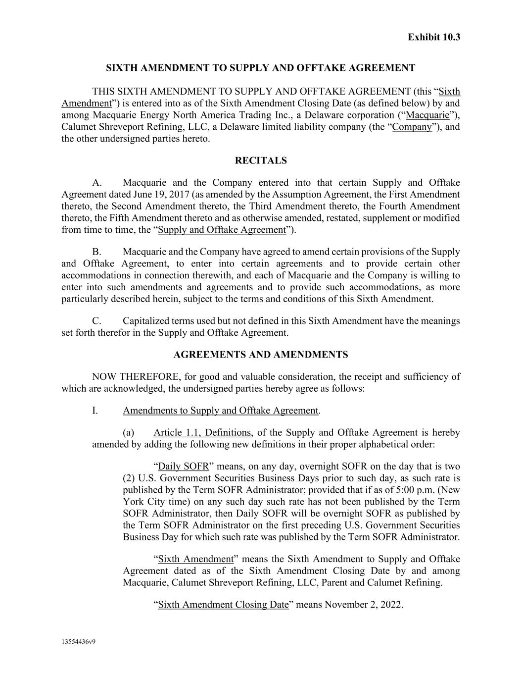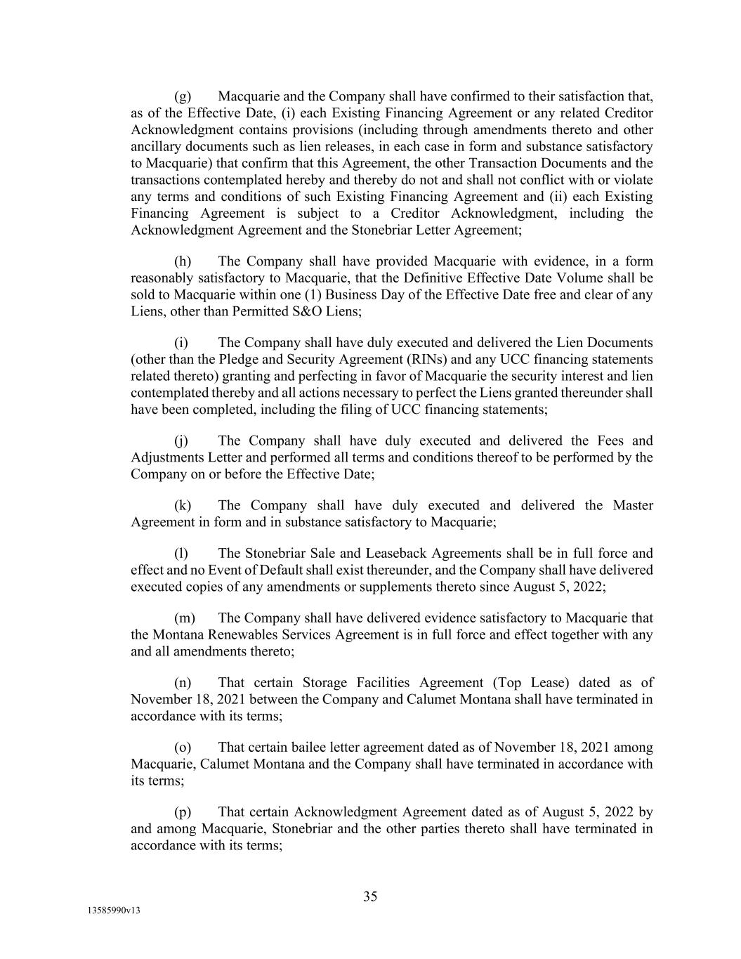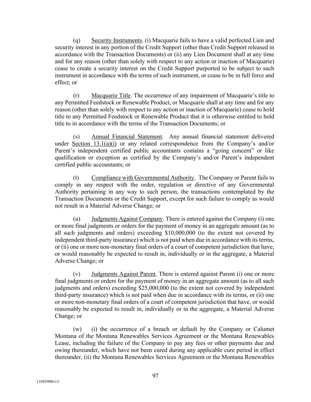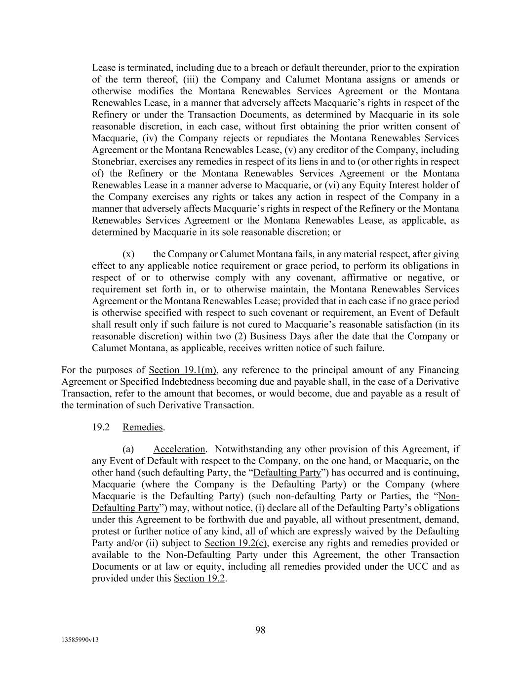 -29- “Loan Party” means any Borrower or any Guarantor. “Macquarie” means Macquarie Energy North America Trading, Inc. and its affiliates. “Macquarie Independent Amount” means cash collateral posted by the Administrative Borrowers with Macquarie, provided that the aggregate amount of such cash collateral paid by the Borrowers to Macquarie shall not exceed the aggregate amount remitted or advanced by Macquarie to or for the benefit of the Borrowers in accordance with the Supply and Offtake Arrangements. “Margin Stock” as defined in Regulation U of the Board of Governors as in effect from time to time. “Master Services Agreement” means the Master Services Agreement, dated as of November 18, 2021, by and between Administrative Borrower and Calumet Montana Refining, LLC, as amended, restated, amended and restated, supplemented or otherwise modified from time to time. “Material Adverse Effect” means (a) a material adverse effect in the business, operations, results of operations, assets, liabilities or financial condition of the Loan Parties and their Restricted Subsidiaries, taken as a whole, (b) a material impairment of the Loan Parties’ and their Restricted Subsidiaries’ ability to perform their obligations under the Loan Documents to which they are parties or of the Lender Group’s ability to enforce the Obligations or realize upon the Collateral (other than as a result of as a result of an action taken or not taken that is solely in the control of Agent), or (c) a material impairment of the enforceability or priority of Agent’s Liens with respect to all or a material portion of the Collateral. “Maturity Date” means November 2, 2027. “Maximum Revolver Amount” means $90,000,000, decreased by the amount of reductions in the Revolver Commitments made in accordance with Section 2.4(c) of this Agreement and increased by the amount of any Increase made in accordance with Section 2.14 of this Agreement. “Moody’s” has the meaning specified therefor in the definition of Cash Equivalents. “Non-Consenting Lender” has the meaning specified therefor in Section 14.2(a) of this Agreement. “Non-Defaulting Lender” means each Lender other than a Defaulting Lender. “Obligations” means (a) all loans (including the Revolving Loans (inclusive of Extraordinary Advances and Swing Loans)), debts, principal, interest (including any interest that accrues after the commencement of an Insolvency Proceeding, regardless of whether allowed or allowable in whole or in part as a claim in any such Insolvency Proceeding), reimbursement or indemnification obligations with respect to Letters of Credit (irrespective of whether contingent), premiums, liabilities (including all amounts charged to the Loan Account pursuant to this Agreement), obligations (including indemnification obligations), fees (including the fees provided for in the Fee Letter), Lender Group Expenses (including any fees or expenses that accrue after the commencement of an Insolvency Proceeding, regardless of whether allowed or allowable in whole or in part as a claim in any such Insolvency Proceeding), guaranties, and all covenants and duties of any other kind and description owing by any Loan Party arising out of, under, pursuant to, in connection with, or evidenced by this Agreement