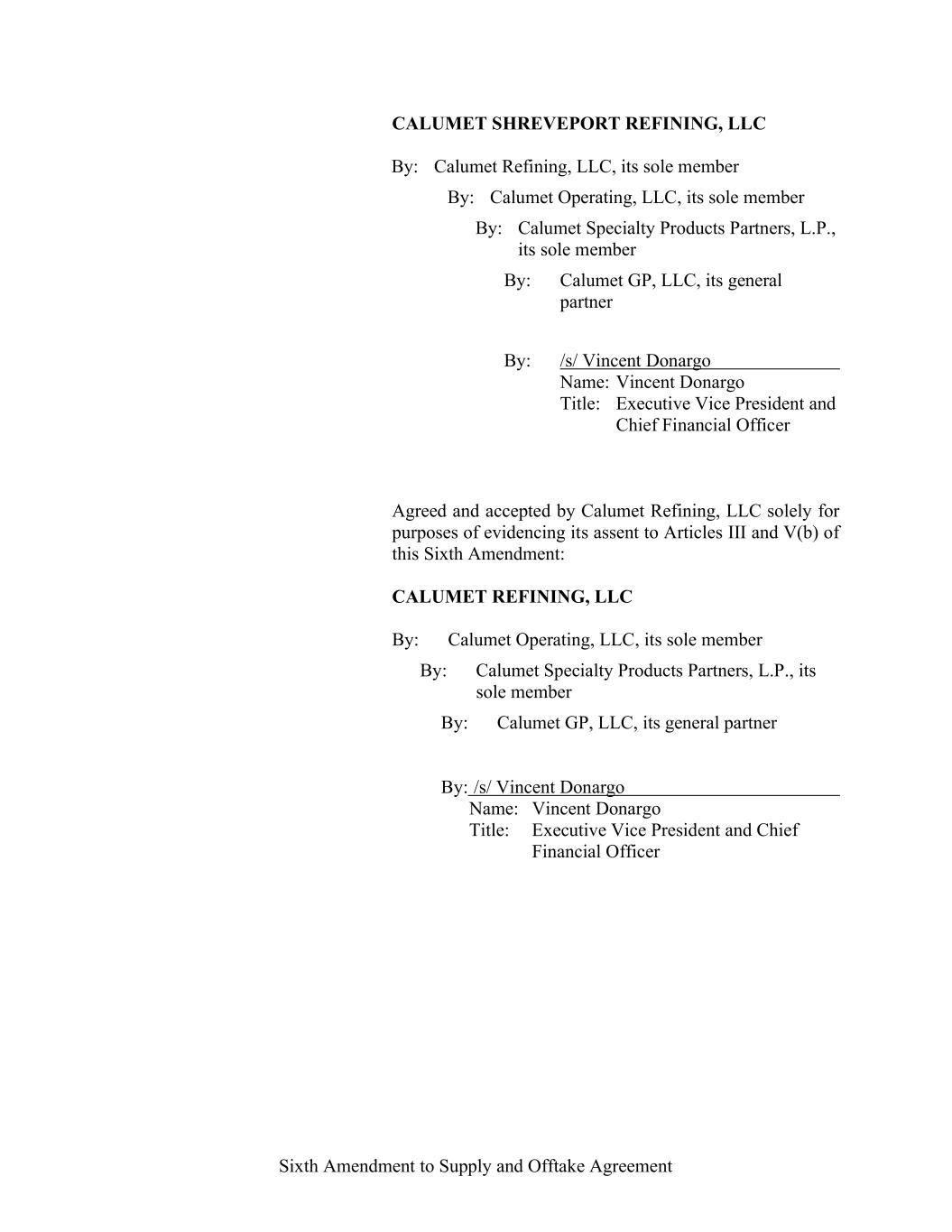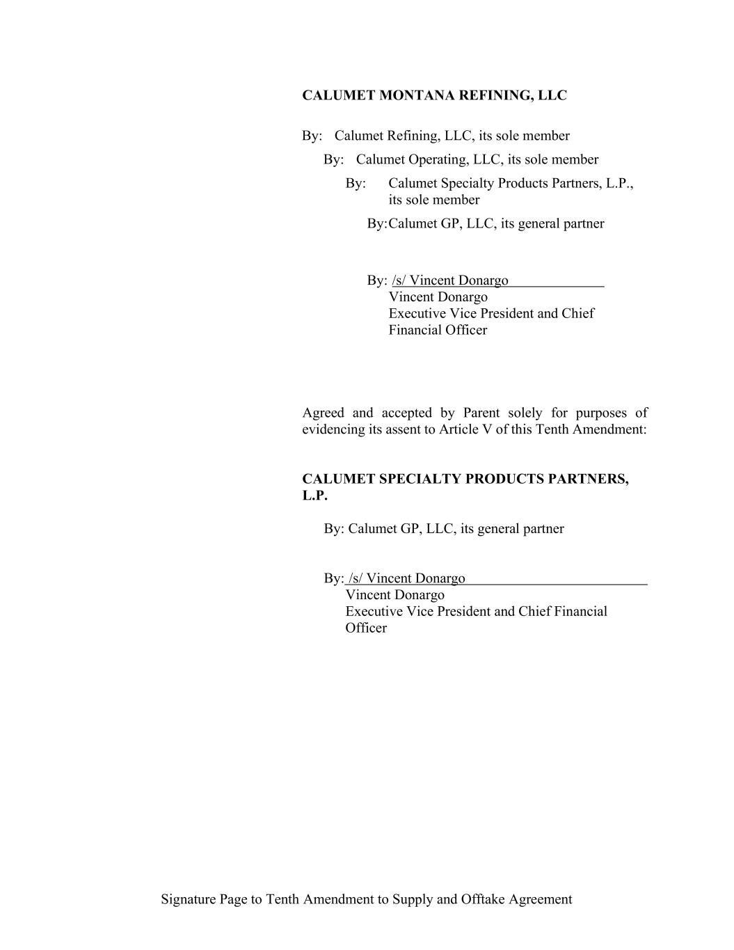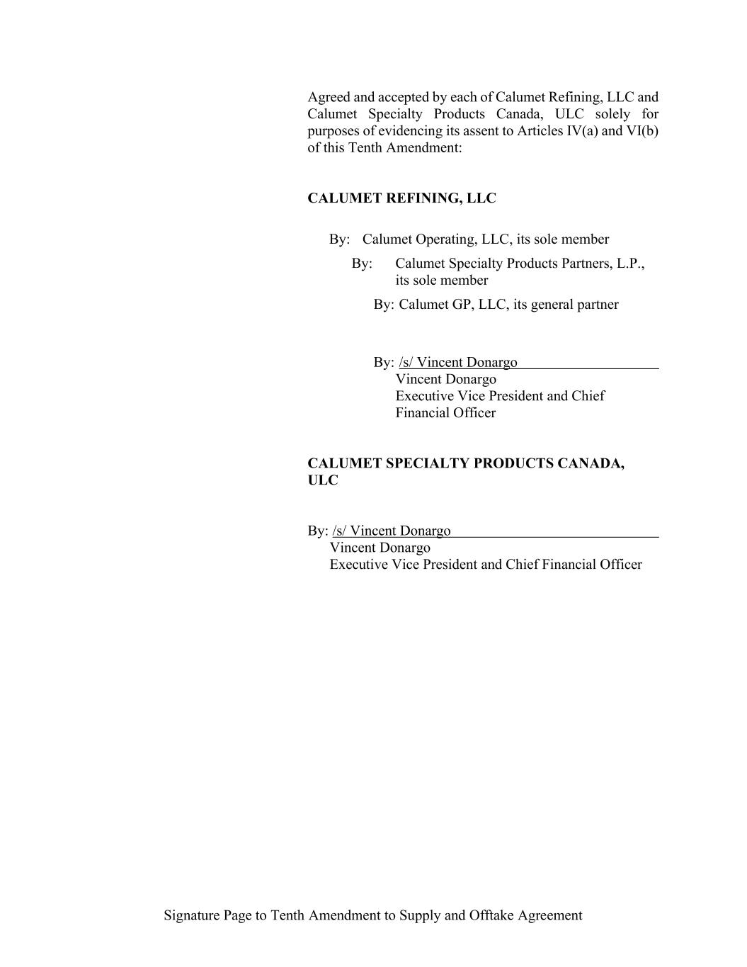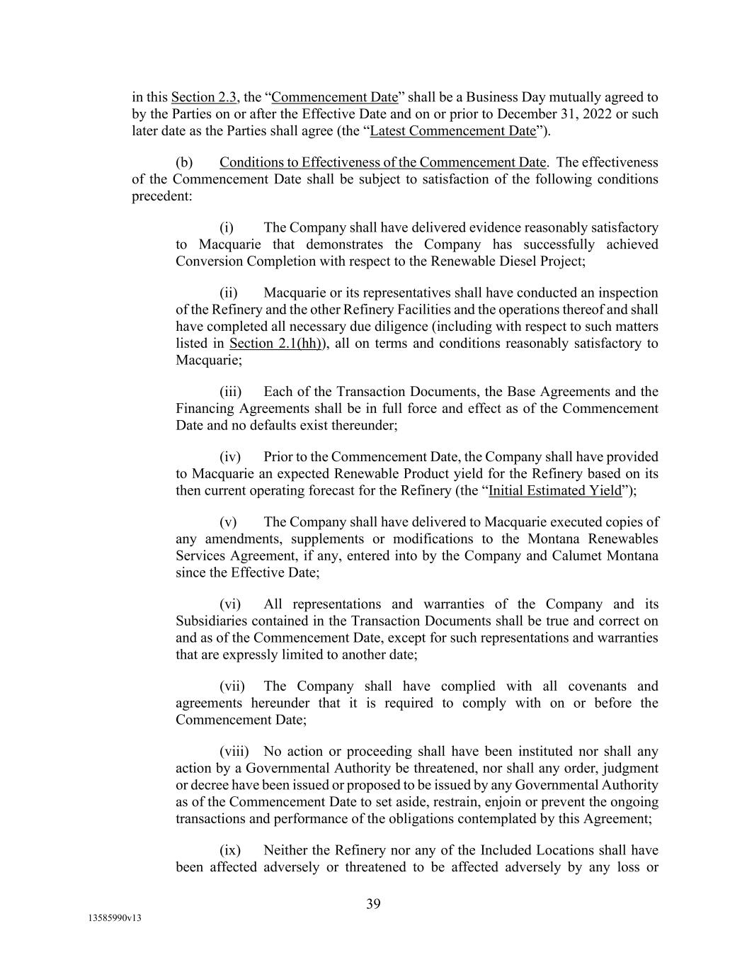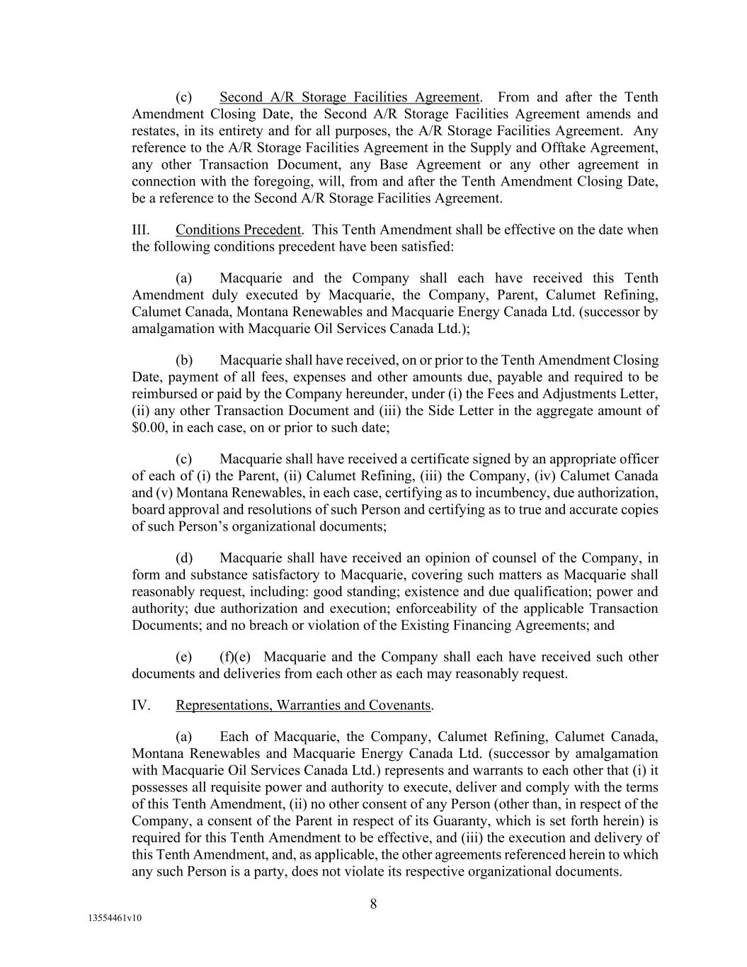 -29- “Loan Party” means any Borrower or any Guarantor. “Macquarie” means Macquarie Energy North America Trading, Inc. and its affiliates. “Macquarie Independent Amount” means cash collateral posted by the Administrative Borrowers with Macquarie, provided that the aggregate amount of such cash collateral paid by the Borrowers to Macquarie shall not exceed the aggregate amount remitted or advanced by Macquarie to or for the benefit of the Borrowers in accordance with the Supply and Offtake Arrangements. “Margin Stock” as defined in Regulation U of the Board of Governors as in effect from time to time. “Master Services Agreement” means the Master Services Agreement, dated as of November 18, 2021, by and between Administrative Borrower and Calumet Montana Refining, LLC, as amended, restated, amended and restated, supplemented or otherwise modified from time to time. “Material Adverse Effect” means (a) a material adverse effect in the business, operations, results of operations, assets, liabilities or financial condition of the Loan Parties and their Restricted Subsidiaries, taken as a whole, (b) a material impairment of the Loan Parties’ and their Restricted Subsidiaries’ ability to perform their obligations under the Loan Documents to which they are parties or of the Lender Group’s ability to enforce the Obligations or realize upon the Collateral (other than as a result of as a result of an action taken or not taken that is solely in the control of Agent), or (c) a material impairment of the enforceability or priority of Agent’s Liens with respect to all or a material portion of the Collateral. “Maturity Date” means November 2, 2027. “Maximum Revolver Amount” means $90,000,000, decreased by the amount of reductions in the Revolver Commitments made in accordance with Section 2.4(c) of this Agreement and increased by the amount of any Increase made in accordance with Section 2.14 of this Agreement. “Moody’s” has the meaning specified therefor in the definition of Cash Equivalents. “Non-Consenting Lender” has the meaning specified therefor in Section 14.2(a) of this Agreement. “Non-Defaulting Lender” means each Lender other than a Defaulting Lender. “Obligations” means (a) all loans (including the Revolving Loans (inclusive of Extraordinary Advances and Swing Loans)), debts, principal, interest (including any interest that accrues after the commencement of an Insolvency Proceeding, regardless of whether allowed or allowable in whole or in part as a claim in any such Insolvency Proceeding), reimbursement or indemnification obligations with respect to Letters of Credit (irrespective of whether contingent), premiums, liabilities (including all amounts charged to the Loan Account pursuant to this Agreement), obligations (including indemnification obligations), fees (including the fees provided for in the Fee Letter), Lender Group Expenses (including any fees or expenses that accrue after the commencement of an Insolvency Proceeding, regardless of whether allowed or allowable in whole or in part as a claim in any such Insolvency Proceeding), guaranties, and all covenants and duties of any other kind and description owing by any Loan Party arising out of, under, pursuant to, in connection with, or evidenced by this Agreement