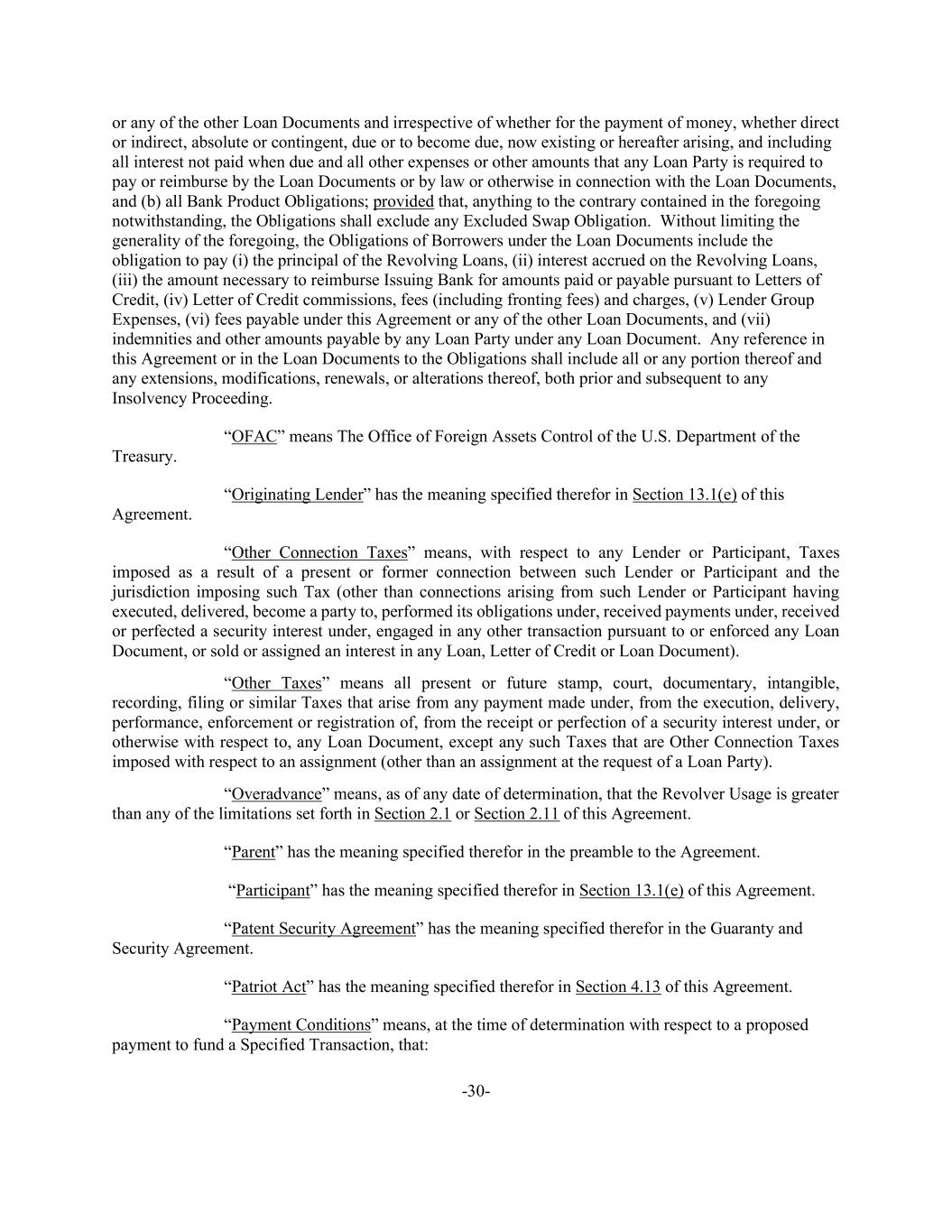 -30- or any of the other Loan Documents and irrespective of whether for the payment of money, whether direct or indirect, absolute or contingent, due or to become due, now existing or hereafter arising, and including all interest not paid when due and all other expenses or other amounts that any Loan Party is required to pay or reimburse by the Loan Documents or by law or otherwise in connection with the Loan Documents, and (b) all Bank Product Obligations; provided that, anything to the contrary contained in the foregoing notwithstanding, the Obligations shall exclude any Excluded Swap Obligation. Without limiting the generality of the foregoing, the Obligations of Borrowers under the Loan Documents include the obligation to pay (i) the principal of the Revolving Loans, (ii) interest accrued on the Revolving Loans, (iii) the amount necessary to reimburse Issuing Bank for amounts paid or payable pursuant to Letters of Credit, (iv) Letter of Credit commissions, fees (including fronting fees) and charges, (v) Lender Group Expenses, (vi) fees payable under this Agreement or any of the other Loan Documents, and (vii) indemnities and other amounts payable by any Loan Party under any Loan Document. Any reference in this Agreement or in the Loan Documents to the Obligations shall include all or any portion thereof and any extensions, modifications, renewals, or alterations thereof, both prior and subsequent to any Insolvency Proceeding. “OFAC” means The Office of Foreign Assets Control of the U.S. Department of the Treasury. “Originating Lender” has the meaning specified therefor in Section 13.1(e) of this Agreement. “Other Connection Taxes” means, with respect to any Lender or Participant, Taxes imposed as a result of a present or former connection between such Lender or Participant and the jurisdiction imposing such Tax (other than connections arising from such Lender or Participant having executed, delivered, become a party to, performed its obligations under, received payments under, received or perfected a security interest under, engaged in any other transaction pursuant to or enforced any Loan Document, or sold or assigned an interest in any Loan, Letter of Credit or Loan Document). “Other Taxes” means all present or future stamp, court, documentary, intangible, recording, filing or similar Taxes that arise from any payment made under, from the execution, delivery, performance, enforcement or registration of, from the receipt or perfection of a security interest under, or otherwise with respect to, any Loan Document, except any such Taxes that are Other Connection Taxes imposed with respect to an assignment (other than an assignment at the request of a Loan Party). “Overadvance” means, as of any date of determination, that the Revolver Usage is greater than any of the limitations set forth in Section 2.1 or Section 2.11 of this Agreement. “Parent” has the meaning specified therefor in the preamble to the Agreement. “Participant” has the meaning specified therefor in Section 13.1(e) of this Agreement. “Patent Security Agreement” has the meaning specified therefor in the Guaranty and Security Agreement. “Patriot Act” has the meaning specified therefor in Section 4.13 of this Agreement. “Payment Conditions” means, at the time of determination with respect to a proposed payment to fund a Specified Transaction, that: