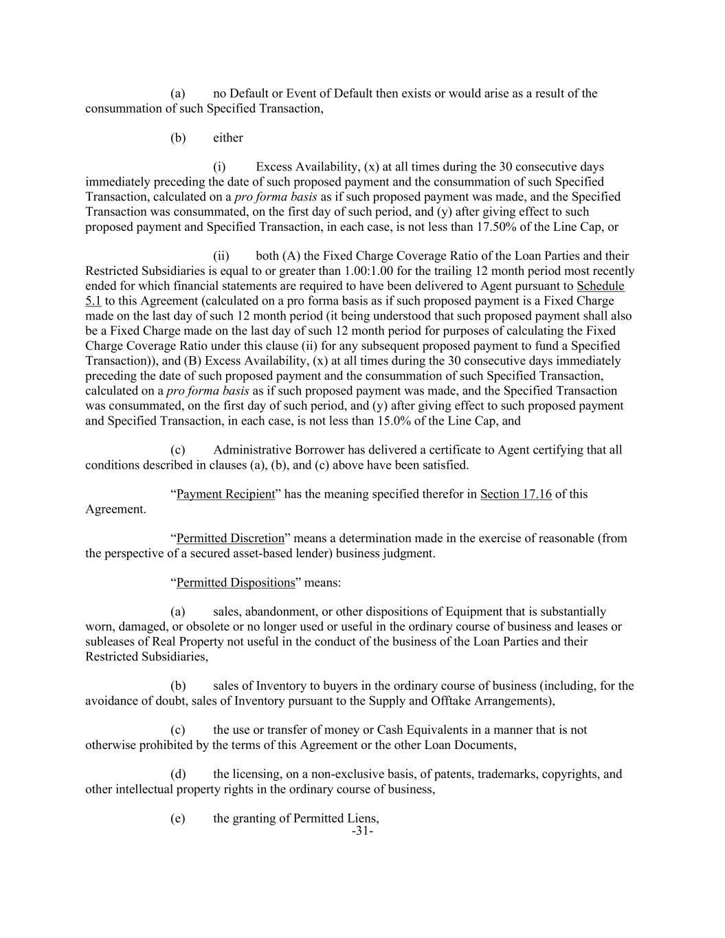 -31- (a) no Default or Event of Default then exists or would arise as a result of the consummation of such Specified Transaction, (b) either (i) Excess Availability, (x) at all times during the 30 consecutive days immediately preceding the date of such proposed payment and the consummation of such Specified Transaction, calculated on a pro forma basis as if such proposed payment was made, and the Specified Transaction was consummated, on the first day of such period, and (y) after giving effect to such proposed payment and Specified Transaction, in each case, is not less than 17.50% of the Line Cap, or (ii) both (A) the Fixed Charge Coverage Ratio of the Loan Parties and their Restricted Subsidiaries is equal to or greater than 1.00:1.00 for the trailing 12 month period most recently ended for which financial statements are required to have been delivered to Agent pursuant to Schedule 5.1 to this Agreement (calculated on a pro forma basis as if such proposed payment is a Fixed Charge made on the last day of such 12 month period (it being understood that such proposed payment shall also be a Fixed Charge made on the last day of such 12 month period for purposes of calculating the Fixed Charge Coverage Ratio under this clause (ii) for any subsequent proposed payment to fund a Specified Transaction)), and (B) Excess Availability, (x) at all times during the 30 consecutive days immediately preceding the date of such proposed payment and the consummation of such Specified Transaction, calculated on a pro forma basis as if such proposed payment was made, and the Specified Transaction was consummated, on the first day of such period, and (y) after giving effect to such proposed payment and Specified Transaction, in each case, is not less than 15.0% of the Line Cap, and (c) Administrative Borrower has delivered a certificate to Agent certifying that all conditions described in clauses (a), (b), and (c) above have been satisfied. “Payment Recipient” has the meaning specified therefor in Section 17.16 of this Agreement. “Permitted Discretion” means a determination made in the exercise of reasonable (from the perspective of a secured asset-based lender) business judgment. “Permitted Dispositions” means: (a) sales, abandonment, or other dispositions of Equipment that is substantially worn, damaged, or obsolete or no longer used or useful in the ordinary course of business and leases or subleases of Real Property not useful in the conduct of the business of the Loan Parties and their Restricted Subsidiaries, (b) sales of Inventory to buyers in the ordinary course of business (including, for the avoidance of doubt, sales of Inventory pursuant to the Supply and Offtake Arrangements), (c) the use or transfer of money or Cash Equivalents in a manner that is not otherwise prohibited by the terms of this Agreement or the other Loan Documents, (d) the licensing, on a non-exclusive basis, of patents, trademarks, copyrights, and other intellectual property rights in the ordinary course of business, (e) the granting of Permitted Liens,